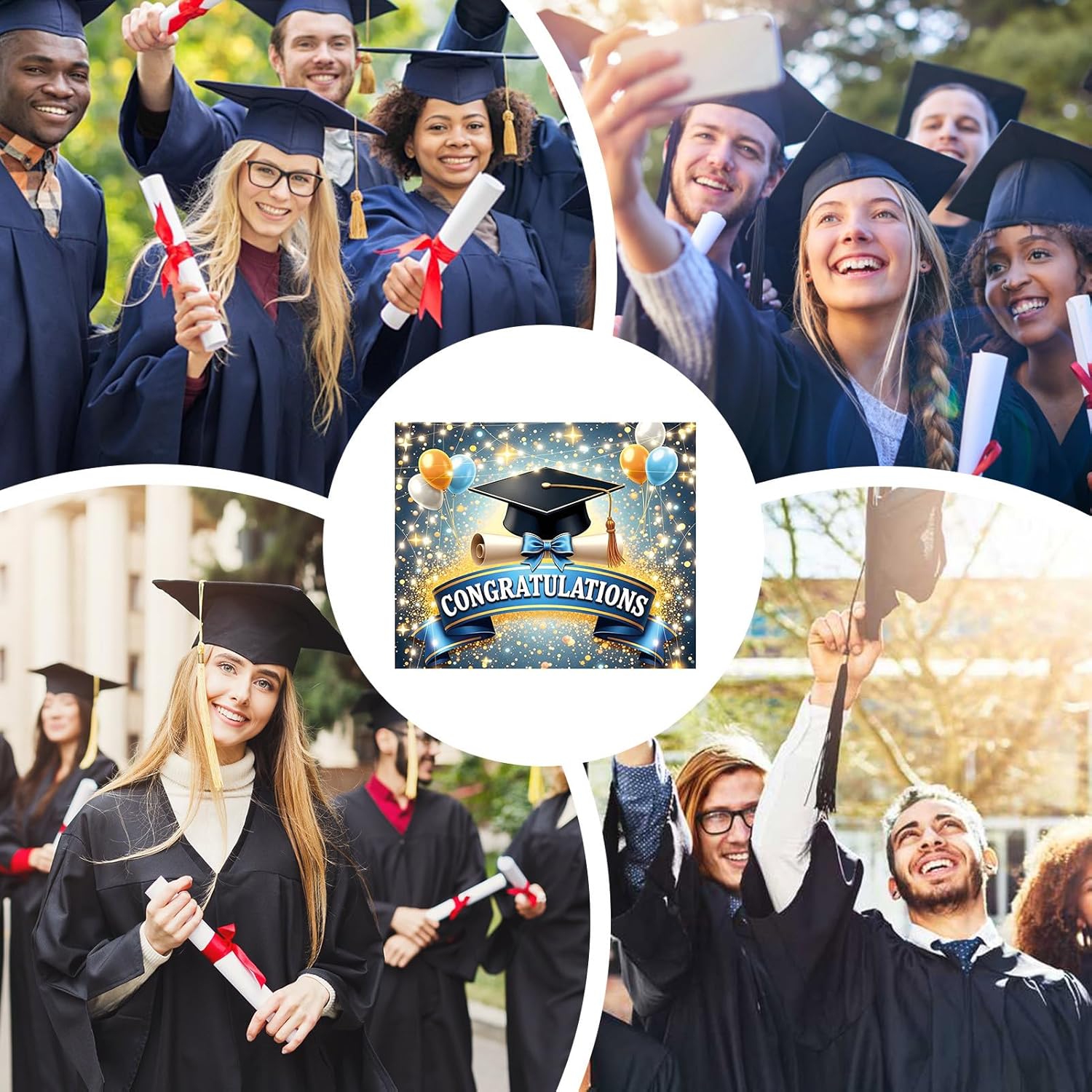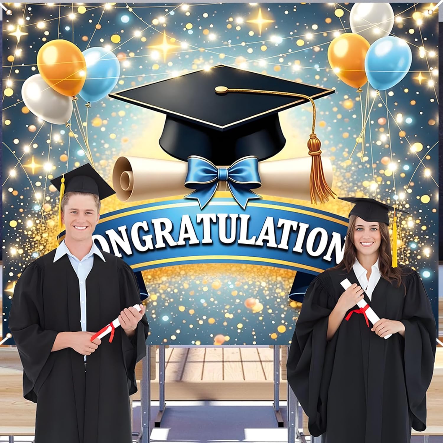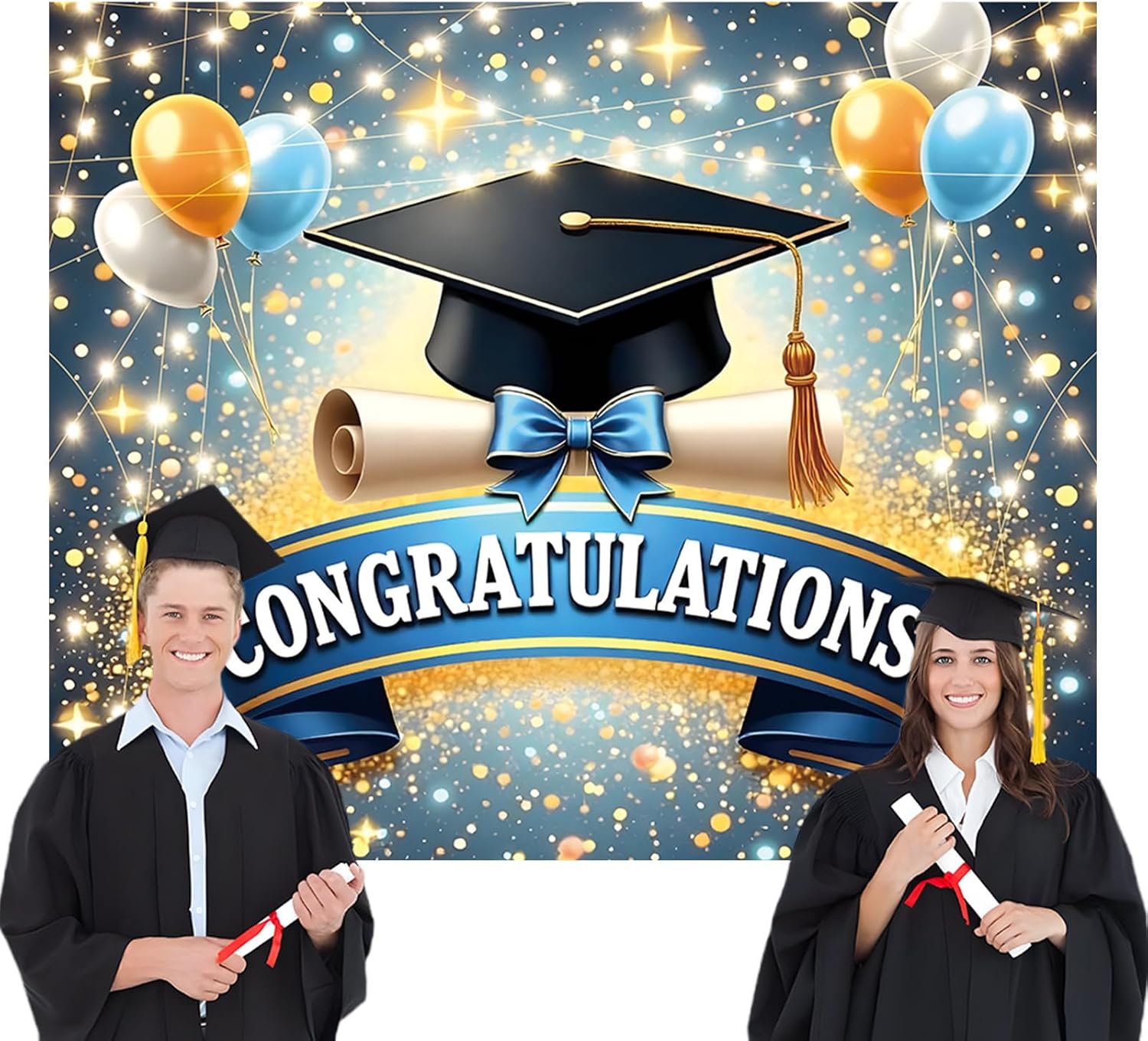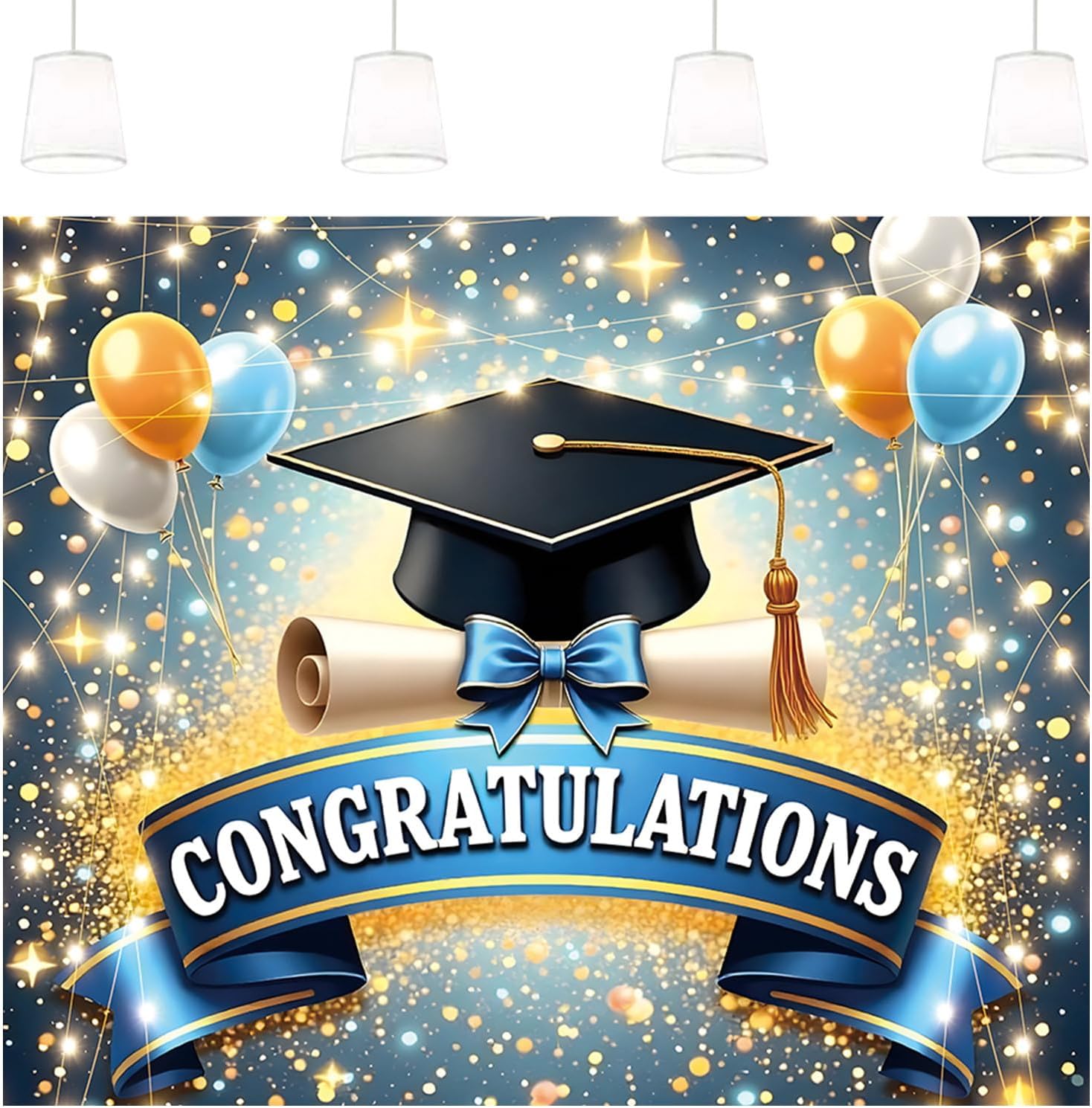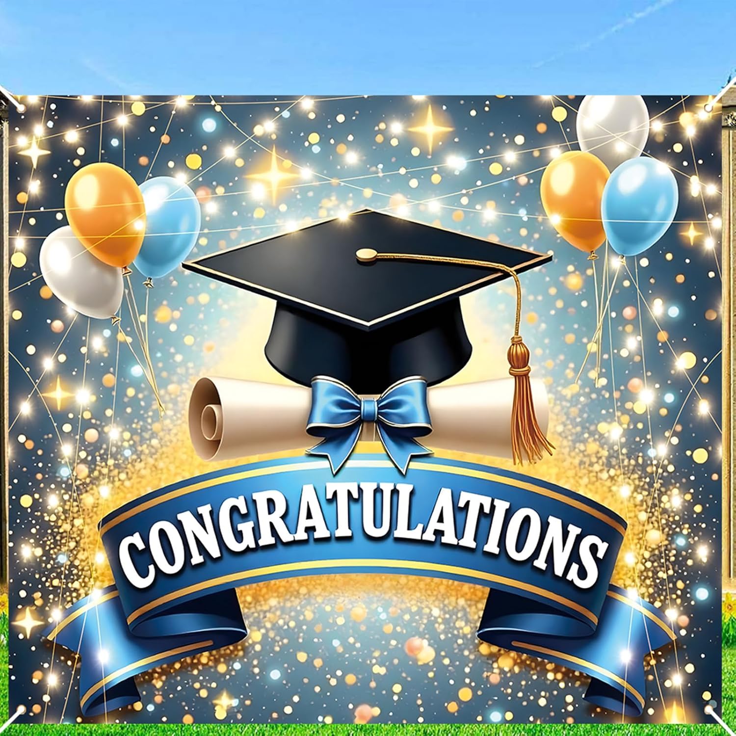 Celebrate graduation milestones with this stylish photo booth backdrop featuring “Congratulations” lettering in bold gold, perfect for capturing memories at high school or college parties Made from lightweight, tear-resistant polyester fabric, this party background is easy to indoors or outdoors using built-in grommets, ideal for decorating walls, fences, or backdrops The elegant black and gold design adds a festive touch to any graduation event, making it a standout decoration that doubles as a photo area for group shots and selfies Large format provides excellent visibility in photos and party settings, helping create a themed atmosphere while showing appreciation for the graduate’s accomplishments Easily foldable and reusable, this graduation decor prop can be stored and brought out for multiple celebrations or used as a keepsake from a special day honoring the graduate's achievements
