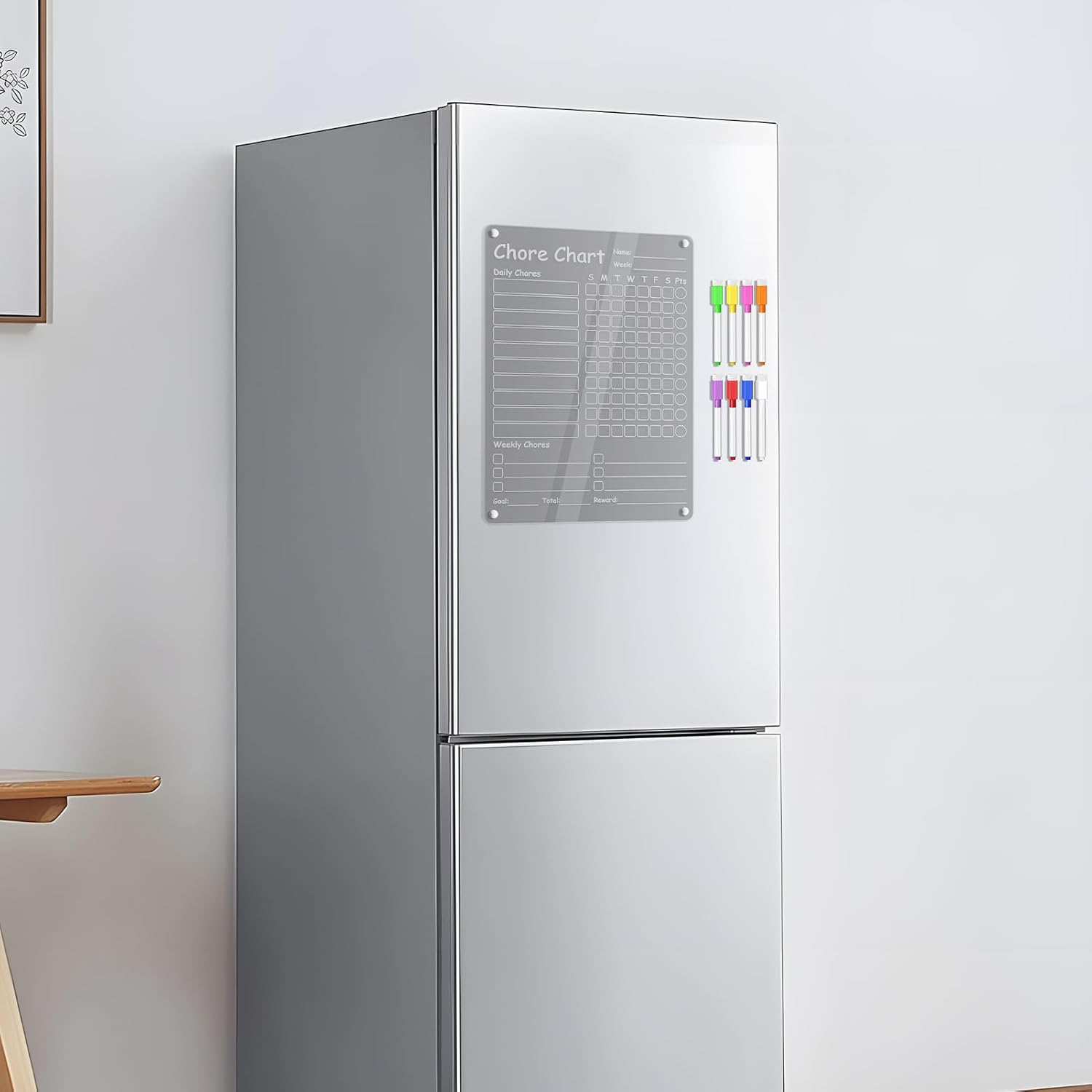 Posizionamento sicuro del frigorifero: progettato per adattarsi perfettamente alle porte standard del frigorifero, combina l'adsorbimento magnetico con un design antiscivolo, garantendo stabilità e prevenendo movimenti indesiderati su superfici lisce Lavorazione elaborata: utilizza materiale composito avanzato per garantire una buona finitura, eliminando i segni e preservando l'integrità del rivestimento del frigorifero per tutta la sua durata Design liscio e riutilizzabile: sperimenta una scrittura senza sforzo con otto pennarelli vivaci progettati con punte di precisione, completati da un robusto pannello opaco che consente una facile pulizia con un panno per mantenere il suo aspetto incontaminato nel tempo Soluzione interattiva per il lavoro: il divertente sistema di motivazione incoraggia la partecipazione dei bambini, con un tracciamento codificato a colori, lavagna visiva per attività quotidiane organizzate Perfetto come regalo: il grafico delle faccende in acrilico funge da regalo perfetto, con confezione festiva pronta per essere presentata e per l'uso domestico, migliorando l'organizzazione mentre diffonde gioia durante le occasioni speciali