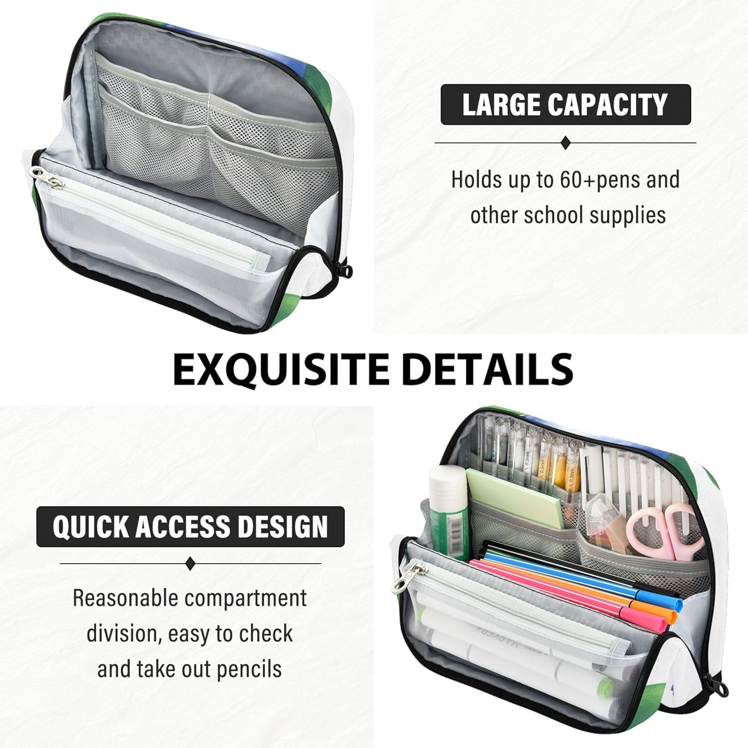Modalità di supporto da scrivania: trasforma la borsa per il trucco in un supporto compatto con una sola piega, risparmiando spazio e offrendo un facile accesso a tutti gli oggetti conservati durante l'uso Qualità che puoi sentire: il nylon resistente offre all'astuccio per ragazze adolescenti una struttura leggera ma resistente, mantenendo il contenuto al sicuro rendendo la pulizia semplice e senza problemi Layout intelligente per riporre: tieni le tue forniture in ordine: la graziosa custodia per matite include uno scomparto principale, una tasca in rete con cerniera e uno slot aperto per separare e accedere agli oggetti con facilità Multiuso: questo grazioso astuccio funziona come astuccio per penne, trucchi, kit da viaggio o organizer da ufficio, ideale per scuola, lavoro, gite e uso quotidiano Personalizzabile: con motivi vivaci e opzioni di foto o testo personalizzate, le borse per insegnanti diventano un regalo premuroso per studenti, creativi e viaggiatori frequenti