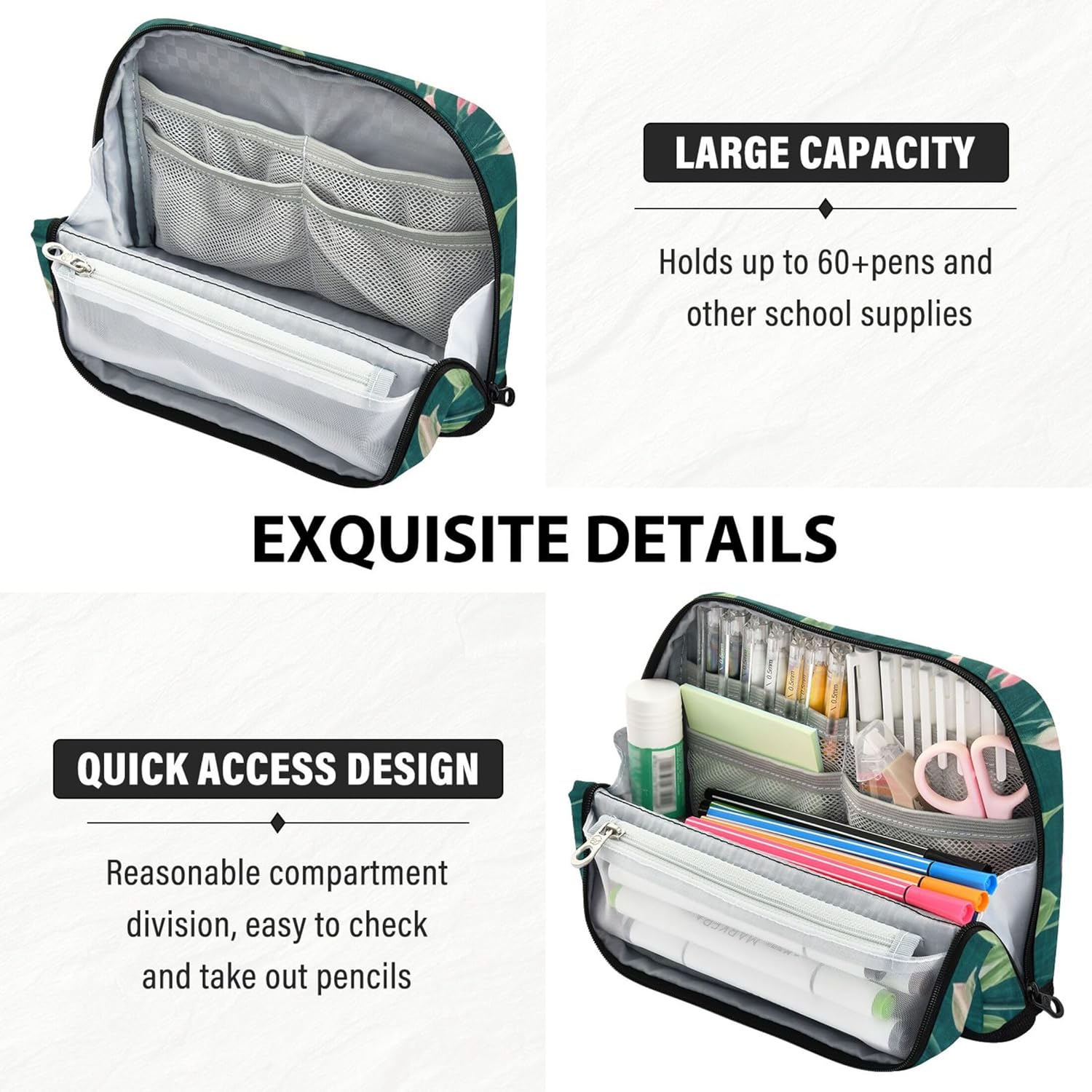 Innovativa base pieghevole: progettata per essere ripiegata e bloccata in posizione, le borse per matite diventano immediatamente un contenitore indipendente, ideali per organizzare le forniture mentre si lavora o si studia Resistente all'usura e lavabile: l'astuccio porta attrezzi è realizzato in nylon di poliestere di alta qualità che resiste a graffi e macchie, offrendo allo stesso tempo un facile lavaggio a mano per una freschezza a lungo termine Grande capienza: dispone di uno scomparto principale, una tasca in rete con cerniera e una tasca aperta per organizzare penne, matite, gomme, temperamatite e foglietti adesivi Multiuso: i sacchetti con cerniera per matite funzionano come astuccio per penne, astuccio per il trucco, kit da viaggio o organizer per ufficio, ideali per scuola, lavoro, gite e uso quotidiano Regalo premuroso e utile: con motivi accattivanti e design personalizzato, l'astuccio con cerniera diventa un regalo pratico ma sincero per qualsiasi età o stile di vita