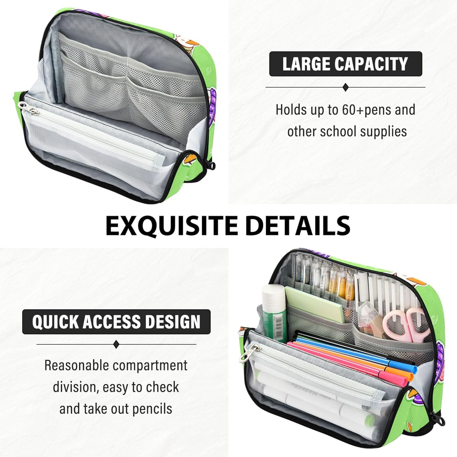 Modalità di supporto da scrivania: trasforma l'astuccio in un supporto compatto con una sola piega, risparmiando spazio e offrendo un facile accesso a tutti gli oggetti conservati durante l'uso Resistente all'usura e lavabile: gli astucci per matite sono realizzati in nylon di poliestere di alta qualità che resiste a graffi e macchie, offrendo allo stesso tempo un facile lavaggio a mano per una freschezza a lungo termine Layout intelligente per riporre: tieni le tue forniture in ordine: l'astuccio carino per ragazze include uno scomparto principale, una tasca in rete con cerniera e uno slot aperto per separare e accedere agli oggetti con facilità Adatto per varie impostazioni: utilizzare sacchetti con cerniera per riporre oggetti artistici, oggetti personali o strumenti da ufficio, ideali per studenti, pendolari, artisti o chiunque sia in viaggio Opzione regalo personalizzata: disponibile in stampe vivaci con testo personalizzabile o design fotografico, i sacchetti riutilizzabili per matite sono un regalo unico per bambini, artisti o viaggiatori