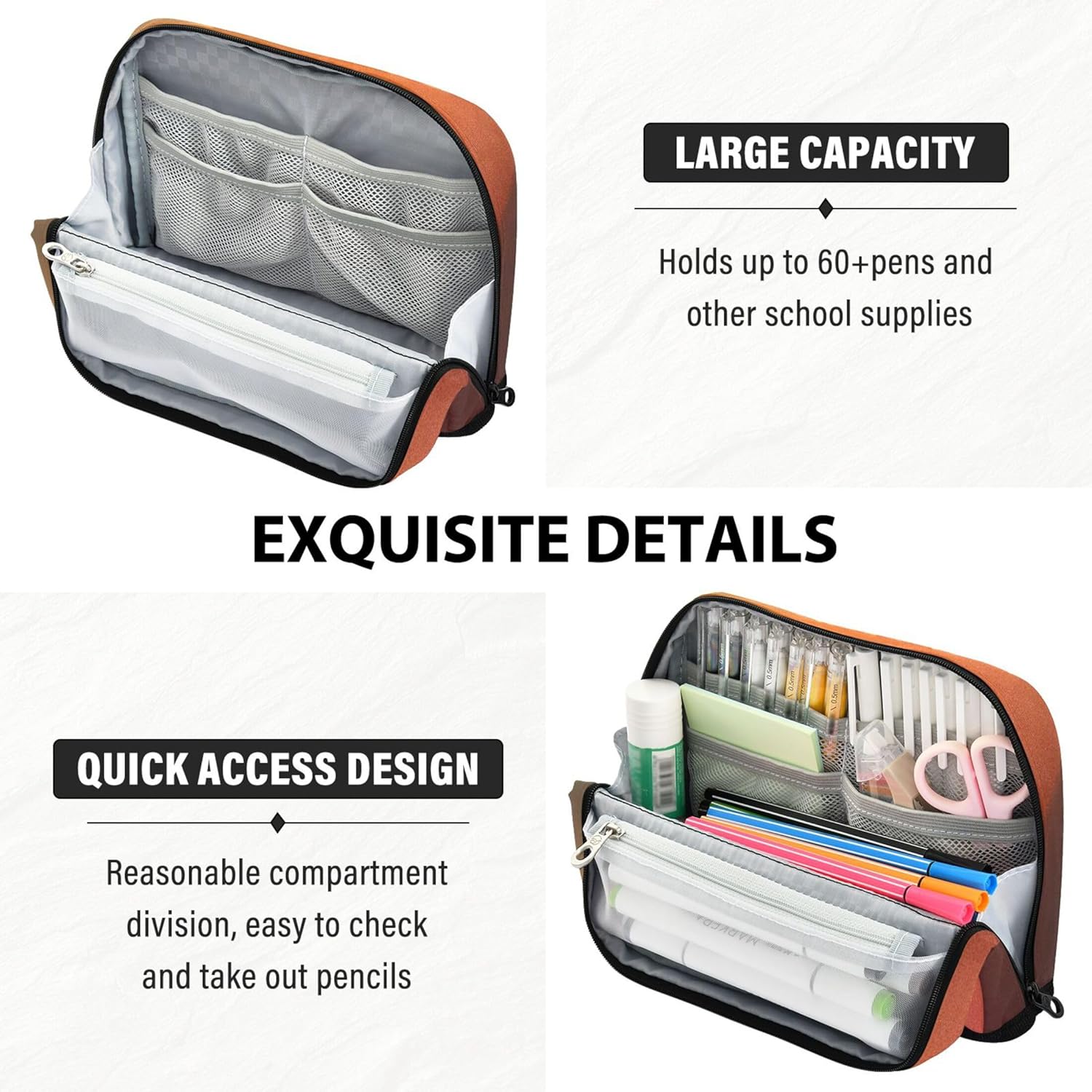 Struttura pieghevole e salvaspazio: i sacchetti organizer per matite utilizzano chiusure magnetiche per trasformarsi in un supporto verticale, consentendo una rapida panoramica e una disposizione ordinata di strumenti o articoli di cancelleria Selezione intelligente del tessuto: i sacchetti per matite sono realizzati in robusto nylon che offre flessibilità e protezione, garantendo che gli strumenti quotidiani rimangano al sicuro senza aggiungere ingombro Spazio massimo di archiviazione: l'astuccio per ragazze utilizza un layout interno intelligente con tasche multiple per contenere tutto, dagli strumenti di scrittura ai piccoli accessori in ordine Non solo per cancelleria: i sacchetti per penne scolastici sono pronti per contenere materiale scolastico, oggetti essenziali da viaggio o prodotti di bellezza, adattandosi perfettamente a ogni stile di vita Facile da personalizzare: l'organizer per matite consente di aggiungere dettagli significativi come nomi o loghi, creando una custodia unica che funge anche da regalo elegante o dichiarazione personale