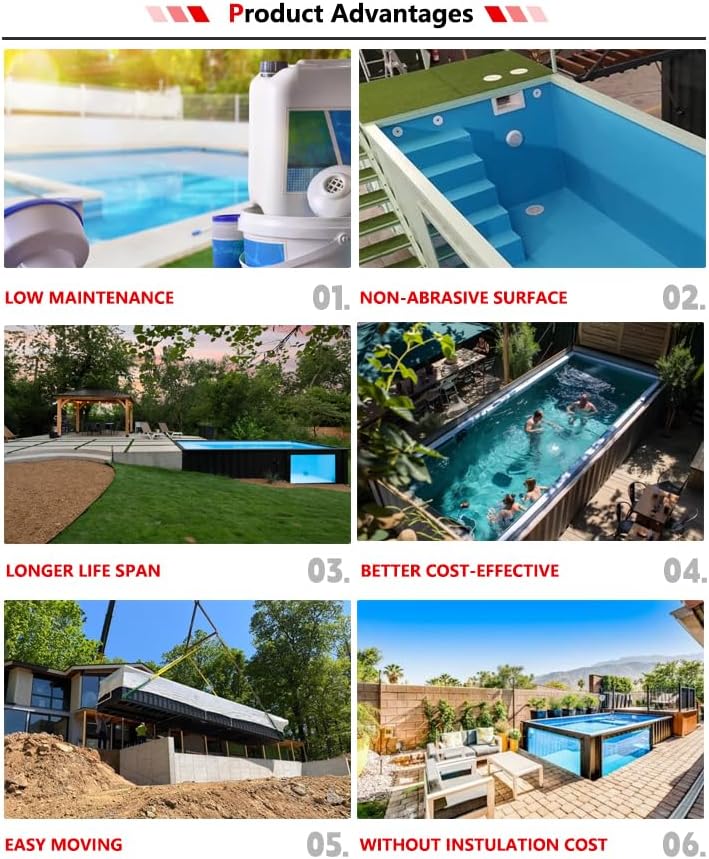 Opzioni personalizzabili: questo prodotto è disponibile in una varietà di design. I prezzi indicati sono solo di riferimento. Inviaci un messaggio o contatta direttamente il produttore tramite +86 13838022782. Forniremo informazioni e video più dettagliati su richiesta. Design espandibile: la piscina container adotta un design modulare che può essere ampliato in modo flessibile in base alle esigenze di utilizzo dello spazio. Il rivestimento antiruggine in acciaio ad alta resistenza garantisce durata e si adatta a varie condizioni climatiche