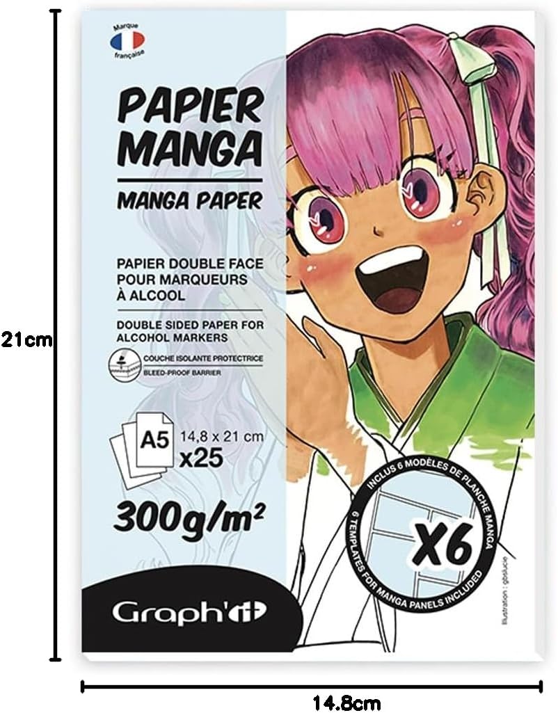* Il Blocco Manga GRAPH'IT è un blocco A5 (14,8x21 cm) di 25 fogli layout extra bianco da 300 gr, un angolo incollato, facilmente rimovibile e progettato appositamente per il pennarello con alcool e la possibilità di disegnare su entrambi i lati del foglio * Carta speciale marcatore: i fogli del blocco sono in layout extra bianco spesso 300 g e contengono uno strato isolante che impedisce l'inchiostro di passare attraverso e indebolire i fogli, che possono quindi essere utilizzati su entrambi i lati per 2 volte più disegni. La carta layout consente una perfetta combinazione di colori e la realizzazione di bellissime sfumature grazie alla sua speciale texture per feltro all'alcool. * Il blocco contiene 6 modelli di tavola manga su carta da livello che offrono diverse configurazioni di caselle: dialoghi, azioni e Yonkoma. Le tavole sono mixabili per ancora più combinazioni di scatole! * Ideale per tutti i livelli: il blocco Manga GRAPH'IT offre una carta di alta qualità, ideale per la realizzazione di disegni con marcatori alcolici, illustrazioni, rough, manga è molto apprezzato dagli studenti, artisti, professionisti ma anche dalle persone che vogliono provare i marcatori. * La gamma: il blocco Manga Graph'it è disponibile in 2 formati, A4 (21 x 29,7 cm) e A5 (14,8 x 21 cm). Si utilizza perfettamente con i pennarelli ad alcool Graph'it e Graph'it brush.