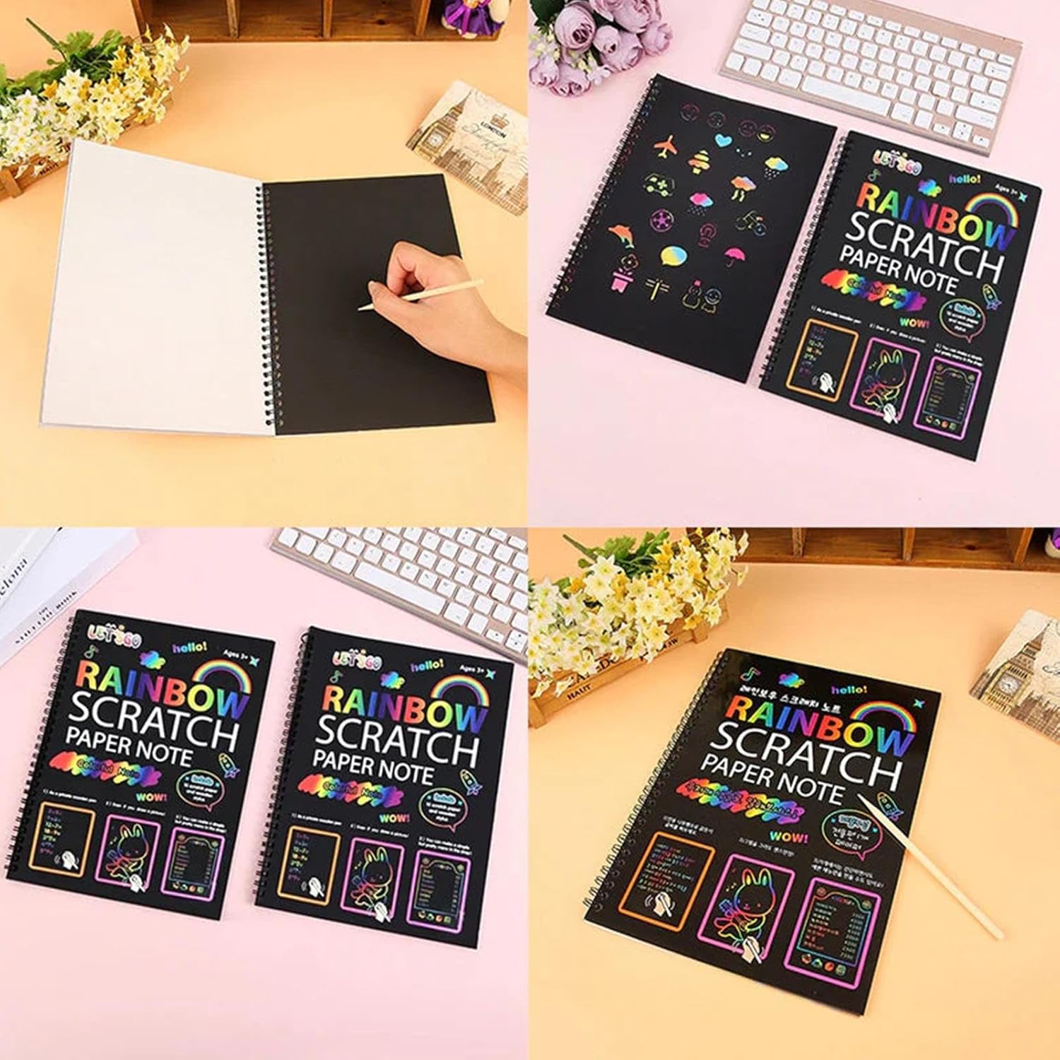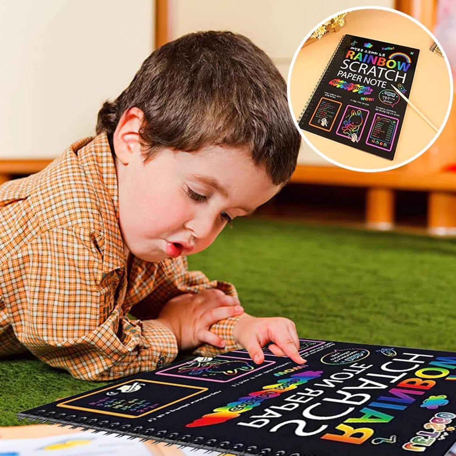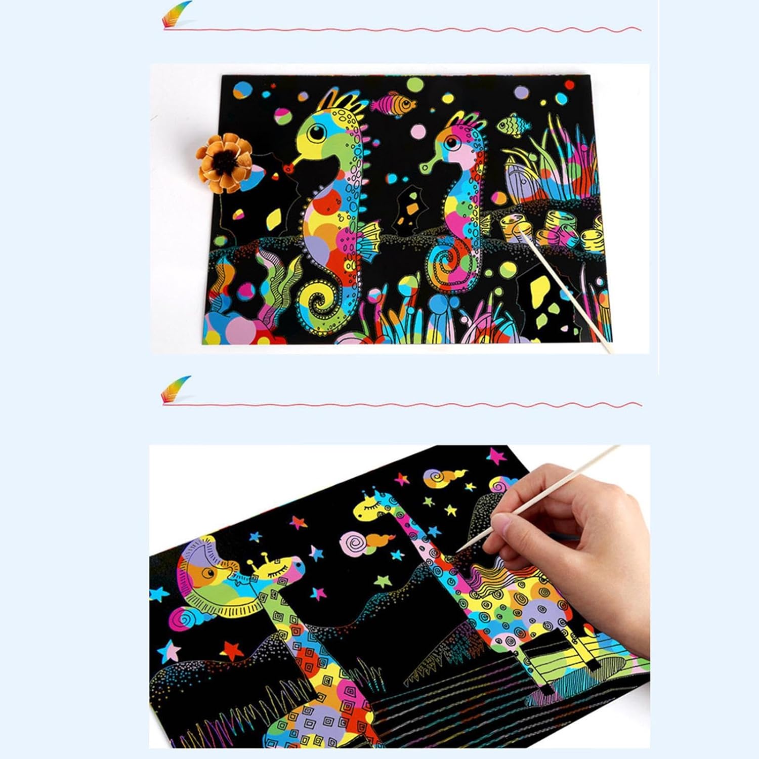 ⇁Materiale ecologico: realizzato con carta sicura, inodore e resistente, facile da trasportare, questo set è perfetto per i genitori attenti all'ambiente che desiderano offrire sbocco sicuro e divertente ai propri figli. ⇁Migliora le abilità: questo set artistico di gratta e vinci coltiva la creatività e l'immaginazione dei bambini, migliora la resistenza, la concentrazione e la pazienza attraverso un'attività educativa e divertente. ⇁Sviluppa abilità motorie: mentre gratti via il rivestimento nero con lo stilo in legno, le tue dita riceveranno un allenamento che migliorerà la destrezza e il controllo della mano. ⇁Divertimento creativo: con questo set di carta da grattare, puoi divertirti a creare dipinti fai-da-te che rivelano sfondo arcobaleno sotto la superficie nera. Basta grattare la carta con lo stilo incluso e diventare creativo con i tuoi disegni. ⇁Promuovi il tempo di legame: il nostro set di gratta e vinci incoraggia genitori e figli a lavorare in modo collaborativo, costruendo intimità e rafforzando i legami familiari. Condividi ore di divertimento e migliora la tua relazione oggi!