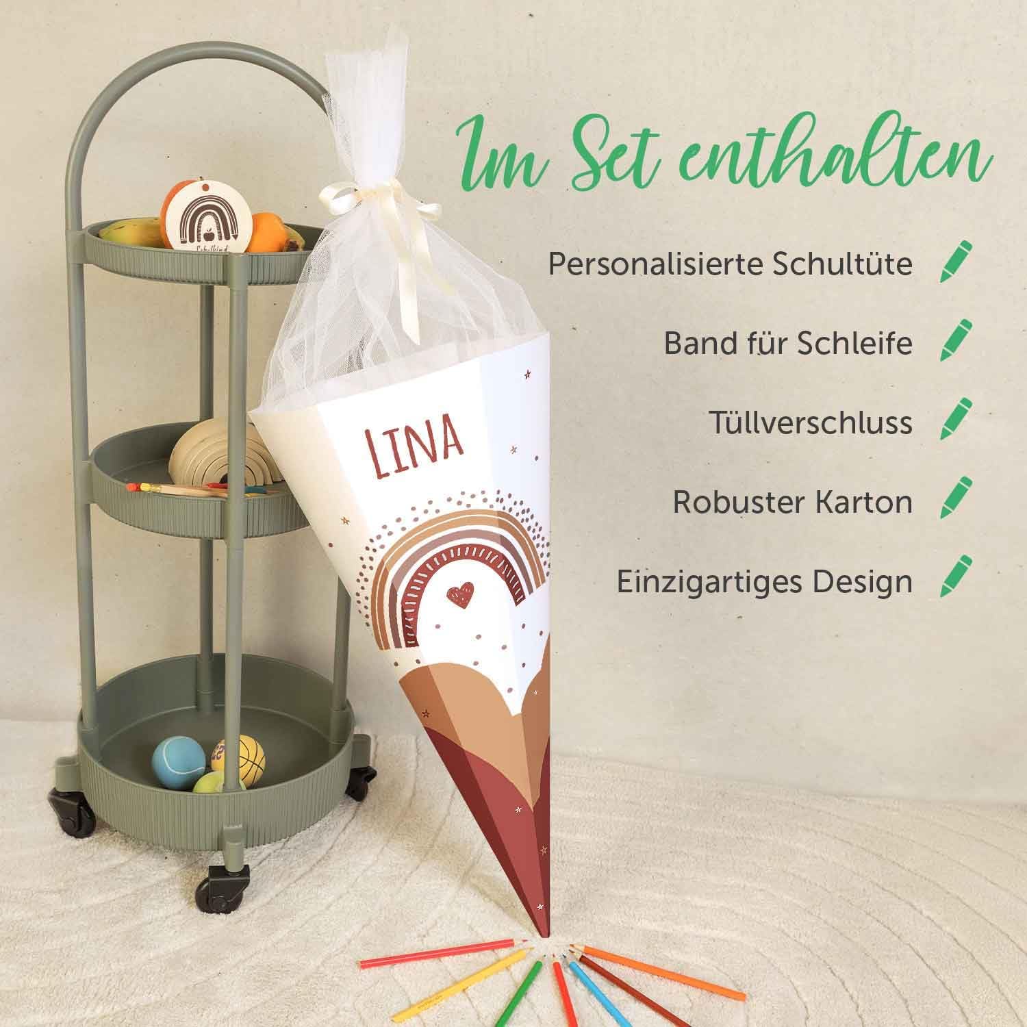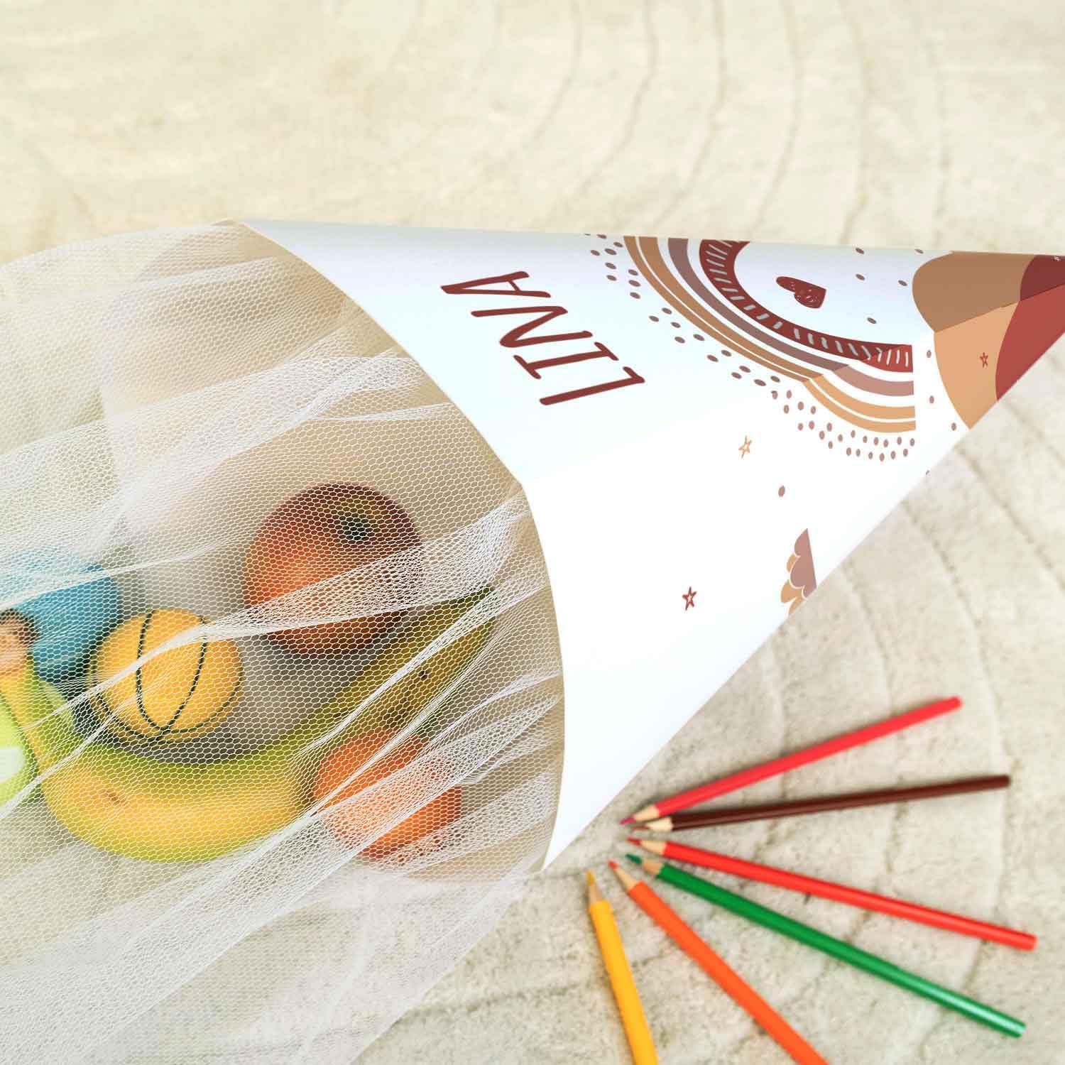 Stampa dai colori vivaci: l'inizio della scuola si avvicina sempre più e i nostri sacchetti personalizzati portano colore e fantasia nel primo giorno di scuola! Che si tratti di dinosauri, unicorni o colori neutri: nella nostra selezione di motivi c'è qualcosa per ogni principiante della scuola Personalizzato con il nome: ogni cono viene stampato individualmente e con il nome desiderato, creando così un ricordo unico e personale per l'inizio della scuola Pratico e adatto ai bambini: il cono per la scuola è robusto, piacevolmente leggero e grazie alla sua forma esagonale particolarmente facile da impugnare. La chiusura in tulle abbinata conferisce un aspetto festoso e mantiene il contenuto in modo sicuro Dimensioni: con una dimensione di circa 61 × 28 cm e una capacità di circa 2,8 litri, il sacchetto offre spazio sufficiente per piccoli regali o accessori scolastici. Realizzato in robusto cartone da 400 g/m², il sacchetto è robusto, ma allo stesso tempo piacevolmente leggero Servizio di qualità: ordinate oggi stesso e convincetevi della qualità di prima classe e della spedizione rapida. Se avete ancora domande sui nostri prodotti o una consegna non corrisponde alle vostre esigenze, siamo a vostra disposizione sia telefonicamente che via e-mail con consigli e fatti