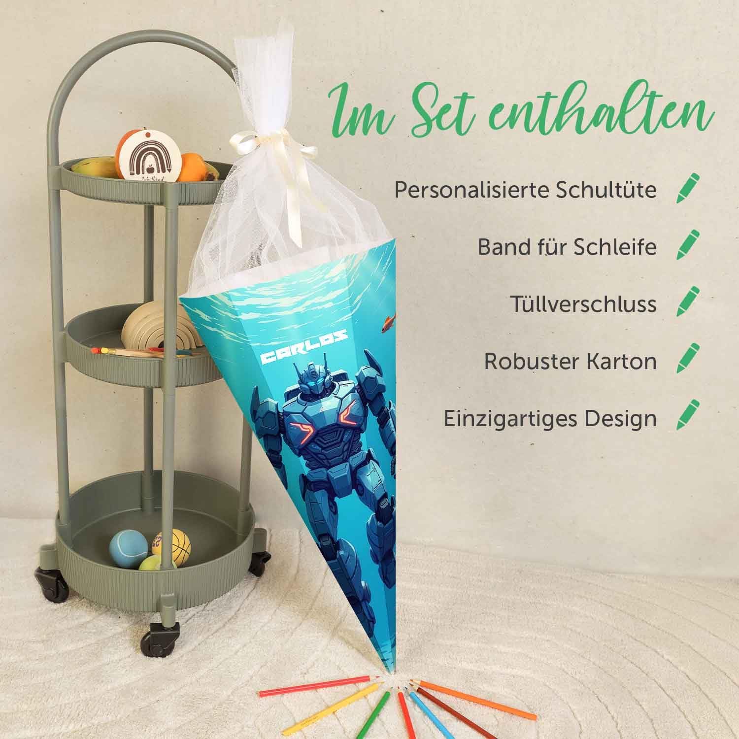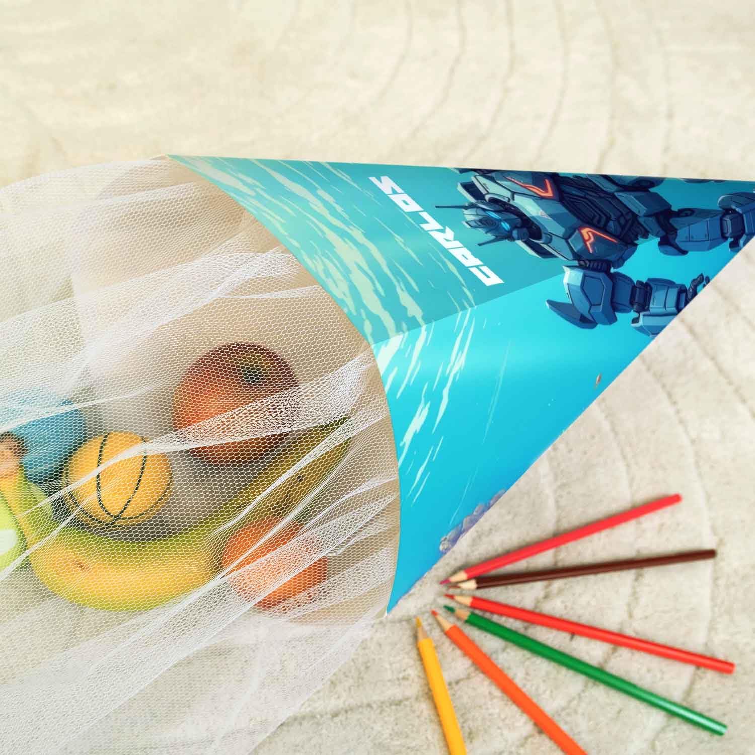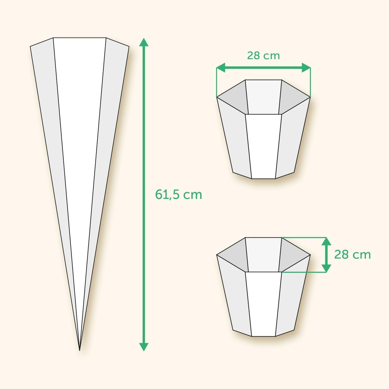 Stampa dai colori vivaci: l'inizio della scuola si avvicina sempre più e i nostri sacchetti personalizzati portano colore e fantasia nel primo giorno di scuola! Che si tratti di dinosauri, unicorni o colori neutri: nella nostra selezione di motivi c'è qualcosa per ogni principiante della scuola Personalizzato con il nome: ogni cono viene stampato individualmente e con il nome desiderato, creando così un ricordo unico e personale per l'inizio della scuola Pratico e adatto ai bambini: il cono per la scuola è robusto, piacevolmente leggero e grazie alla sua forma esagonale particolarmente facile da impugnare. La chiusura in tulle abbinata conferisce un aspetto festoso e mantiene il contenuto in modo sicuro Dimensioni: con una dimensione di circa 61 × 28 cm e una capacità di circa 2,8 litri, il sacchetto offre spazio sufficiente per piccoli regali o accessori scolastici. Realizzato in robusto cartone da 400 g/m², il sacchetto è robusto, ma allo stesso tempo piacevolmente leggero Servizio di qualità: ordinate oggi stesso e convincetevi della qualità di prima classe e della spedizione rapida. Se avete ancora domande sui nostri prodotti o una consegna non corrisponde alle vostre esigenze, siamo a vostra disposizione sia telefonicamente che via e-mail con consigli e fatti