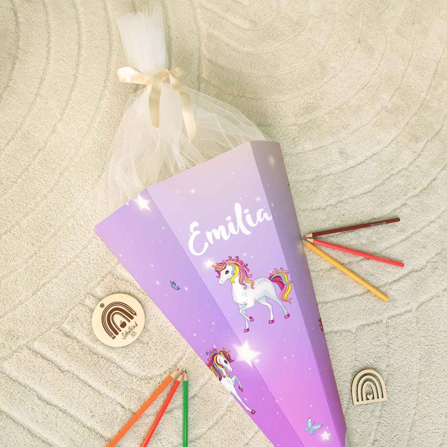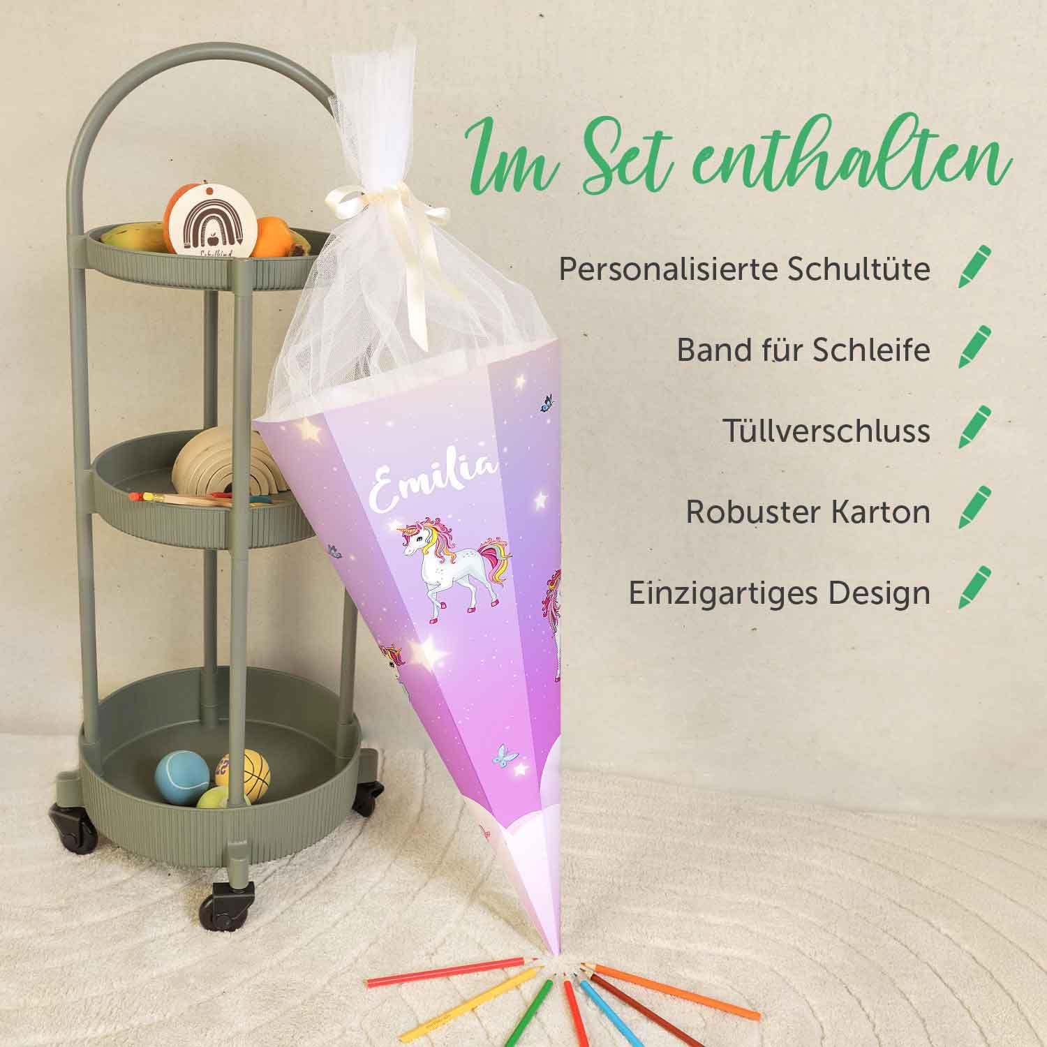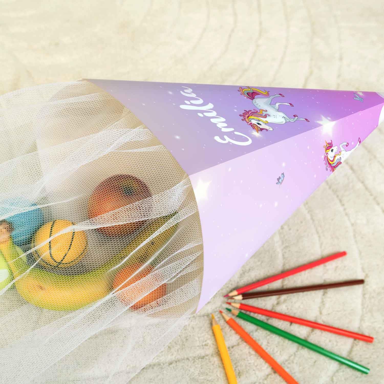 Stampa dai colori vivaci: l'inizio della scuola si avvicina sempre più e i nostri sacchetti personalizzati portano colore e fantasia nel primo giorno di scuola! Che si tratti di dinosauri, unicorni o colori neutri: nella nostra selezione di motivi c'è qualcosa per ogni principiante della scuola Personalizzato con il nome: ogni cono viene stampato individualmente e con il nome desiderato, creando così un ricordo unico e personale per l'inizio della scuola Pratico e adatto ai bambini: il cono per la scuola è robusto, piacevolmente leggero e grazie alla sua forma esagonale particolarmente facile da impugnare. La chiusura in tulle abbinata conferisce un aspetto festoso e mantiene il contenuto in modo sicuro Dimensioni: con una dimensione di circa 61 × 28 cm e una capacità di circa 2,8 litri, il sacchetto offre spazio sufficiente per piccoli regali o accessori scolastici. Realizzato in robusto cartone da 400 g/m², il sacchetto è robusto, ma allo stesso tempo piacevolmente leggero Servizio di qualità: ordinate oggi stesso e convincetevi della qualità di prima classe e della spedizione rapida. Se avete ancora domande sui nostri prodotti o una consegna non corrisponde alle vostre esigenze, siamo a vostra disposizione sia telefonicamente che via e-mail con consigli e fatti
