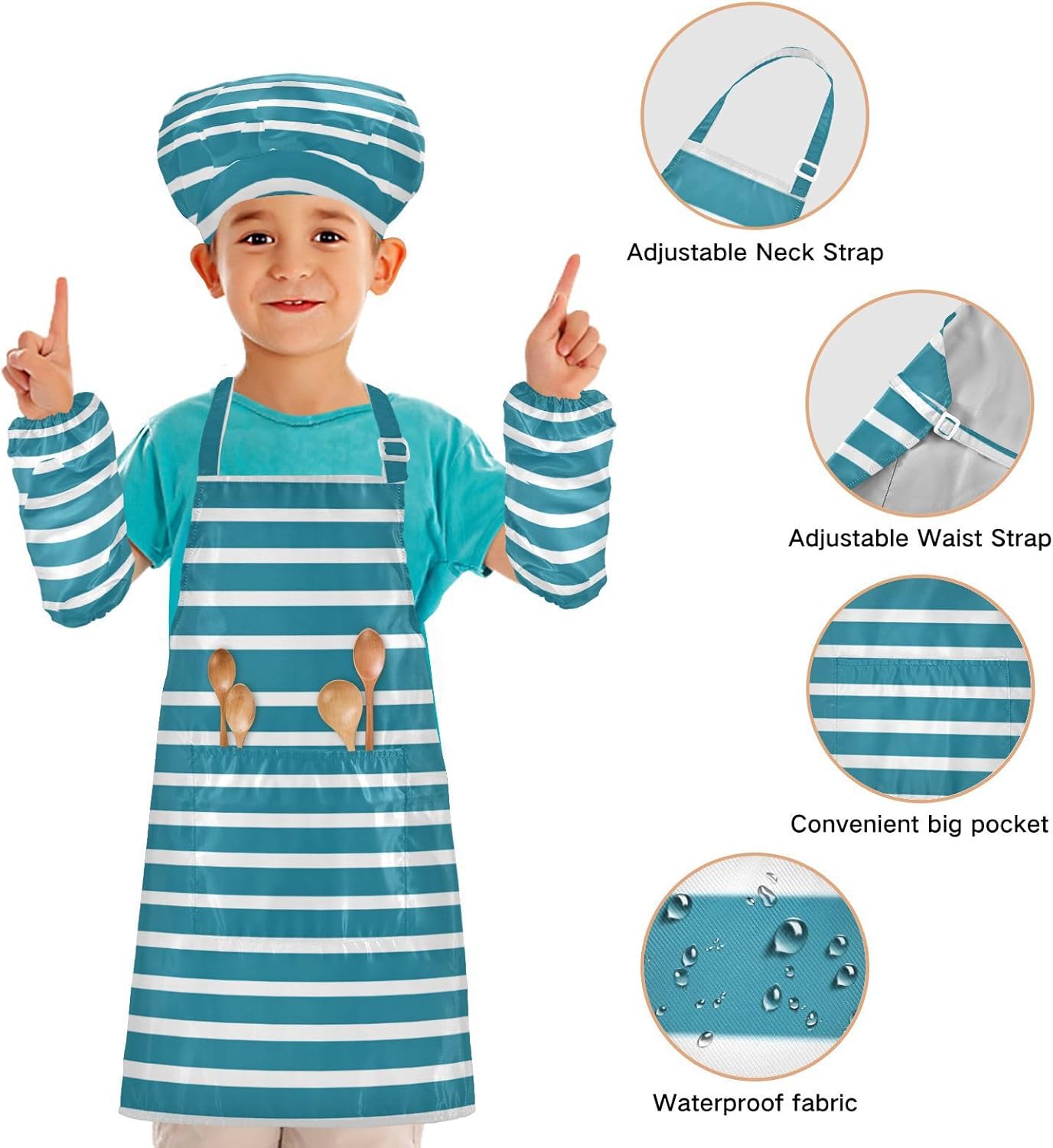 Grembiule da cuoco per bambini, con cappello a righe blu, grembiule da cucina per bambini con tasche per cucinare e dipingere 3-12 anni