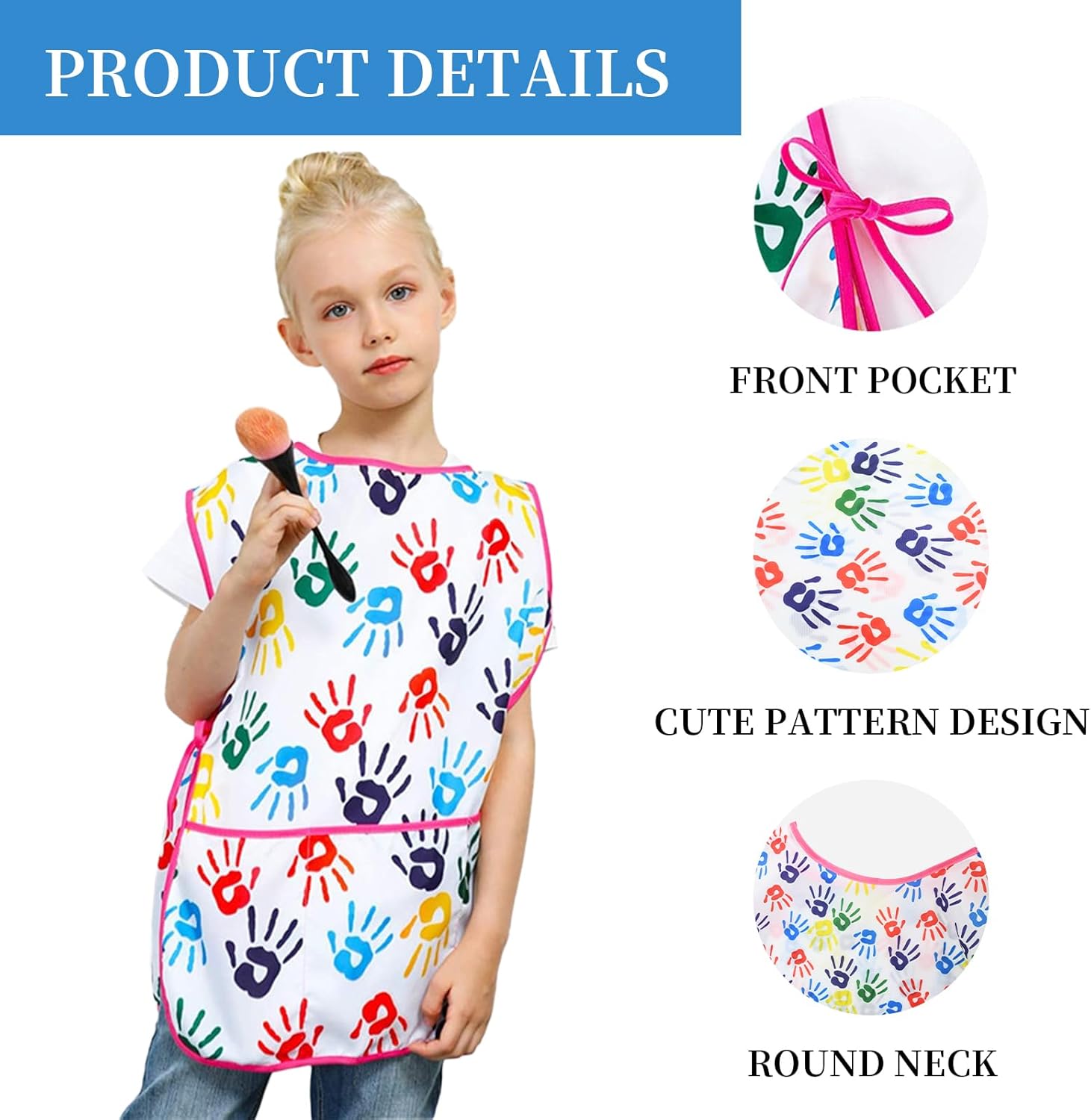 Este delantal artístico infantil es adecuado para que los niños lo lleven cuando pintan, escriben, cocinan, juegan y comen, evitando que se ensucie la ropa. Especificación del producto Información: -Nombre del producto: Niños delantales para cocinar -Material: 100% poliéster -Paquete: 1x Colorido delantal de pintura -Edad aplicable: 2-7 años Observaciones: 1. Por favor, permita ligeras diferencias debido a la medición manual. 2. Debido a la luz y las diferencias de pantalla, el color real puede ser ligeramente diferente de la imagen. Por favor, comprenda. 3. La pintura y los pinceles no están incluidos. Características: 1. Atado con cuerda: Con cuerda, puede ajustar la longitud del delantal a medida que su hijo crece, y es fácil de poner y quitar. 2. Diseño práctico de 3 bolsillos: Hay 3 bolsillos espaciosos en la parte delantera para las herramientas de arte. 3. Tejido impermeable: El tejido de poliéster impermeable o resistente a las manchas ayuda a proteger la ropa de la pintura, el pegamento y otras suciedades, manteniendo limpios a los niños y la ropa. 4. Patrones interesantes: El delantal tiene una variedad de coloridos estampados de palmeras para estimular la imaginación y la creatividad de los niños.