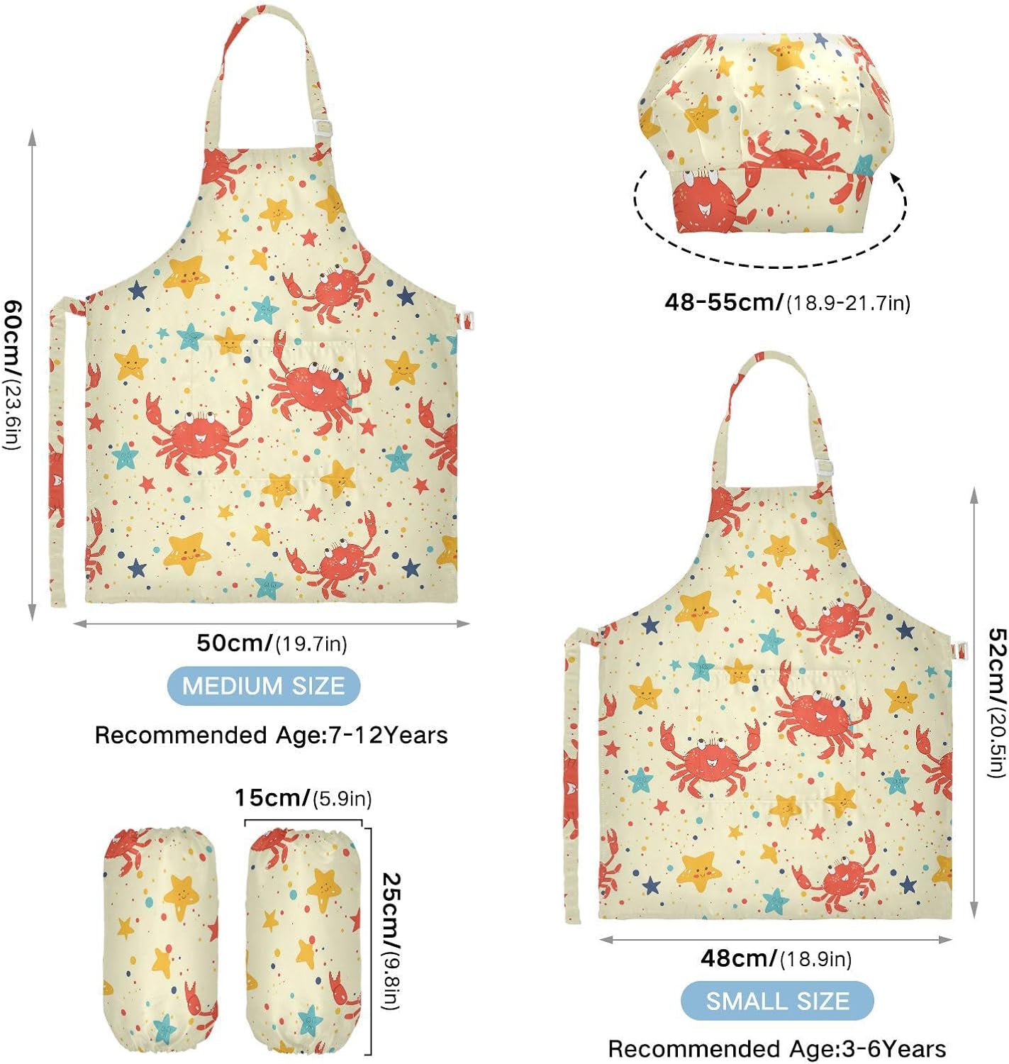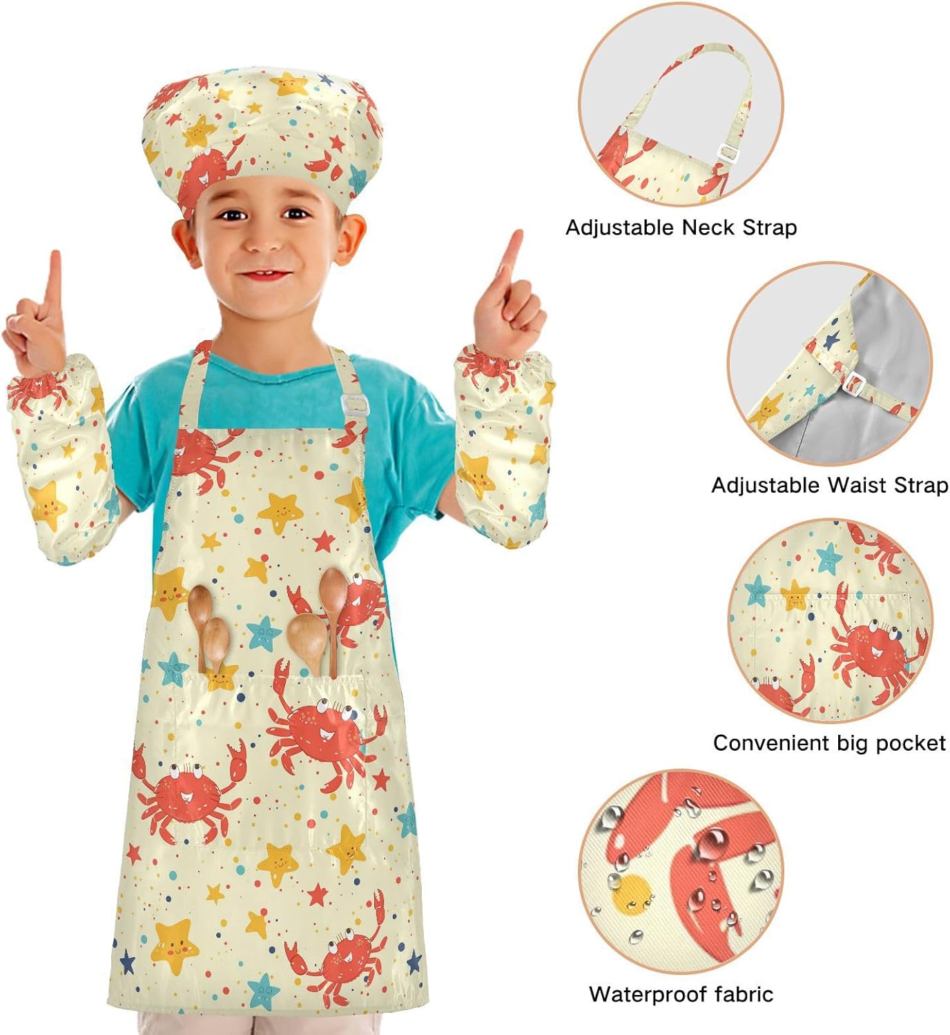 Grembiule da pittura per bambini, comodo, con motivo granchio, regolabile, con tasche, per cucinare, dipingere, 3-12 anni