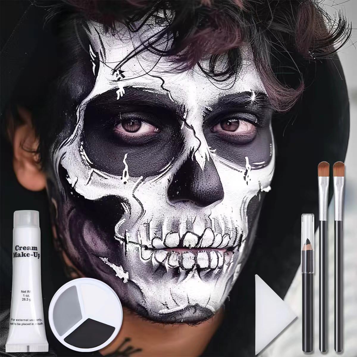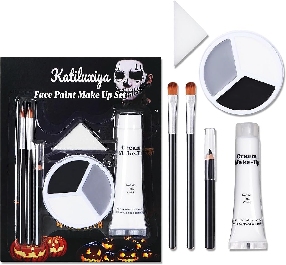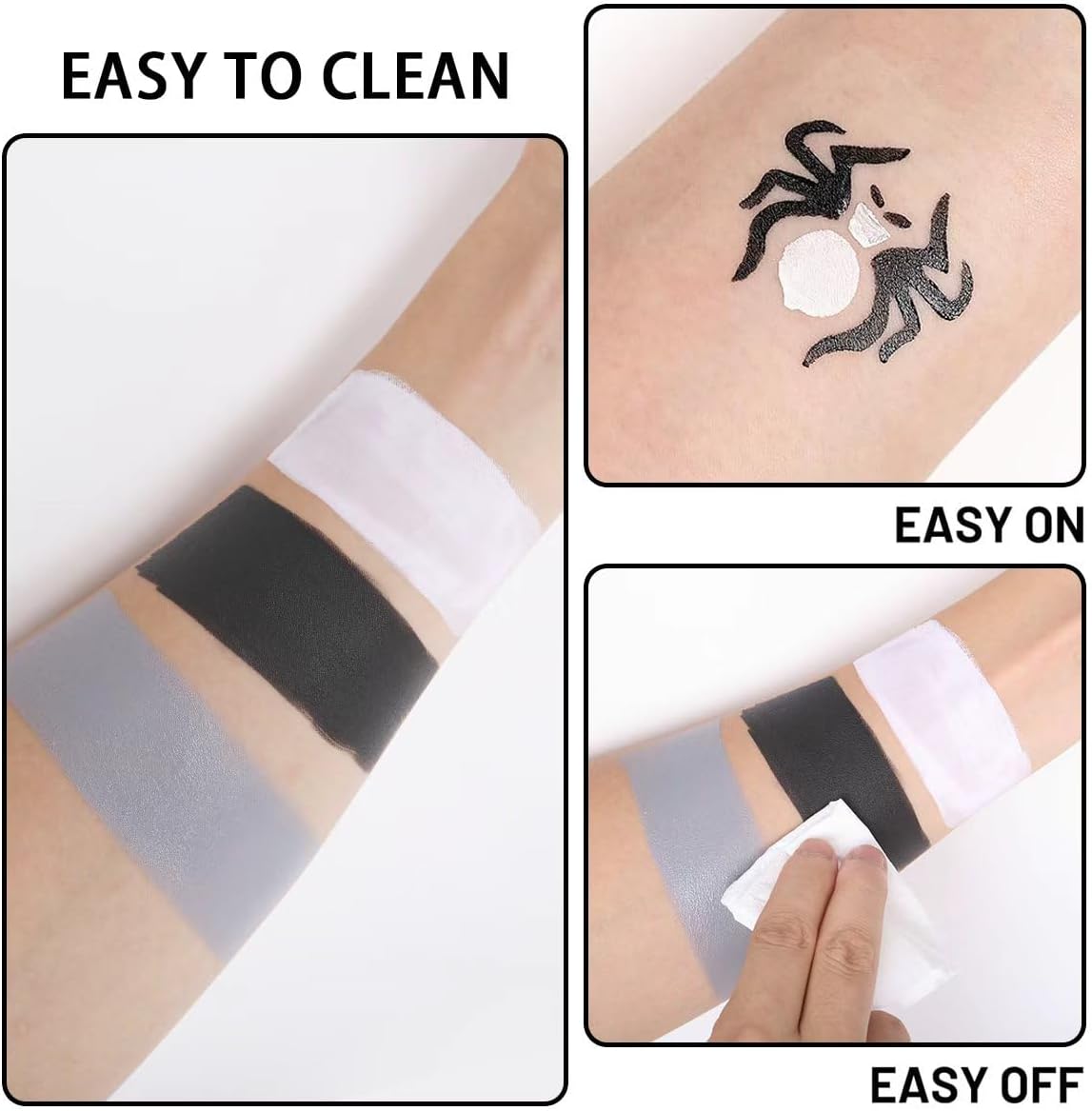 【Complete Halloween Makeup Set】Perfect for all your spooky needs, including Black Grey White Face Paint + 1PC Sponge + Brush+ Black Stick+ White Cream. Can be customized to your desired consistency, making it ideal for creating a wide range of looks, from subtle accents to bold and dramatic designs. 【Full Coverage】the formula is moist, semi-soft that glides smoothly and easy to blend, it will last all day without drying or cracking. Making it ideal for use on stage or in other performance settings where durability is key. 【Lasting & Colorfast】Soft and smooth creamy texture with flawless coverage, and easy to cover. Provide full coverage for Halloween clown and other special effects makeup, rich velvety color effects, fade-resistant, good color development, long-lasting unique formula and easily lasts all day long. 【Services】If you have any questions or problems about our face painting kit, please contact us in time, we will provide you with high quality service and the best solution. 【Easy to Remove】Our professional Face paint good for adults, it's cosmetic grade ingredients formulas. Can be easily washed off with water or wiped off with a damp cloth, and no color residue.