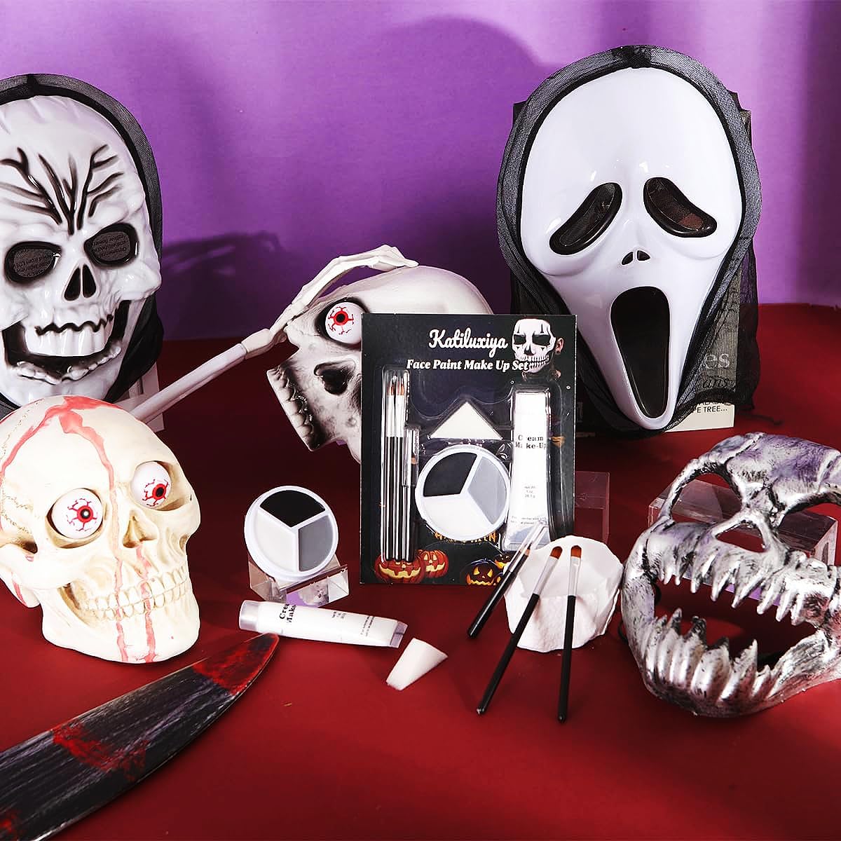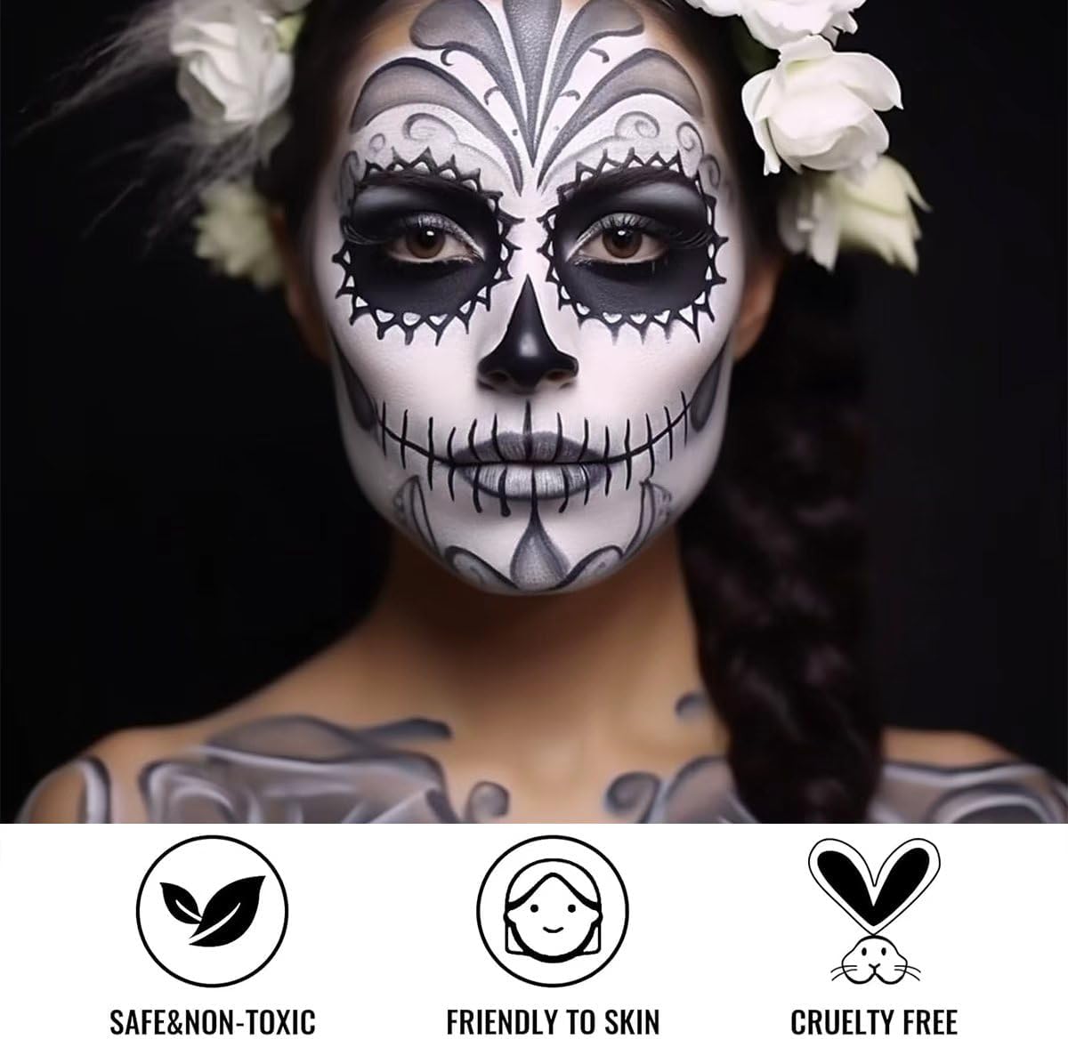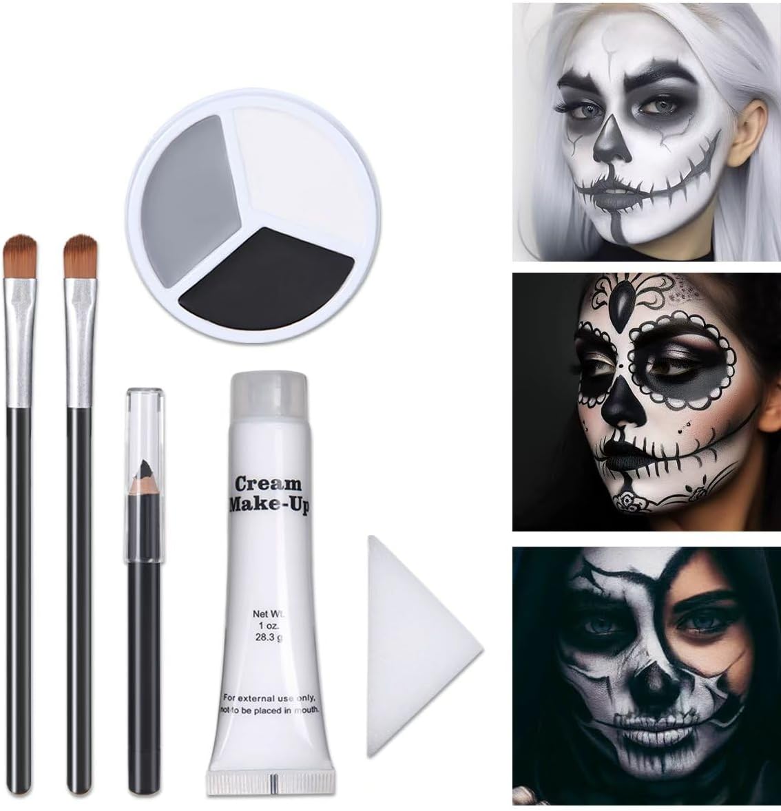【Complete Halloween Makeup Set】Perfect for all your spooky needs, including Black Grey White Face Paint + 1PC Sponge + Brush+ Black Stick+ White Cream. Can be customized to your desired consistency, making it ideal for creating a wide range of looks, from subtle accents to bold and dramatic designs. 【Full Coverage】the formula is moist, semi-soft that glides smoothly and easy to blend, it will last all day without drying or cracking. Making it ideal for use on stage or in other performance settings where durability is key. 【Lasting & Colorfast】Soft and smooth creamy texture with flawless coverage, and easy to cover. Provide full coverage for Halloween clown and other special effects makeup, rich velvety color effects, fade-resistant, good color development, long-lasting unique formula and easily lasts all day long. 【Services】If you have any questions or problems about our face painting kit, please contact us in time, we will provide you with high quality service and the best solution. 【Easy to Remove】Our professional Face paint good for adults, it's cosmetic grade ingredients formulas. Can be easily washed off with water or wiped off with a damp cloth, and no color residue.