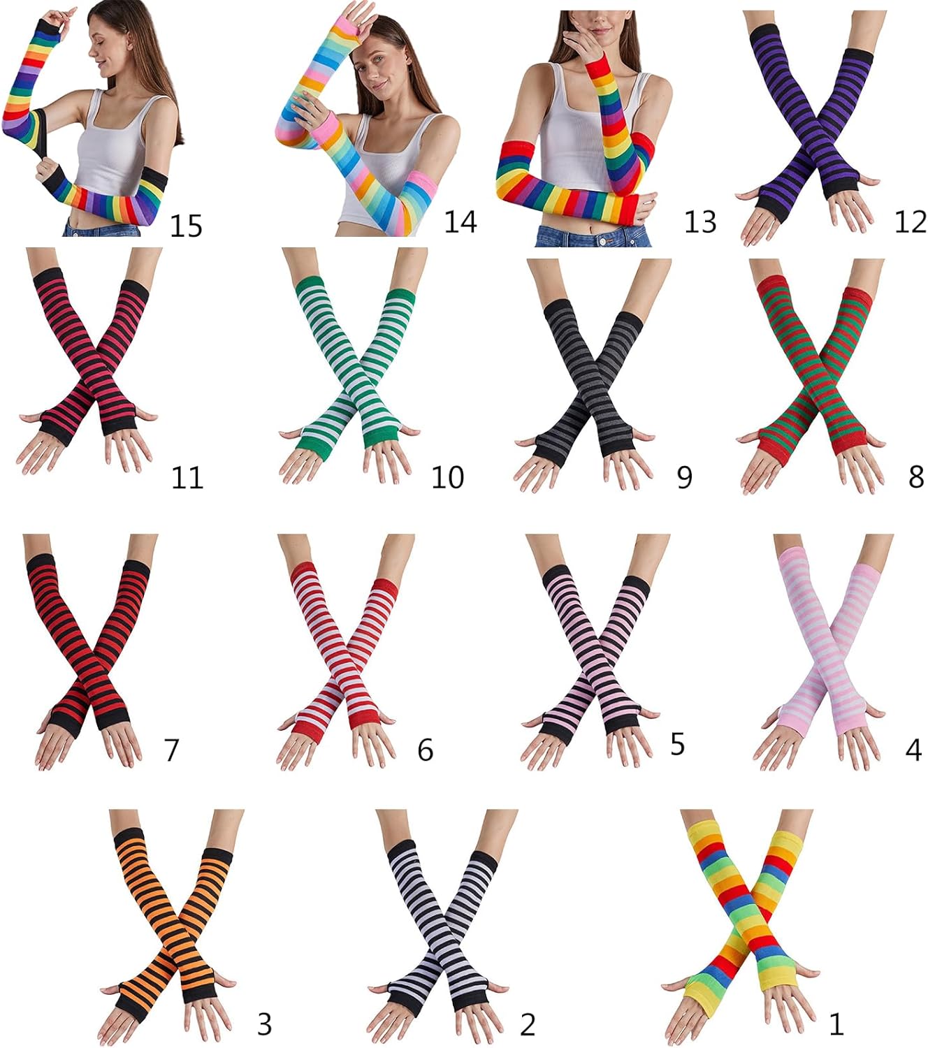 Guanti a righe arcobaleno per donne accessori per costumi da festa di Natale guanti elastici caldi maniche per braccio Cosplay Party Prop Caratteristiche: Migliora il tuo gioco cosplay con questi vivaci guanti arcobaleno. Il cotone colorato e confortevole lo rende un must per gli appassionati di cosplay e gli artisti. Realizzati in ottimo cotone, questi guanti a righe senza dita sono morbidi e adatti a persone di diverse dimensioni. La vestibilità elastica garantisce un comfort ottimale. Per le ragazze e le donne che amano vestirsi, questi guanti arcobaleno sono un accessorio versatile che aggiunge un tocco divertente e vivace a qualsiasi costume. Che tu stia partecipando a feste o impegnandoti in attività di gioco di ruolo, questi accessori ti aiuteranno a mostrare il tuo personaggio preferito Fai una dichiarazione alle feste e alle riunioni a tema con questi guanti arcobaleno. Ideale per cosplayer e artisti, questi accessori migliorano l'aspetto del tuo personaggio e aggiungono eccitazione al tuo atto. Scatena la tua creatività con questi versatili guanti arcobaleno Sia che tu stia aggiungendo un tocco di colore al tuo abbigliamento quotidiano o ti stai preparando per un'occasione speciale, questi accessori porteranno sicuramente un tocco di stile al tuo ensemble. Specifiche tecniche: Cotone Dimensioni del prodotto: ca. Lunghezza: 50 cm. Opzione: 15 opzionali come le immagini mostrate, si prega di selezionare la vostra preferenza La confezione include: 1 paio di manicotti a righe. Nota: Si prega di considerare un margine di errore di 1-2 cm dovuto alla misurazione Assicurarsi che questo non sia un problema prima di effettuare l'ordine. A causa della differenza tra i diversi monitor, l'immagine potrebbe non riflettere esattamente il colore dell'articolo.