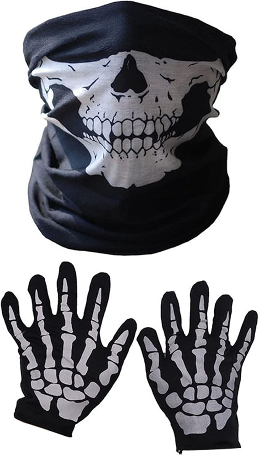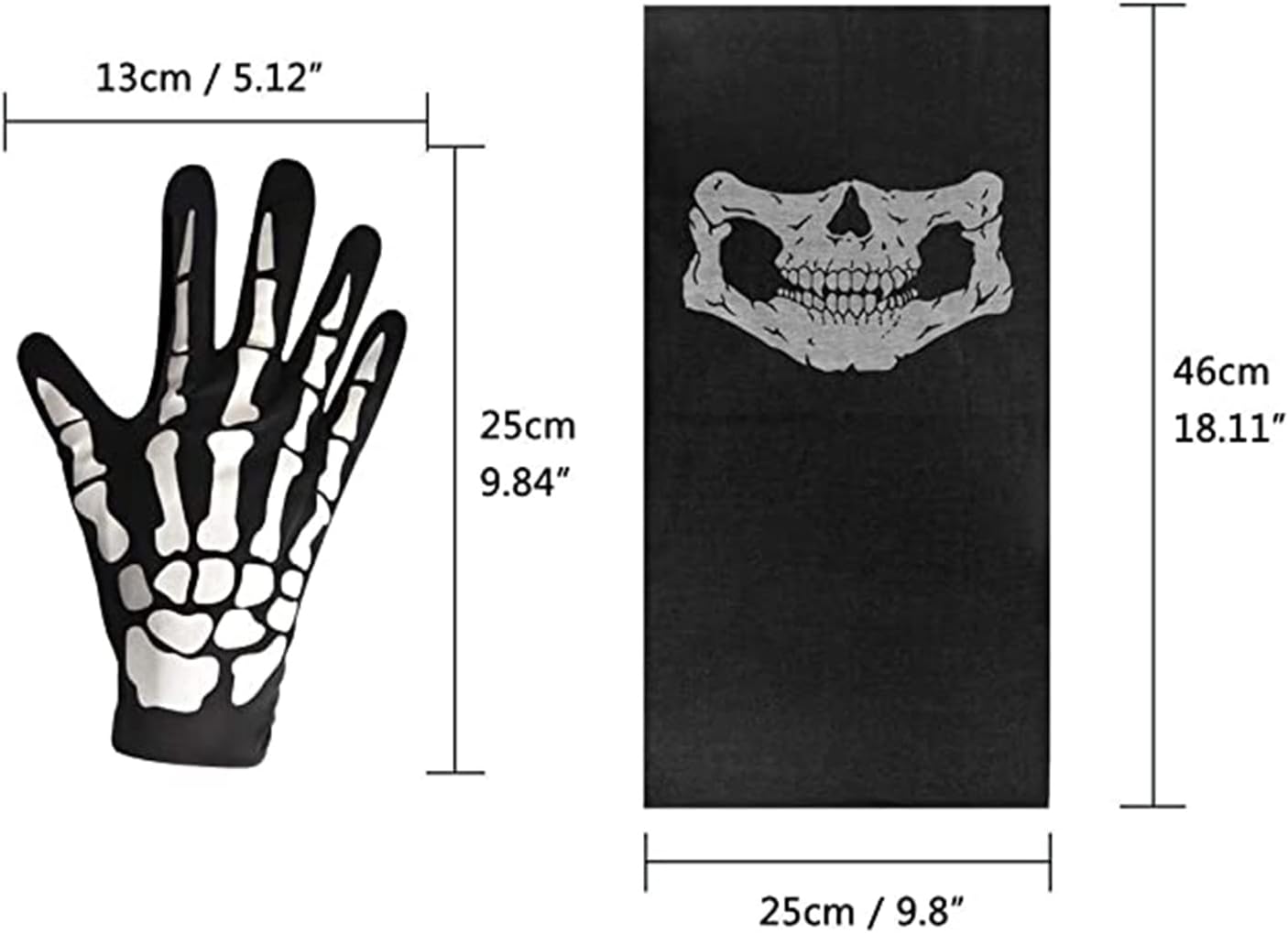 I guanti scheletro e il viso del teschio sono in tessuto, sono morbidi e confortevoli, resistenti all'usura Forniture per feste di Halloween: sfondo nero stampato osso scheletro bianco, realistico, è un buon per feste di Halloween Dimensioni: le dimensioni moderate e il design in bianco e nero sono adatti per la maggior parte delle persone, adulti e bambini possono utilizzare Ottimo regalo: è un fantastico set regalo per Ampio utilizzo: la faccia del teschio può essere utilizzata come sciarpe, cappelli, fascia e altre applicazioni. I guanti possono essere utilizzati per costumi da festa di Halloween e accessori fotografici