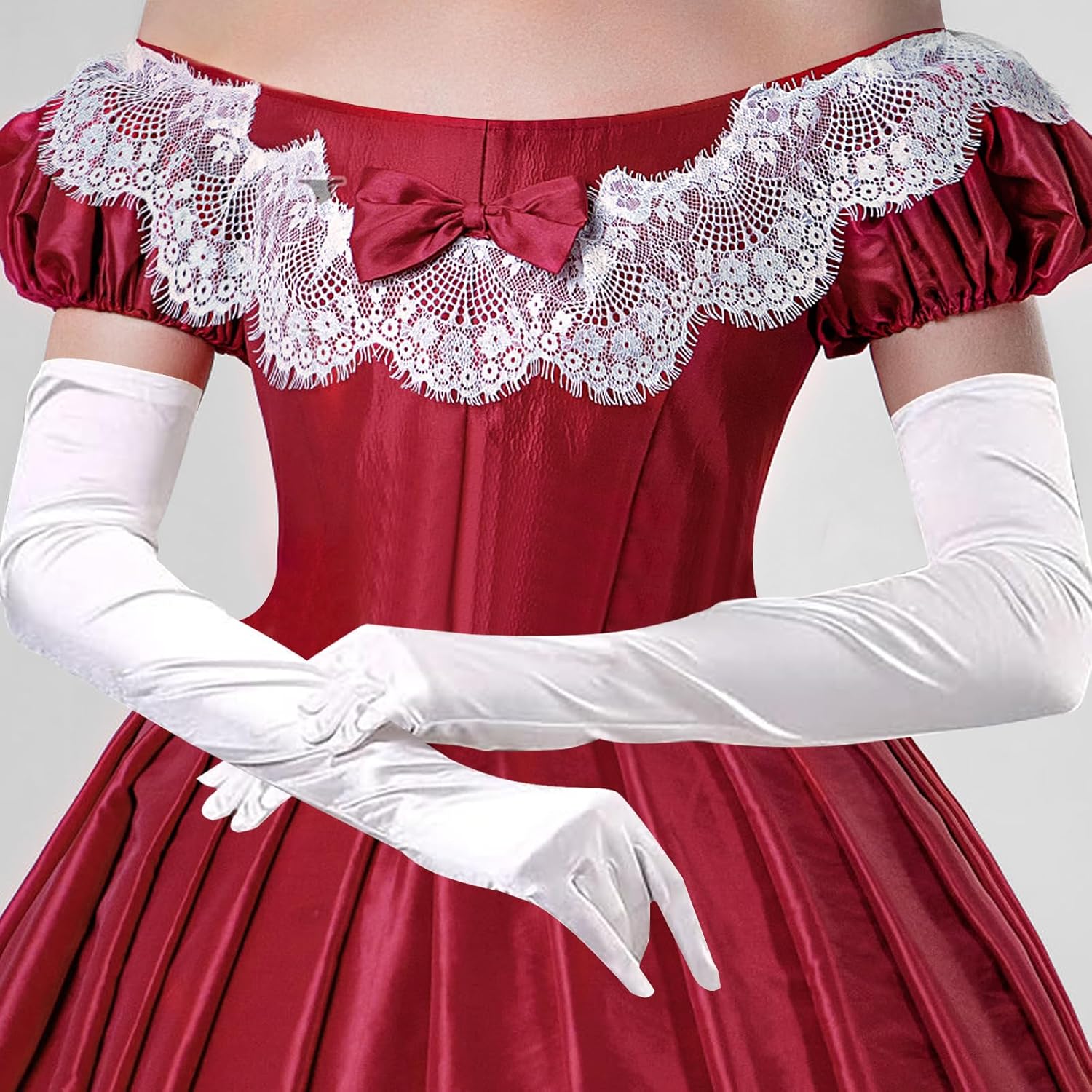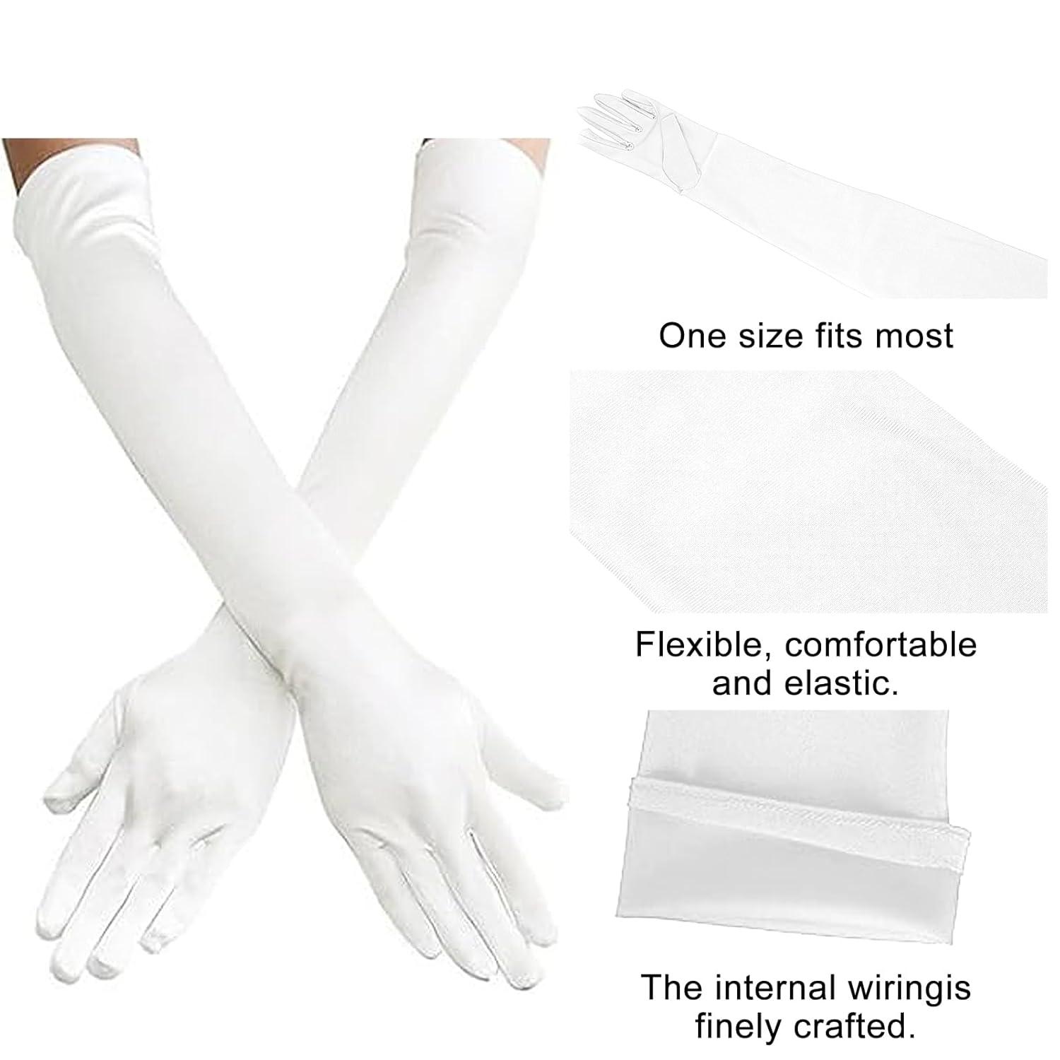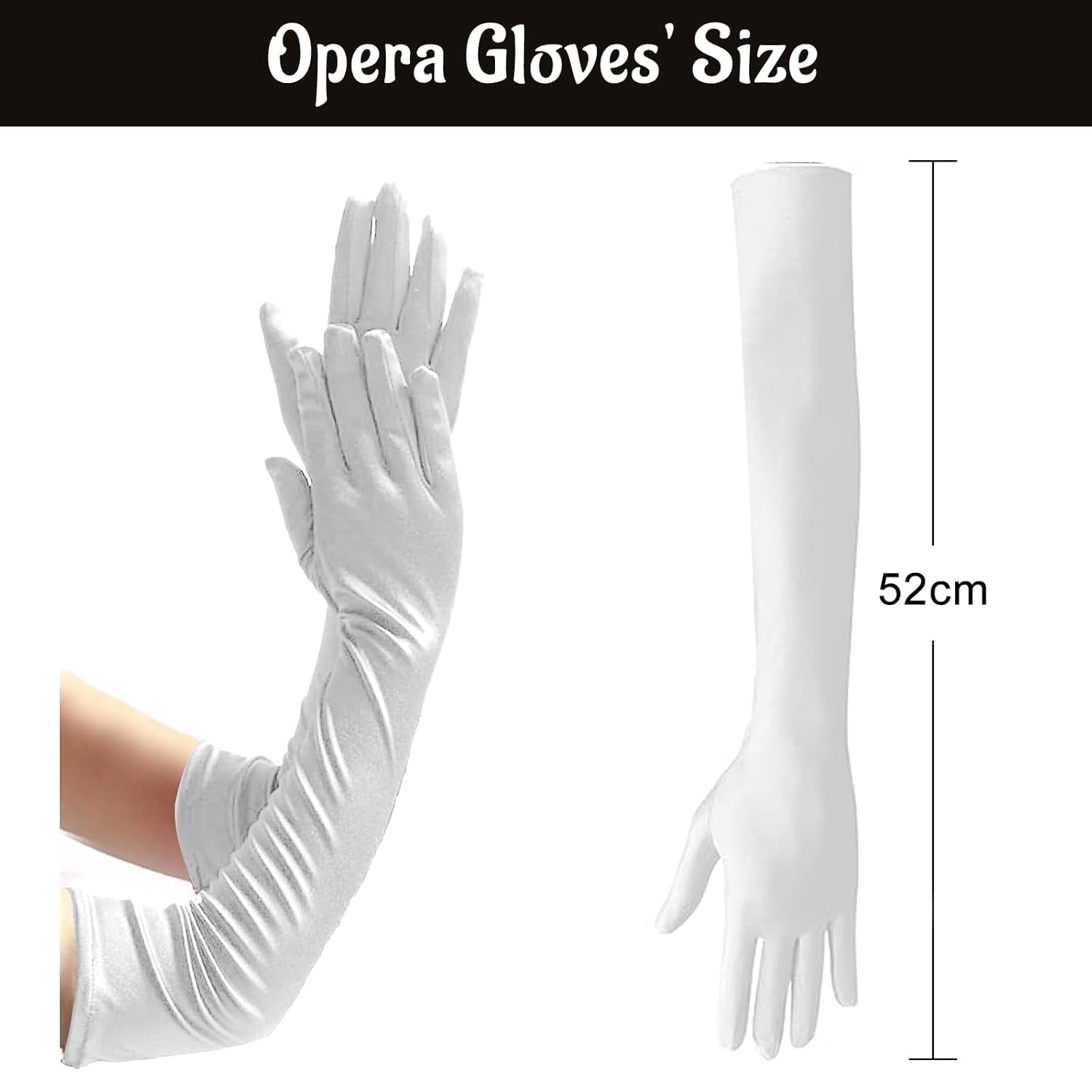 【Materiale】: i guanti lunghi sono realizzati in tessuto di raso elasticizzato di alta qualità, morbido e liscio, buone cuciture, comodo e resistente e lussuoso. Adatto per la maggior parte degli adulti e si abbina bene a qualsiasi outfit vintage. 【Dimensioni】: la lunghezza dalla punta del dito all'estremità del guanto è di ca. 52 cm. I guanti lunghi sono elastici e si adattano alla maggior parte delle persone. Questo è un must per gli amanti delle feste. 【Facile da combinare】: design retrò classico ed elegante, i guanti si abbinano ai tuoi diversi outfit e ti rendono il centro assoluto dell'attenzione. 【Adatto al braccio】: i guanti lunghi fino al gomito sono facili da indossare e da togliere, hanno una vestibilità perfetta e sono antiscivolo. Non risulta troppo stretto o scomodo quando indossato e non scivola via. Applicazione: i guanti di raso sono perfetti per i costumi degli anni '20 e possono essere utilizzati per matrimoni, balli studenteschi, feste a tema Gatsby degli anni '20, Halloween, feste in costume di carnevale e altre occasioni.