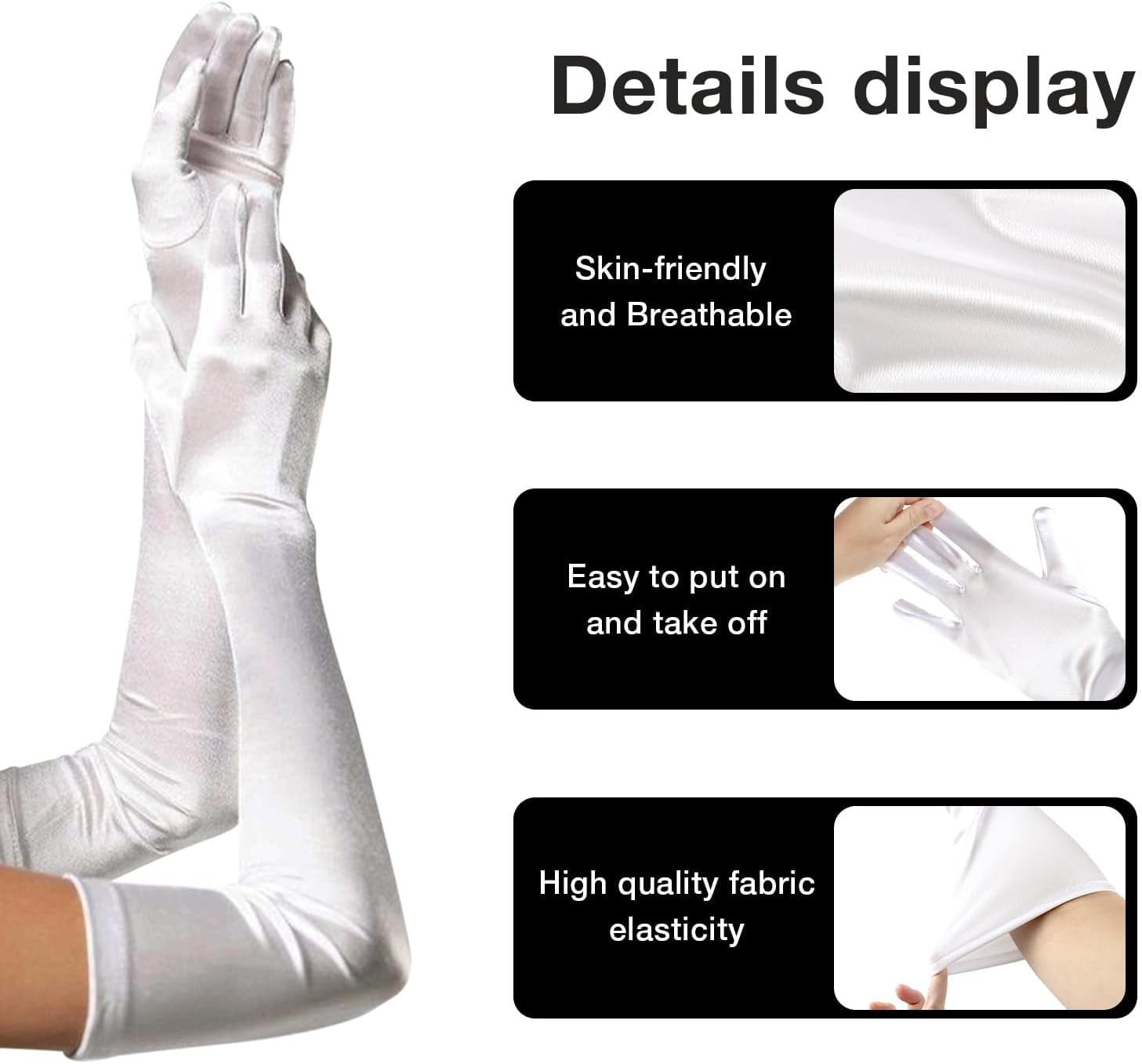 Le mot élégant convient parfaitement à ces gants. Très faciles à enfiler car ils sont extensibles, ils n'en gardent pas moins un aspect soyeux. Ils font quelques plis quand on bouge, mais rien de méchant. Vraiment parfaits pour un costume années 20, un cosplay, ou encore un jeu de rôles.