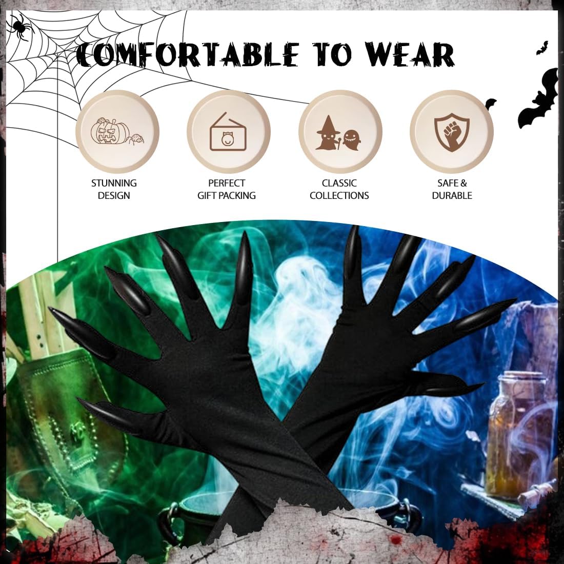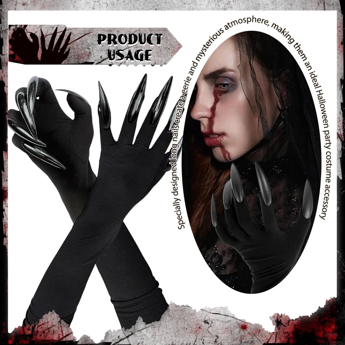 Materiali di alta qualità: i guanti con artigli di Halloween sono realizzati in poliestere di alta qualità. Nuovo di zecca, di fascia alta, morbido e resistente. Adatto a feste e spettacoli, molto realistico e divertente. Ottimo design: le unghie lunghe possono creare un'atmosfera spaventosa a una festa. È flessibile e adatto alla maggior parte delle persone. Corrisponde al tema spaventoso di Halloween. Non facile da danneggiare. Comodo da indossare: questo guanto ha polsini elastici, perfetti per la forma della mano della maggior parte delle persone, facili da indossare e da togliere per ripararli, non facili da cadere e comodi da indossare. Ampiamente usato: i guanti per unghie sono adatti a una vasta gamma di persone. Possono essere indossati nei giochi di ruolo e nei giochi di ruolo in costume. Può renderti più affascinante. Regalo perfetto: può anche essere un bell'accessorio per la tua collezione o un regalo perfetto per la famiglia o gli amici intimi. È perfetto per feste in maschera, carnevali, Natale, Pasqua, Halloween o altre feste.