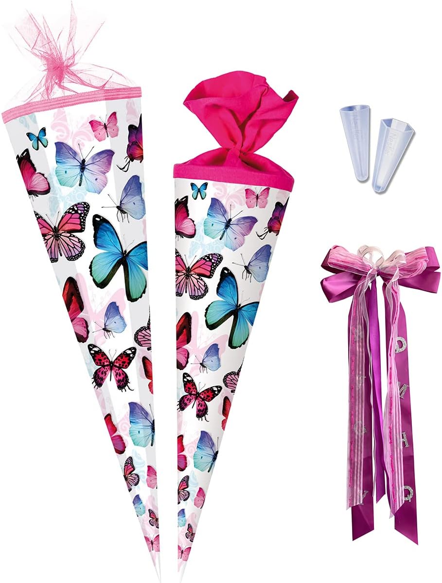 Gufo cono scolastico - dimensione del pezzo grezzo: 68 cm, lunghezza totale ca. Cono scolastico rosa in cartone ondulato 3D da 100 cm + carta crespa cartoncino fotografico rosa, bianco e rosa + cartoncino fotografico con motivi + punte per cono scolastico nastro di raso bianco e rosa + nastro di organza rosa foglio modello + istruzioni