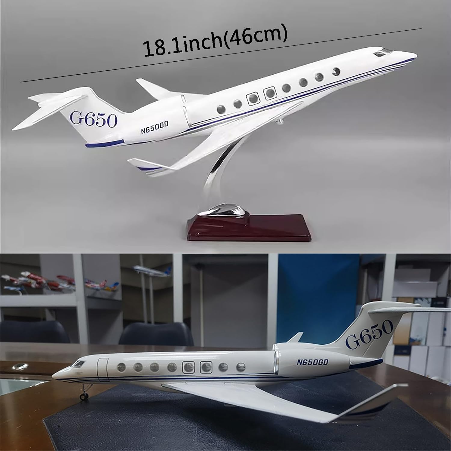 【Modello di aereo Gulfstream G650】:Modello restaurato di jet aziendale Gulfstream G650. Modello di aereo Gulfstream G650 in scala 1:70 da 18,1", 18,1 x 17,7 x 8,3 pollici. 【DESIGN SEMPLICE A SCATTO】Il modello Gulfstream g650 si installa facilmente in tre passaggi e puoi visualizzare modelli migliori sul tuo supporto, il modello di visualizzazione statico è completamente ridotto in base alla macchina originale e il grado di simulazione è elevato. 【MATERIALE DI ALTA QUALITÀ E DETTAGLI】Modello di aeroplano Gulfstream il corpo in resina di alta qualità, la base in legno e le staffe metalliche, i dettagli dalle piastre del motore alla verniciatura sono meticolosi e il modello di jet è molto aerodinamico nel suo insieme. Il modello di aeroplano ha 16 finestre chiaramente visibili. Puoi usarlo con sicurezza. I dettagli precisi rendono la decorazione più delicata e squisita. Goditi il modello di aereo 【G650 MODELLO AEREO CONOSCENZA MILITARE】Gulfstream G650 è un jet aziendale sviluppato dagli Stati Uniti e l'aereo più veloce nell'aviazione civile dopo il Concorde. Ha la cabina di pilotaggio più grande in questa classe di aeromobili. Il Gulfstream G650 è il primo jet aziendale a lunghissimo raggio a volare direttamente da New York a Tokyo nella storia del volo umano. È uno dei modelli rappresentativi dei migliori jet aziendali a lungo raggio del mondo. 【Regalo da collezione】: il modello di aeroplano è dotato di un supporto di base pronto for essere esposto, fantastiche decorazioni e oggetti da collezione for l'ufficio, la casa e il regalo perfetto for gli appassionati di aviazione, il personale militare o i collezionisti. L'elegante confezione regalo nera è un'ottima scelta quando si tratta di un regalo.