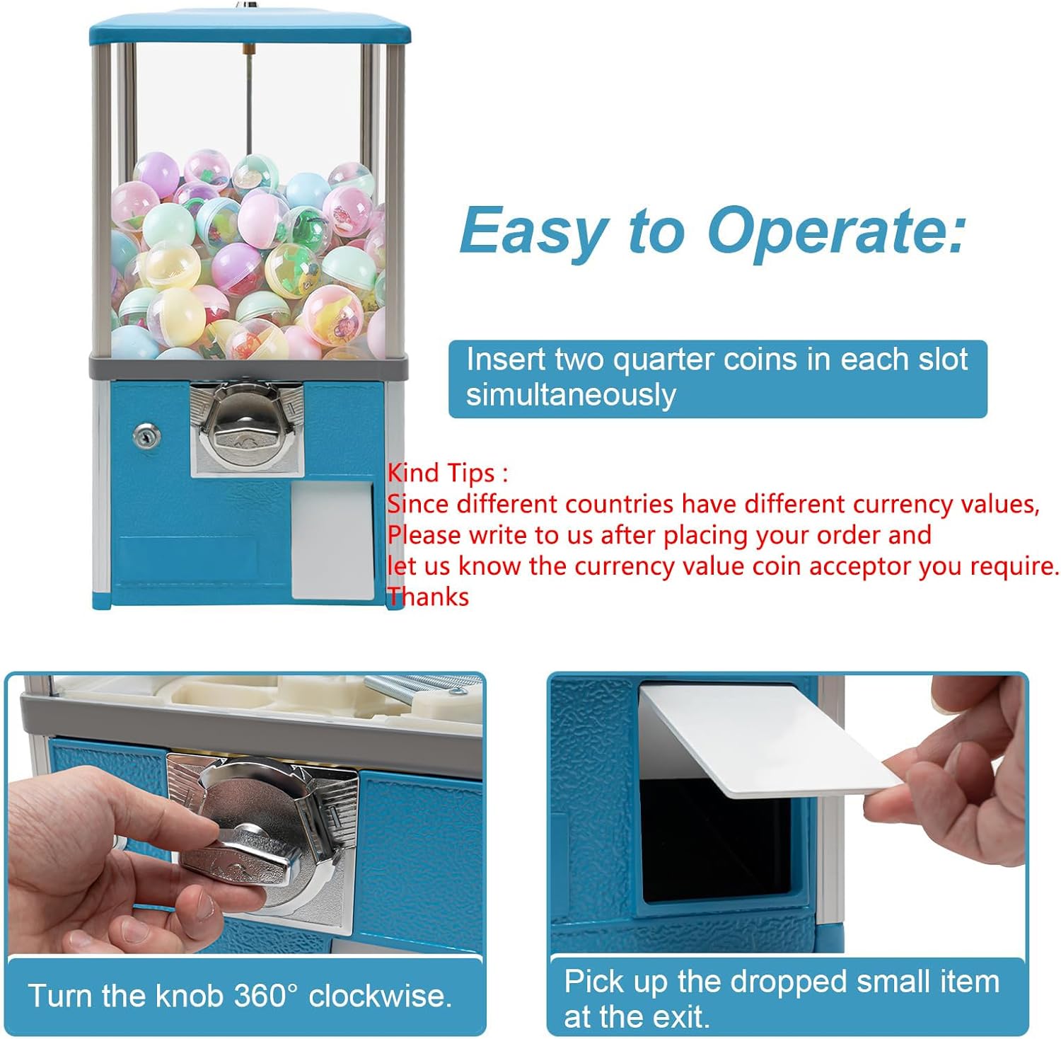 Costruzione durevole: Il nostro distributore automatico di caramelle è realizzato in lega di alluminio di alta qualità e lega di zinco, con ABS resistente agli urti e materiali PS che impediscono la rottura e la deformazione. Il suo design rettangolare offre stabilità e forte capacità portante, garantendo che rimanga in posizione verticale anche quando è pieno di giocattoli e circondato da bambini entusiasti. Ampia capacità: misura 26 x 29 x 53 cm, questa macchina può contenere circa 800-1000 monete, 200 uova attorcigliate (4,3 cm) o 150 uova attorcigliate (4,8 cm). Questa generosa capacità riduce al minimo la necessità di ricariche frequenti, soddisfacendo le esigenze di intrattenimento dei visitatori nei centri commerciali e nei parchi di divertimento. Ideale per erogare capsule giocattoli, caramelle o flipper. Maggiore sicurezza: il distributore automatico dispone di una serratura di sicurezza situata nella parte superiore ed esterna del salvadanaio, accessibile solo con la chiave inclusa per prevenire il furto di giocattoli e monete. Il telaio rotante garantisce ai clienti una facile visibilità e accesso agli articoli all'interno della macchina. Funzionamento facile da usare: basta inserire due monete da 25 centesimi in ogni lato dello slot per monete (per un totale di quattro), quindi ruotare la manopola di 360° in senso orario per rilasciare gli oggetti alla presa. Questo processo semplice è facile da imparare e può essere padroneggiato in pochi minuti. La macchina viene fornita con quattro accettatori di monete da 25 centesimi e possiamo soddisfare le richieste di cambio di valuta tramite e-mail. Funzionalità versatile: la macchina funziona in modo indipendente, consentendo di allontanarsi mentre eroga oggetti. Aggiungere regolarmente prodotti e raccogliere monete consente di risparmiare tempo e fatica. Il suo design unico ed elegante non solo serve a uno scopo pratico, ma migliora anche il tuo spazio con un tocco decorativo colorato che si adatta a vari stili di arredamento.