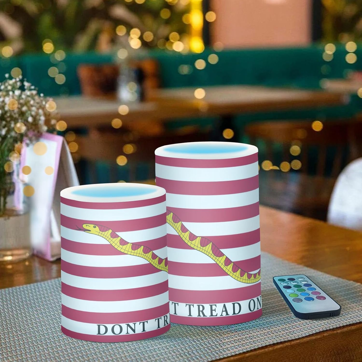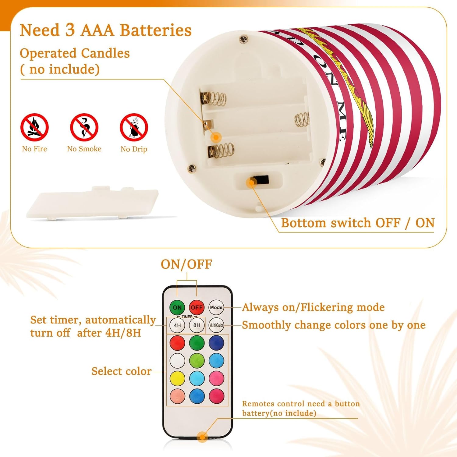 Confezione da 2 candele a colonna Flamel con telecomando: presenta una candela in plastica da 7,6 x 12,7 cm e una candela in plastica da 7,6 x 10,2 cm con stampe laterali su una base. Sicuro, affumicato e gocciolante per un uso senza preoccupazioni. Più sicure delle candele tradizionali: goditi la bety della lume di candela senza rischi: 100% di fiamma, fumo e gocciolamento, rendendole perfette per case con bambini, animali domestici o ambienti asciutti. Telecomando multifunzione: regola tra modalità sfarfallio/costante, passa attraverso multi-colori o imposta un singolo colore, e utilizza il timer 4H/8H per lo spegnimento tomatico (batterie non incluse: 3xAAA per candele, pulsante 3V per telecomando). Facile installazione e compatibilità universale: basta accendere l'interruttore inferiore per attivare il telecomando. Per uso interno ed esterno senza rischi di incendio, sicuro per bambini e animali domestici. Decorazione festiva per tutto l'anno: perfetta per Natale, Ringraziamento, matrimoni e uso quotidiano: interni o esterni, queste candele tremolanti fiammellate trasformano qualsiasi spazio in un rifugio accogliente.