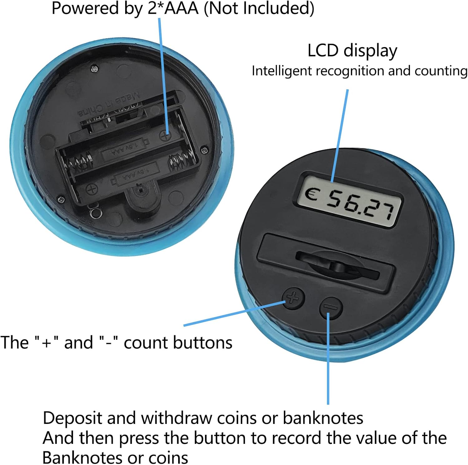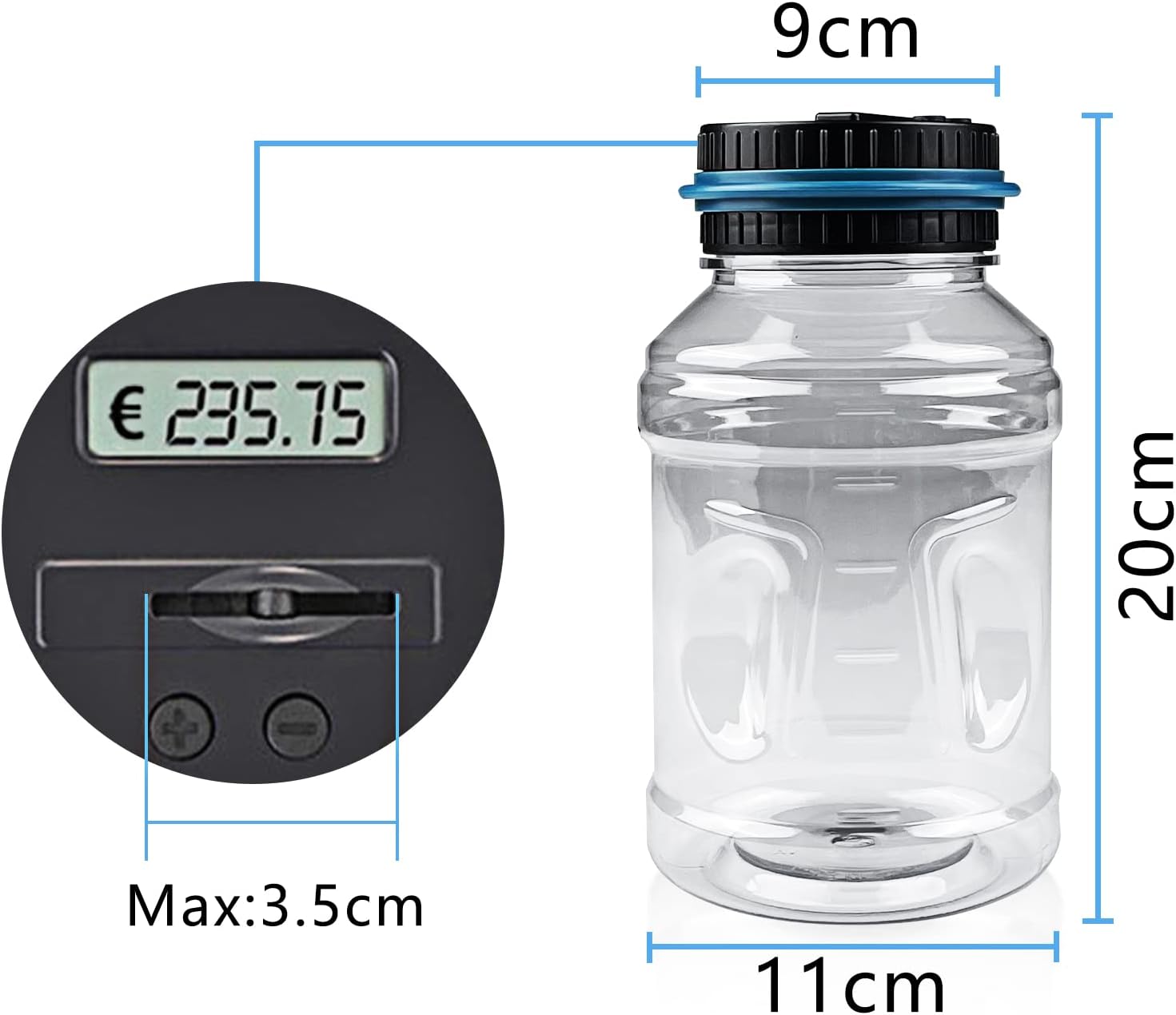 【Materiali di alta qualità】 Il salvadanaio elettronico è realizzato in materiale ABS di alta qualità, meno fragile del vetro e dei materiali ceramici, sicuro da usare anche per i bambini. Attraverso il salvadanaio trasparente puoi vedere chiaramente la quantità di monete d'argento depositate. Il salvadanaio ha anche una grande capacità fino a 1,8 litri, che può contenere 800-1000 monete. 【Schermo LCD HD】 Il salvadanaio digitale è appositamente progettato per monete d'argento in euro ed è dotato di uno schermo LCD ad alta risoluzione. Ogni volta che una moneta entra nel salvadanaio, il display LCD mostra automaticamente l'importo totale esatto per ciascun deposito. Lo schermo ha anche un design a risparmio energetico, auto-spegnimento dopo 10 minuti di inutilizzo. 【Pulsante funzione +/-】 Il salvadanaio digitale ha un pulsante funzione +/-. Tenere premuto un tasto qualsiasi per 3 secondi per accedere a questa funzione. Se trovi che la visualizzazione del salvadanaio non è corretta o hai bisogno di prelevare denaro o conservare banconote, puoi regolare l'importo corretto utilizzando il pulsante. 【Sostituisci la batteria】Salvadanaio con contatore. Sono necessarie 2 batterie AAA (non incluse). Se la batteria è scarica, è possibile sostituirla in 2 minuti per garantire che i conteggi non vengano eliminati. Per motivi di sicurezza, utilizzare normali batterie a secco o al manganese. 【Regalo perfetto】 Il salvadanaio da banco è molto adatto come regalo per compleanni o altre feste ed è molto adatto per amici e bambini per aiutarli a sviluppare una buona abitudine di risparmiare denaro.