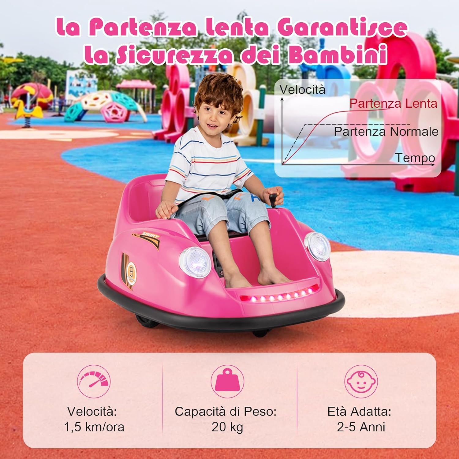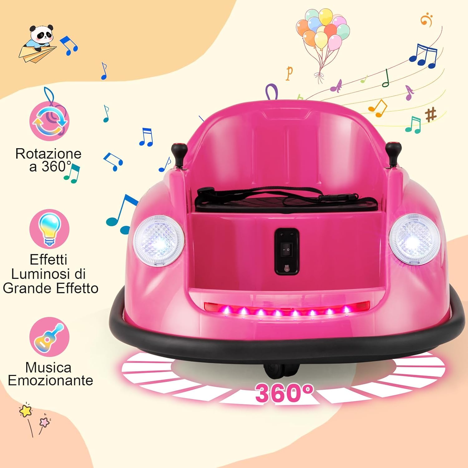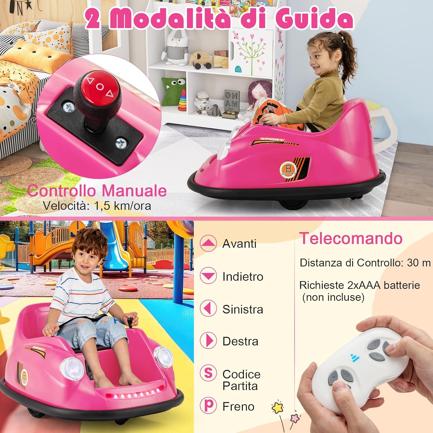 # Girevole a 360 gradi # Con un design girevole a 360 gradi, questo veicolo motorizzato paraurti consente al bambino di guidare in tutte le direzioni per un maggiore divertimento. La funzione di partenza lenta garantisce un viaggio sicuro ed emozionante per il bambino. # 2 modalità di controllo # Dotato di un telecomando che consente ai genitori di controllare il veicolo motorizzato a proprio piacimento, include anche una modalità joystick che consente ai bambini più piccoli di guidare in modo indipendente. Questo aiuta i bambini a sviluppare le capacità motorie divertendosi al volante. # Emozionanti effetti luminosi e sonori # Questa macchinina è dotata di fari a LED e strisce luminose colorate per offrire al bambino un'esperienza visiva emozionante. Inoltre, i bambini possono premere il pulsante della musica e scegliere le loro canzoni preferite. # Alte prestazioni e design sicuro # Questo autoscontro elettrico è alimentato da 2 potenti motori da 12 V per prestazioni superiori. Inoltre, la cintura di sicurezza regolabile assicura che i bambini siano seduti in sicurezza durante il gioco. # Regalo perfetto per i bambini # Deliziate i vostri bambini con questa auto elettrica con paraurti! È un divertimento e un'opportunità di apprendimento, ideale sia per l'uso interno che esterno. È sicuramente il regalo perfetto per i bambini dai 2 ai 5 anni.