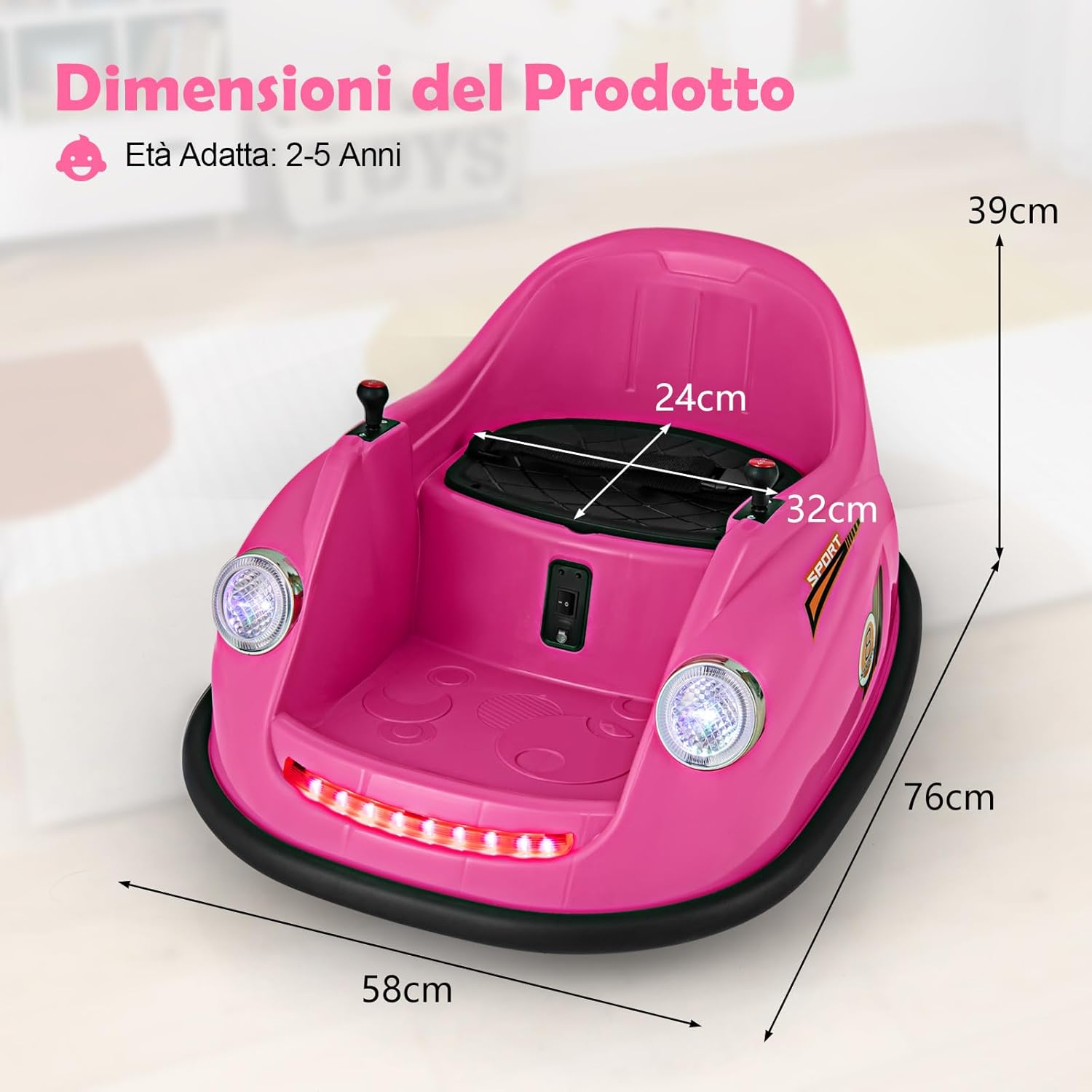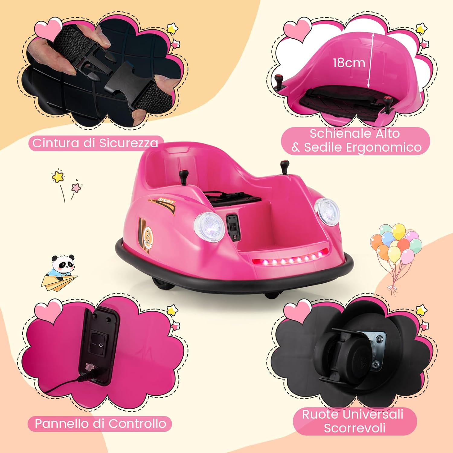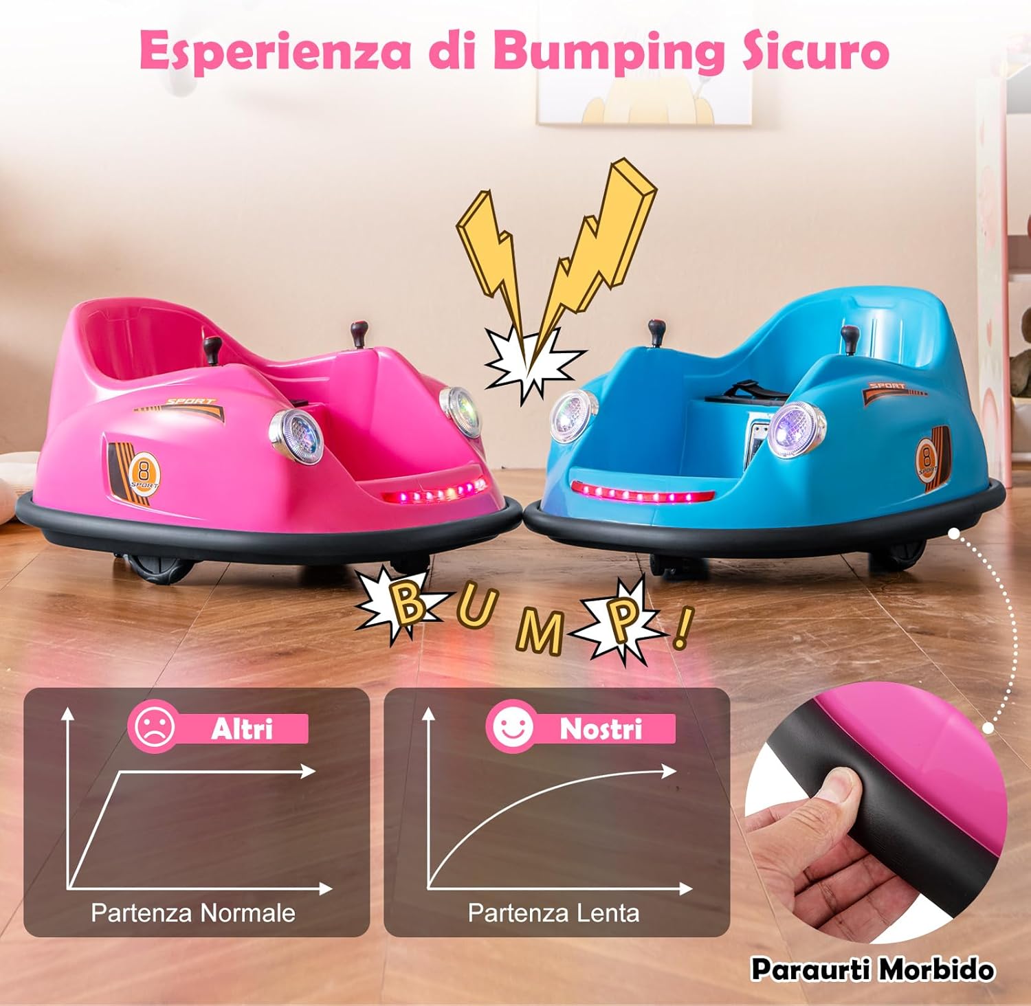 # Girevole a 360 gradi # Con un design girevole a 360 gradi, questo veicolo motorizzato paraurti consente al bambino di guidare in tutte le direzioni per un maggiore divertimento. La funzione di partenza lenta garantisce un viaggio sicuro ed emozionante per il bambino. # 2 modalità di controllo # Dotato di un telecomando che consente ai genitori di controllare il veicolo motorizzato a proprio piacimento, include anche una modalità joystick che consente ai bambini più piccoli di guidare in modo indipendente. Questo aiuta i bambini a sviluppare le capacità motorie divertendosi al volante. # Emozionanti effetti luminosi e sonori # Questa macchinina è dotata di fari a LED e strisce luminose colorate per offrire al bambino un'esperienza visiva emozionante. Inoltre, i bambini possono premere il pulsante della musica e scegliere le loro canzoni preferite. # Alte prestazioni e design sicuro # Questo autoscontro elettrico è alimentato da 2 potenti motori da 12 V per prestazioni superiori. Inoltre, la cintura di sicurezza regolabile assicura che i bambini siano seduti in sicurezza durante il gioco. # Regalo perfetto per i bambini # Deliziate i vostri bambini con questa auto elettrica con paraurti! È un divertimento e un'opportunità di apprendimento, ideale sia per l'uso interno che esterno. È sicuramente il regalo perfetto per i bambini dai 2 ai 5 anni.