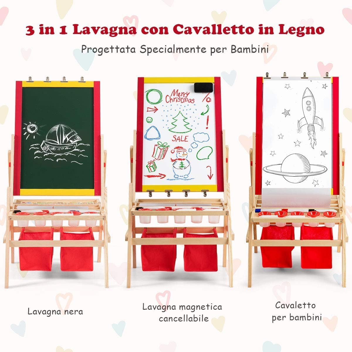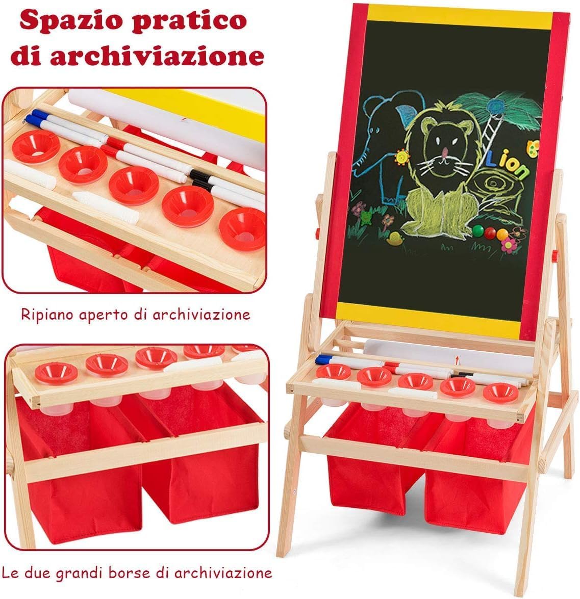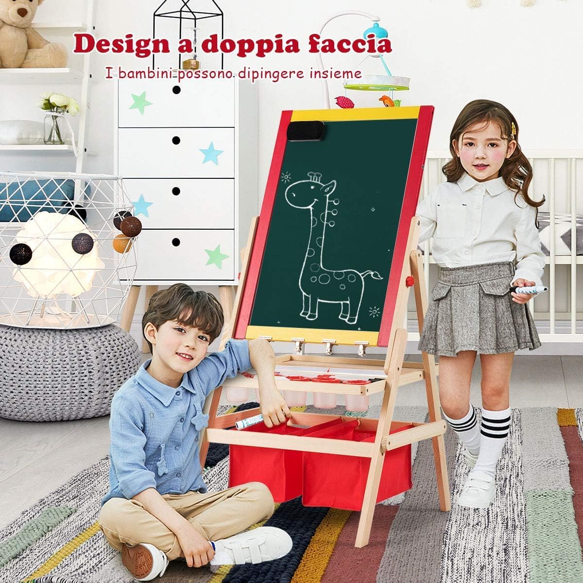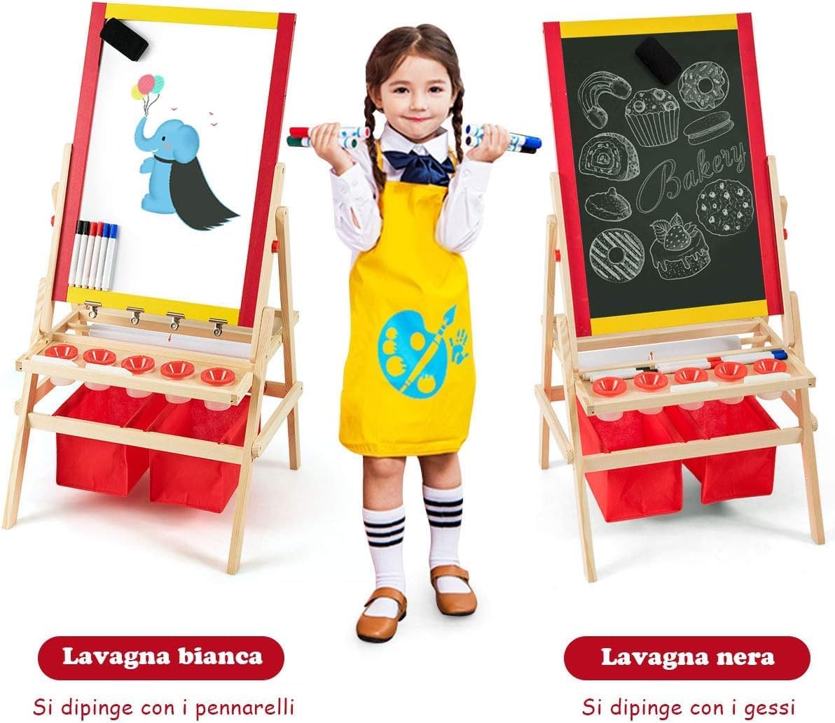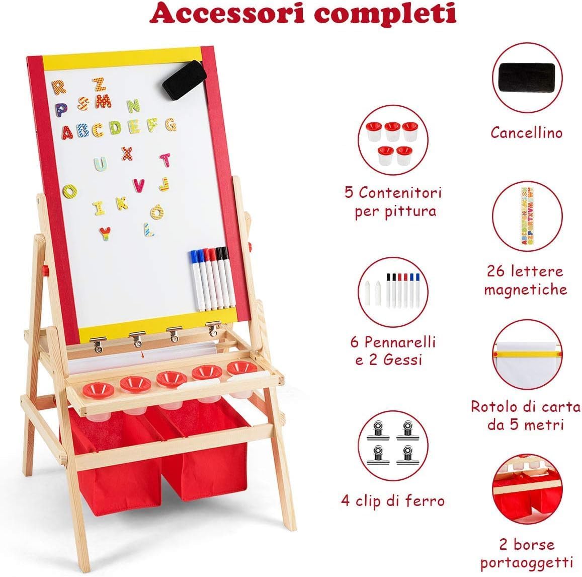 # Sicuro e resistente # Guardando l'immagine, vi accorgerete che i lati di questo cavalletto per bambini sono triangolari, è fatto di legno, in particolare il telaio è in pino, è robusto e durevole, non traballa. # Sicuro e resistente # Guardando l'immagine, vi accorgerete che i lati di questo cavalletto per bambini sono triangolari, è fatto di legno, in particolare il telaio è in pino, è robusto e durevole, non traballa. # Facile da usare # Viene fornito con un set completo di accessori, tra cui quattro clip metalliche e un rotolo di carta da disegno di 5 metri. La carta viene riposta sull'asta del cavalletto e rischia di sporcarsi meno. Il supporto in ferro tiene la carta in posizione. # Borse per la conservazione # Abbiamo fornito due comode borse rosse in cui riporre tutti gli accessori. Il bambino può anche riporre tutti gli altri articoli di cancelleria per rendere la stanza più ordinata. # Angolo regolabile # La lavagna del cavalletto è inclinata e l'angolo è regolabile. È possibile ruotare le manopole rosse su entrambi i lati del cavalletto per regolare la lavagna all'angolazione giusta per il proprio comfort.