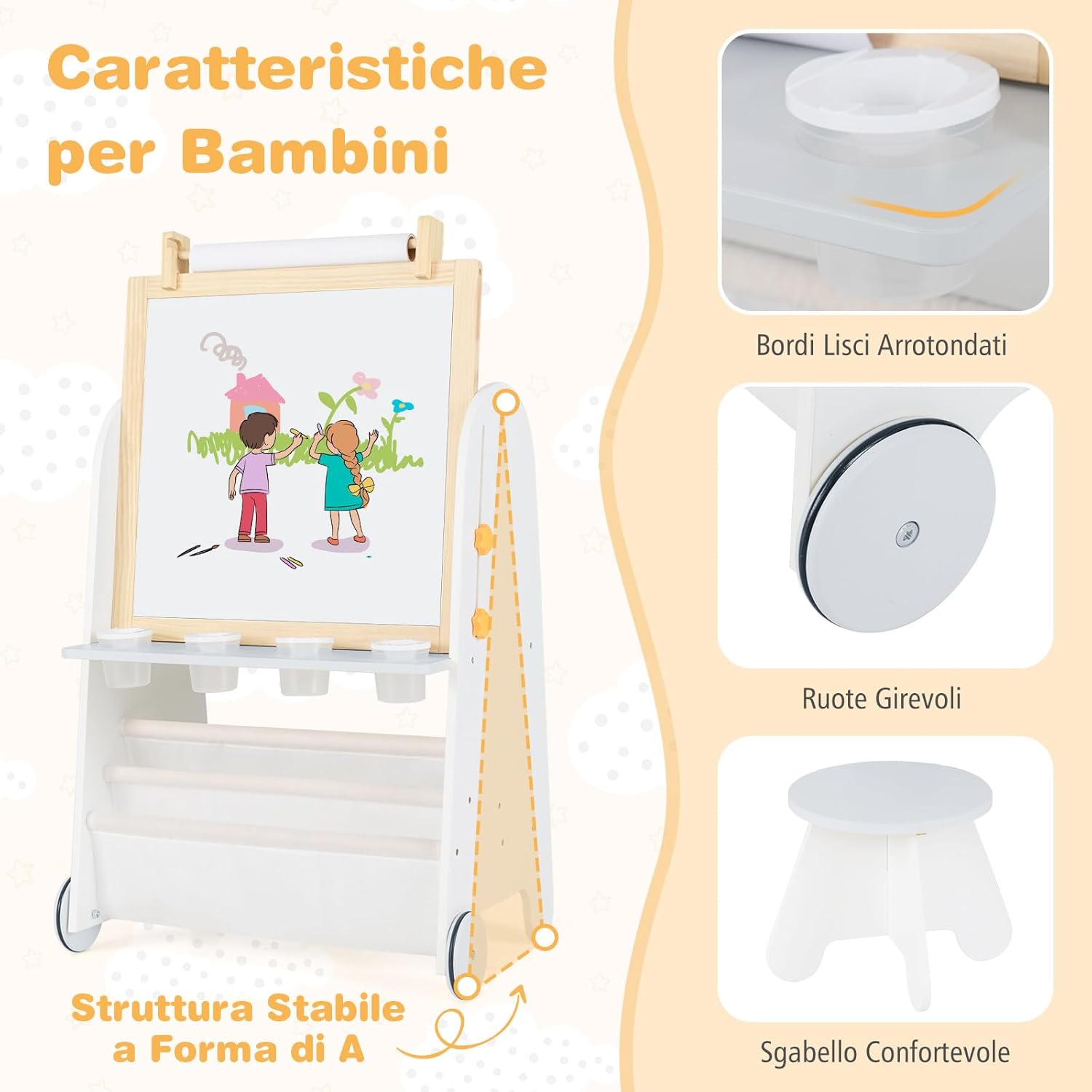 # Design quattro in uno # Ispira la creatività disegnando, scarabocchiando o scrivendo con questo cavalletto artistico per bambini che include una lavagna magnetica, una lavagna con gesso e rulli di carta intercambiabili. Inoltre, lo spazioso tavolo è perfetto per una varietà di attività, dalla lettura di libri alla realizzazione di oggetti di artigianato. # Il regalo ideale per i bambini in crescita # Questo cavalletto da tavolo cresce con il bambino grazie all'altezza regolabile in continuo da 92 cm a 105 cm. Ideale per bambini dai 3 anni in su, questo set, che comprende un tavolo e uno sgabello, è un ottimo regalo di compleanno o di Natale per bambini e bambine. # Maggiore sicurezza e stabilità # Progettato pensando alla sicurezza del bambino, questo set di tavolo e sgabello per bambini presenta angoli arrotondati e morbidi per evitare lesioni, mentre la struttura ad A mantiene stabile il cavalletto. # Pratica soluzione di stoccaggio # Il cavalletto artistico per bambini è dotato di un ampio vassoio per gli attrezzi con 4 tazze per i colori, 2 sacchetti di stoffa e un ripiano inferiore, per garantire che tutti i materiali artistici e i libri siano organizzati e facilmente accessibili. # Mobilità e accessori pratici # Il tavolo artistico è dotato di due grandi ruote che lo rendono facile da spostare da una stanza all'altra. Inoltre, il set di cavalletti per bambini comprende 5 gessetti colorati, 4 tazze di vernice, una gomma e un rotolo di carta.