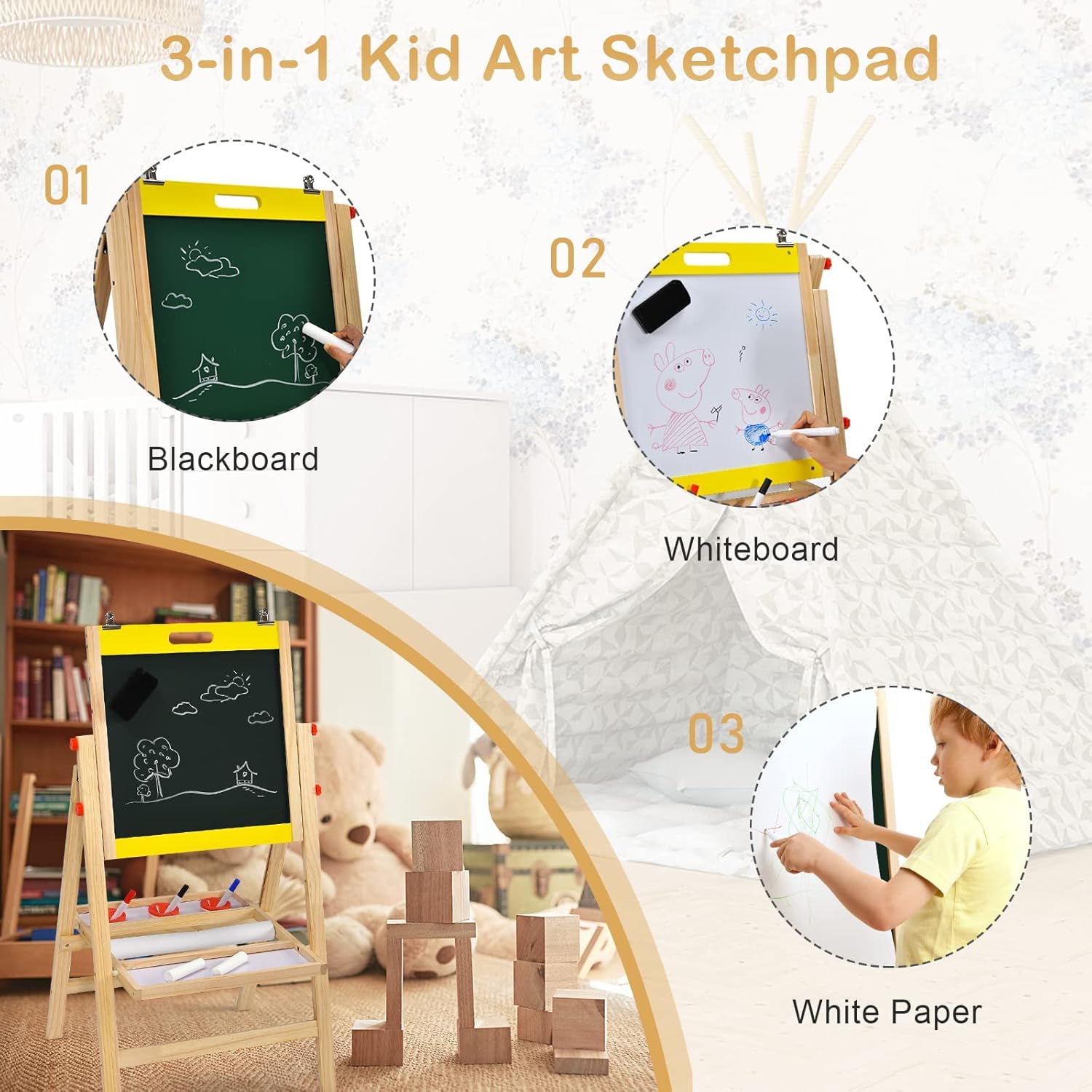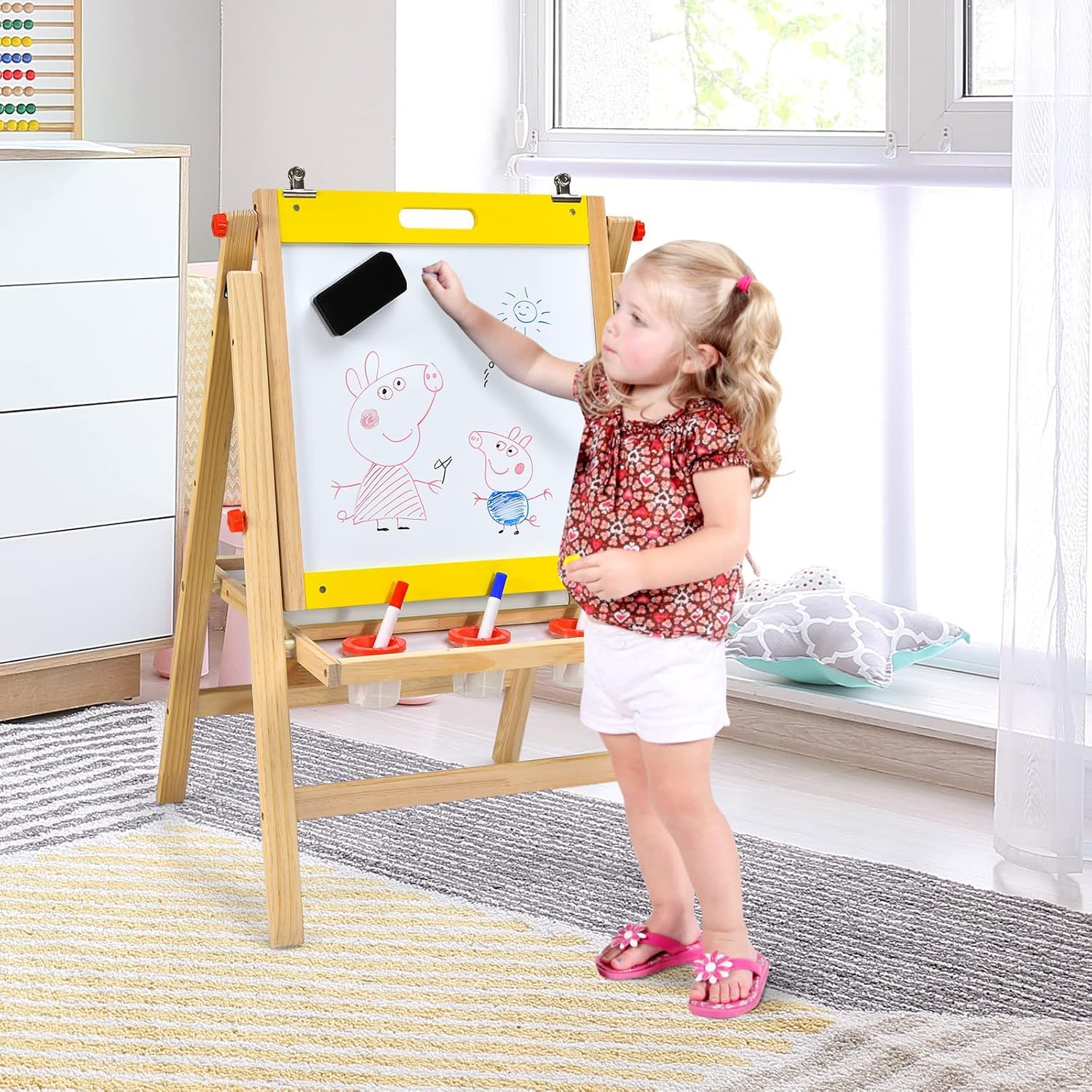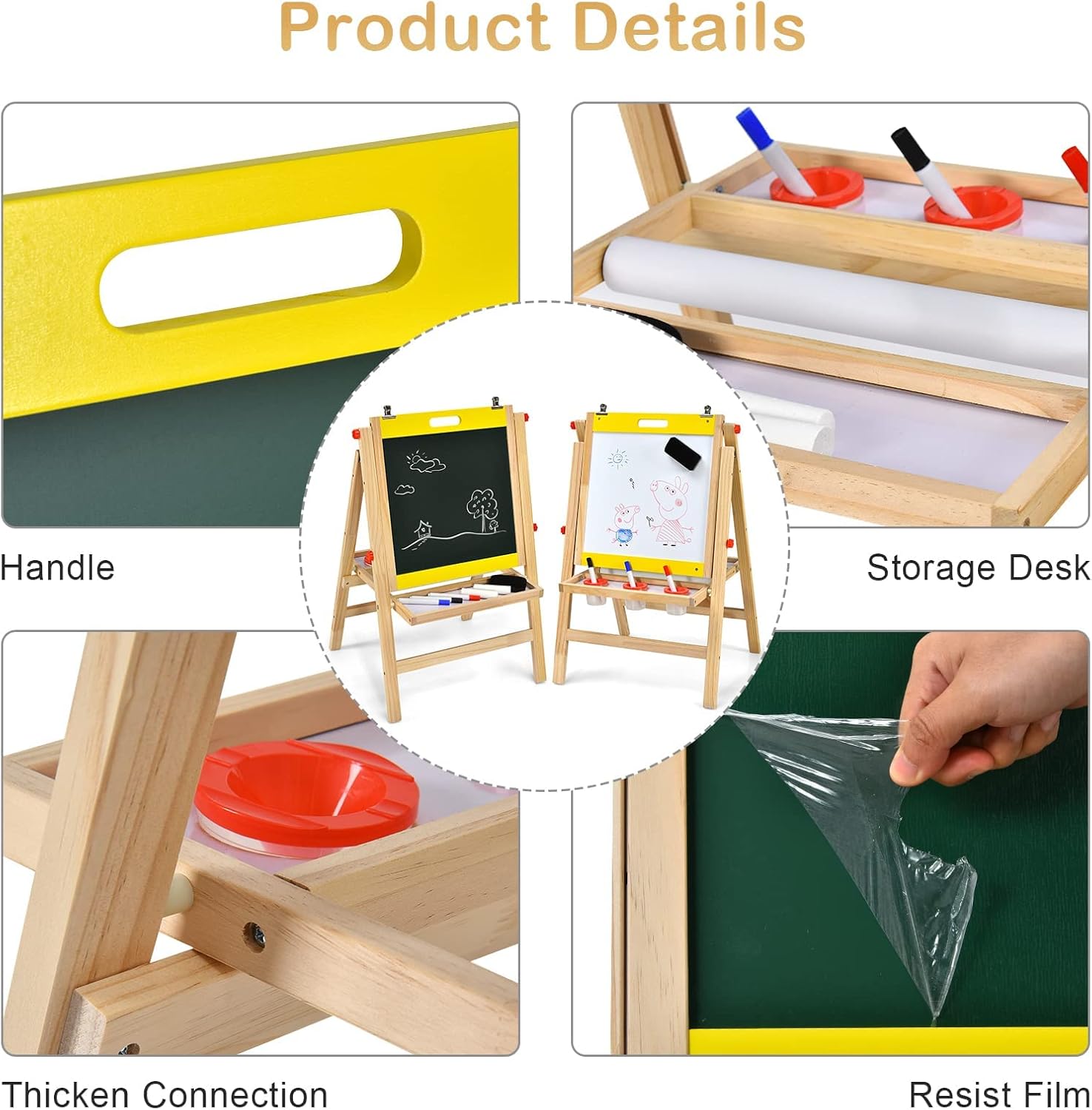 # Design pratico # Questo cavalletto bambini utilizza il legno come struttura principale e la forma triangolare può garantire equilibrio e non tremerà quando viene utilizzata. Inoltre, questo cavalletto ha cinque diverse altezze regolabili che possono adattarsi alla statura dei bambini e accompagnarli nella crescita. # Design tre in uno # Il nostro cavalletto per Bambini ha una lavagna nera e una bianca. Se ci sono due bambini in casa, possono creare contemporaneamente su questo cavalletto. Inoltre, viene fornito anche un rotolo di carta da disegno che può salvare ogni disegno del bambino. # Stimola la creatività dei bambini # Quando due bambini dipingono contemporaneamente sul cavalletto, possono comunicare mentre disegnano, il che non solo promuove la loro amicizia, ma li fa anche innamorare del disegno. Inoltre, i bambini possono riconoscere diversi colori nel processo creativo e coltivare la loro concentrazione. # Risparmio di spazio # C'è un ripiano sotto la lavagna che può essere utilizzato per posizionare pennelli, libri, giocattoli, cancellino e altri oggetti. Inoltre, il nostro cavalletto può ancora essere piegato, quindi può non solo risparmiare spazio, ma anche facilitare il trasporto. # Il regalo perfetto # Se a tuo figlio piace disegnare o se si sta esercitando a disegnare, questo cavalletto sarà il regalo ideale! Può essere posizionato all'interno o all'esterno e, quando il bambino sta creando, i genitori possono accompagnarlo e guidarlo per migliorare la relazione genitore-figlio.