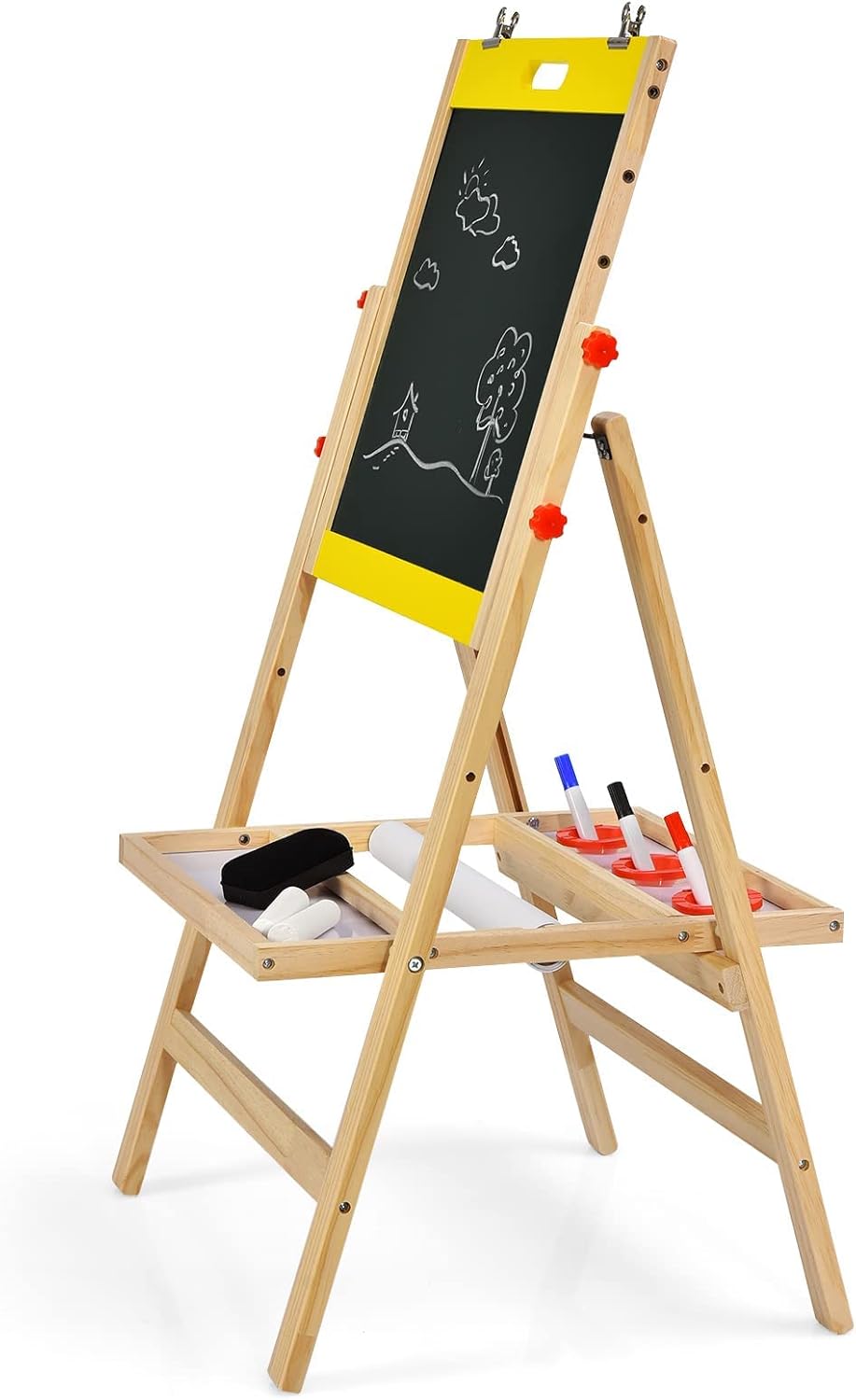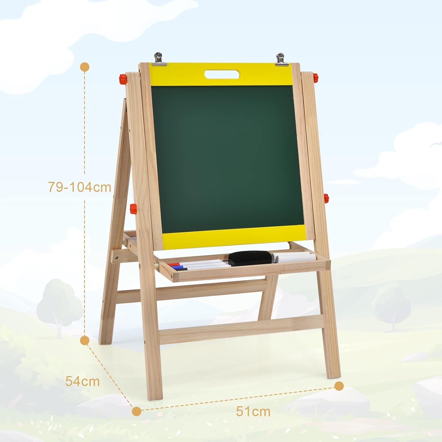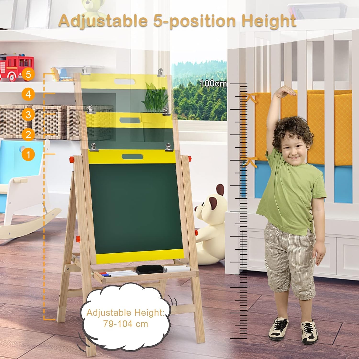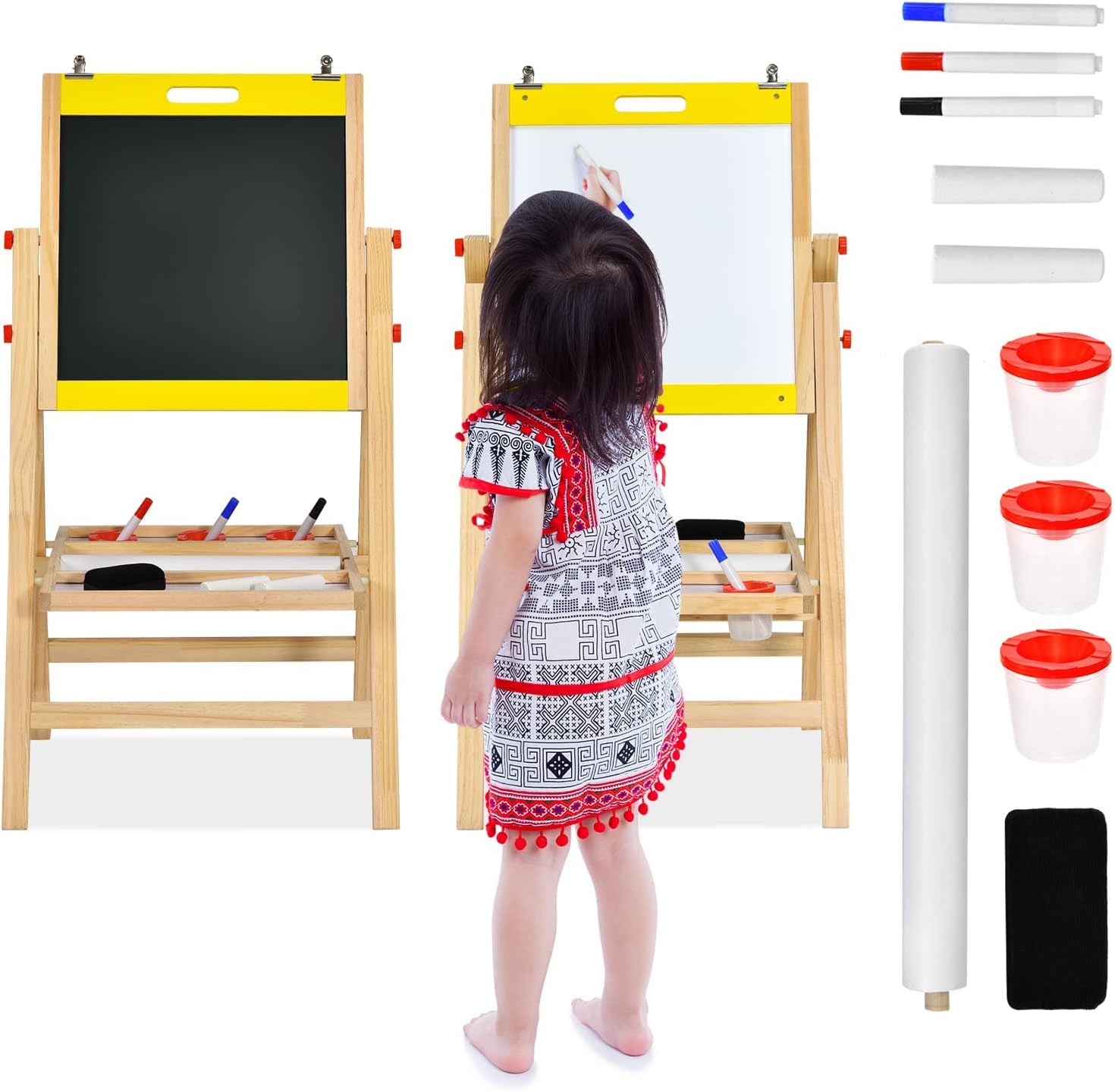 # Design pratico # Questo cavalletto bambini utilizza il legno come struttura principale e la forma triangolare può garantire equilibrio e non tremerà quando viene utilizzata. Inoltre, questo cavalletto ha cinque diverse altezze regolabili che possono adattarsi alla statura dei bambini e accompagnarli nella crescita. # Design tre in uno # Il nostro cavalletto per Bambini ha una lavagna nera e una bianca. Se ci sono due bambini in casa, possono creare contemporaneamente su questo cavalletto. Inoltre, viene fornito anche un rotolo di carta da disegno che può salvare ogni disegno del bambino. # Stimola la creatività dei bambini # Quando due bambini dipingono contemporaneamente sul cavalletto, possono comunicare mentre disegnano, il che non solo promuove la loro amicizia, ma li fa anche innamorare del disegno. Inoltre, i bambini possono riconoscere diversi colori nel processo creativo e coltivare la loro concentrazione. # Risparmio di spazio # C'è un ripiano sotto la lavagna che può essere utilizzato per posizionare pennelli, libri, giocattoli, cancellino e altri oggetti. Inoltre, il nostro cavalletto può ancora essere piegato, quindi può non solo risparmiare spazio, ma anche facilitare il trasporto. # Il regalo perfetto # Se a tuo figlio piace disegnare o se si sta esercitando a disegnare, questo cavalletto sarà il regalo ideale! Può essere posizionato all'interno o all'esterno e, quando il bambino sta creando, i genitori possono accompagnarlo e guidarlo per migliorare la relazione genitore-figlio.