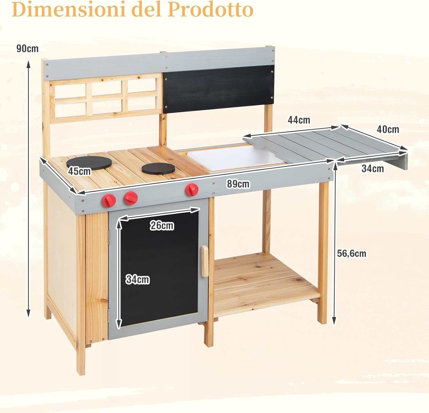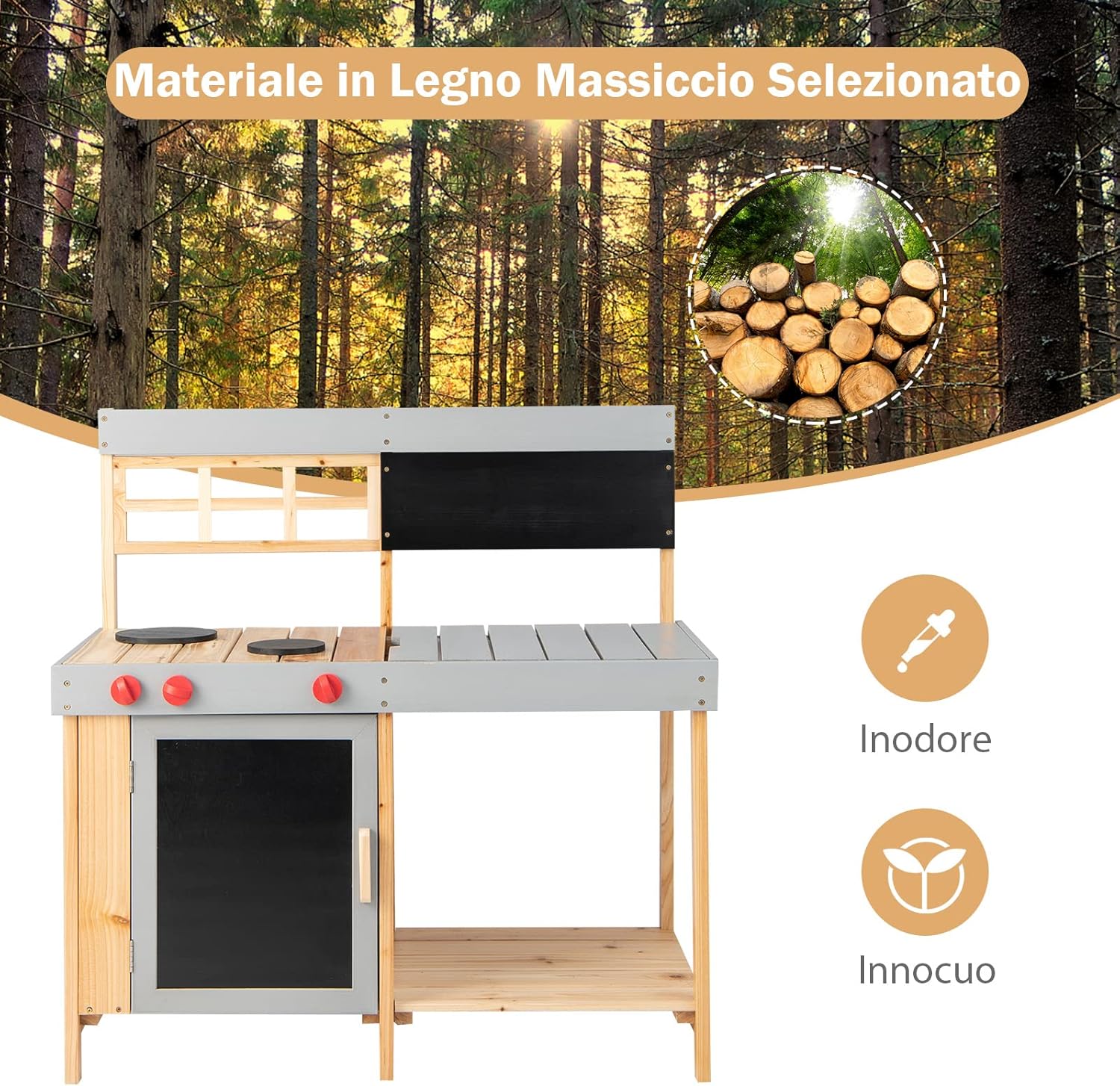 ⭐# Caratteristiche realistiche # Questo kit da cucina realistico è dotato di un ampio fornello per consentire ai bambini di fingere di cucinare i loro cibi. Possono anche ruotare le manopole per emettere un suono "click" e aprire il rubinetto per far scorrere l'acqua e divertirsi a cucinare. Inoltre, i bambini possono fare torte di fango nel lavandino rimovibile. ⭐# Spazio di archiviazione # 3 ganci per gli utensili da cucina, 3 ripiani per gli utensili da cucina e 1 ripiano superiore per gli accessori da cucina. Lo spazio di archiviazione suddiviso per categorie della cucina da esterno aiuta i bambini a organizzare correttamente le loro cose dopo il gioco. ⭐# Materiali selezionati # Il set da cucina è realizzato in legno di abete naturale al 100%, atossico e inodore, sicuro per i bambini. Inoltre, la struttura in legno massiccio garantisce una lunga durata del set. Gli angoli arrotondati proteggono la pelle del bambino dai graffi durante il gioco. ⭐# Regalo perfetto # La cucina per bambini è un giocattolo per la famiglia appositamente progettato per i bambini. Sviluppando la creatività e le abilità sociali, i bambini possono crescere con uno sviluppo più versatile. È il miglior regalo per ragazzi e ragazze per la festa dei bambini o il compleanno, ecc. ⭐# Facile montaggio # Viene fornito con un manuale d'uso dettagliato e, utilizzando la ferramenta inclusa e seguendo le istruzioni passo-passo, i genitori possono facilmente assemblare tutti i pannelli in modo che il bambino possa godersi questo giocattolo il prima possibile.
