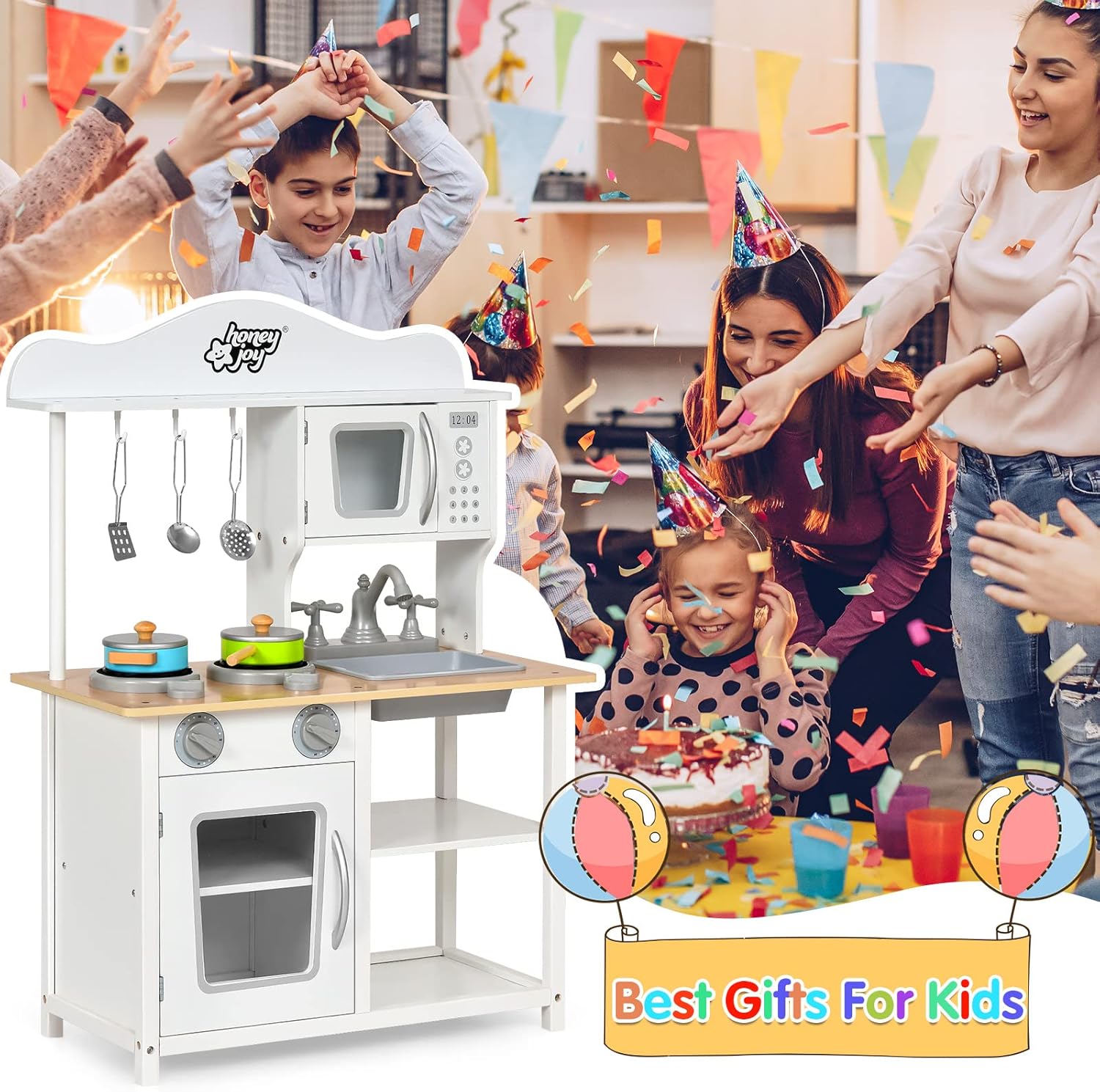 # Cucina completa e pratica # Dotata della maggior parte degli utensili da cucina, come un lavello, un fornello, una pentola e una padella. Le grandi mensole aperte sono sufficienti per riporre gli elementi essenziali della cucina. La lunga griglia per appendere è pratica per accedere al panno di pulizia e agli utensili da cucina. # Esperienza di cottura reale # Il rubinetto simulato può essere girato liberamente. Inoltre, il simulatore di fornello con luci e suoni rende questa cucina ancora più divertente! Il riconoscimento delle combinazioni, la capacità di manipolazione e la creatività oltre l'immaginazione saranno sviluppati. # Costruzione di qualità e rispettosa dell’ambiente # Realizzati in pannello durevole, i nostri giocattoli di cucina educativa sono considerati un prodotto di consumo sicuro e di alta qualità. I vostri bambini possono godersi il tempo in cucina subito dopo il facile assemblaggio. # Facile da assemblare e da pulire # Tutte le parti permettono un rapido assemblaggio. Tutti i materiali e un manuale dettagliato sono inclusi. Un lavello in plastica può essere facilmente rimosso per la pulizia. Rivestito con impiallacciatura liscia, questo set di cucina è anche facile da pulire con un panno umido. # Regalo creativo # Con questo set di giochi di cucina, i bambini possono non solo preparare un pasto basato sulla loro immaginazione, ma possono anche realizzare le loro opere con i genitori o con gli amici. È il miglior regalo per il compleanno dei vostri bambini, per Natale!