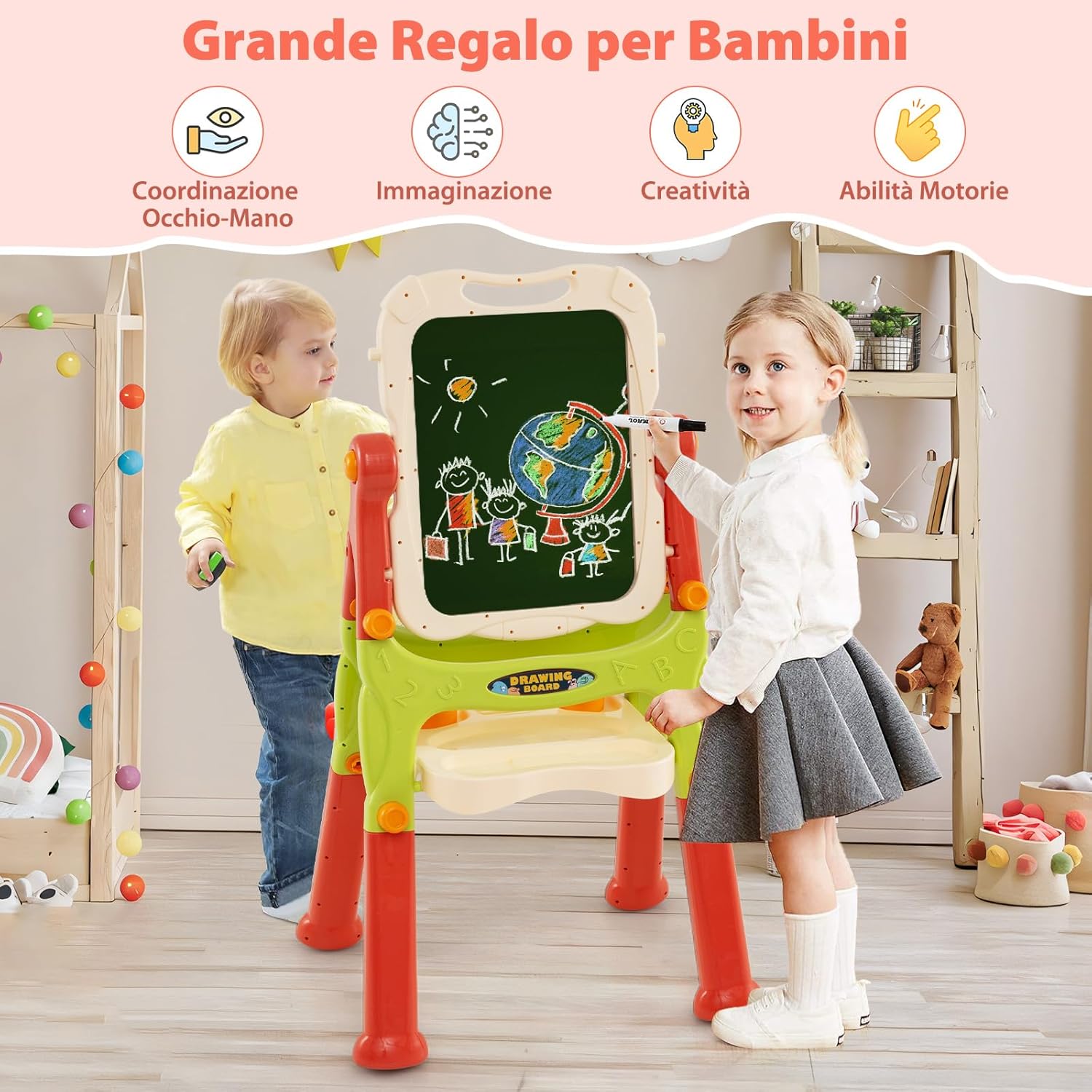 # Altezza regolabile per i piccoli pittori # Progettato con gambe rimovibili, questo cavalletto per bambini offre due opzioni di altezza (110 cm/81 cm) per adattarsi alla crescita dei bambini. È comodamente configurabile e perfetto per il gioco creativo dei bambini dai 3 anni in su. # Rotazione a 360° su entrambi i lati # Il cavalletto ha una lavagna magnetica su un lato e una lavagna a gesso sull'altro, incoraggiando così diverse forme di espressione artistica. Inoltre, il design girevole a 360° permette ai bambini di passare senza sforzo da un lato all'altro, perfetto per disegnare e scrivere. # Costruzione sicura e durevole # Il cavalletto verticale per bambini è realizzato in materiale PP di alta qualità con bordi arrotondati e lisci per garantire un utilizzo sicuro da parte dei bambini durante il gioco. La stabile struttura triangolare garantisce una maggiore stabilità ed equilibrio, perfetta per l'uso a casa o in classe. # Il miglior regalo per i bambini # Il cavalletto magnetico per bambini ha un design elegante con funzione bifacciale che incoraggia i fratelli o gli amici a giocare e creare insieme. Aiuta a sviluppare l'immaginazione, la creatività e la coordinazione motoria dei bambini, rendendolo un regalo perfetto per ragazzi e ragazze. # Comoda funzione # Il tavolo da disegno rimovibile può essere utilizzato sul piano di lavoro per disegnare in modo più mirato. 1 grande vassoio e 2 tazze per disegnare tengono in ordine pennarelli, gessetti e gomme.