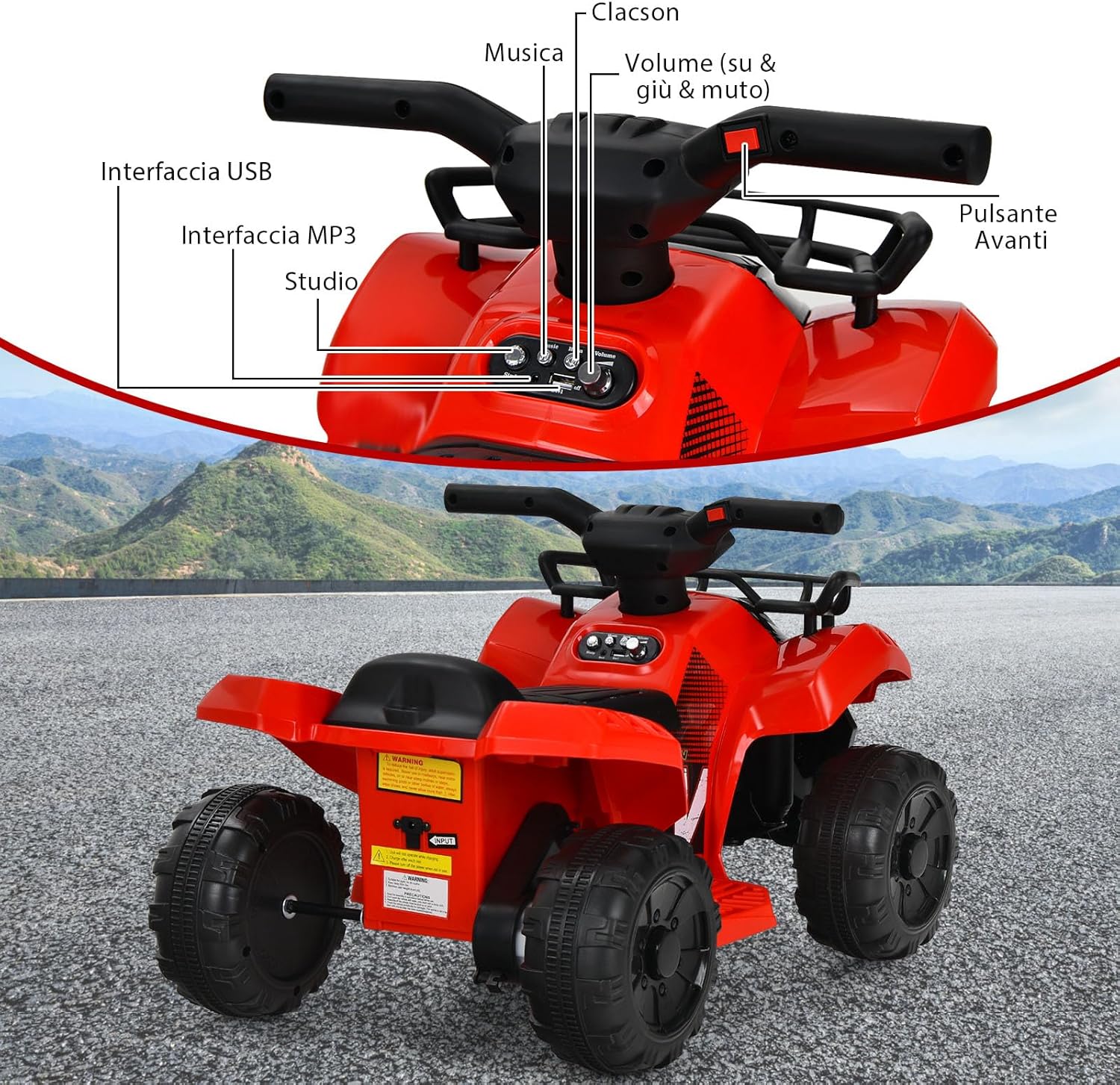 # Esperienza di guida rilassante # la nostra auto elettrica per bambini ha un aspetto realistico ed è facile e veloce da usare, i bambini devono solo sedersi, premere il pulsante di avanzamento e partire. La velocità di 2 km/h è molto sicura per i bambini. Dopo una ricarica completa, il bambino può godere di circa 40 minuti di guida libera. # Quad sicuro e dettagli realistici # realizzato in PP e metallo di alta qualità, può sostenere fino a 20 kg. L'ampio poggiapiedi e il sedile rendono la guida più confortevole; inoltre, dotato di un vano portaoggetti e di un pannello di controllo facile da usare, ha una funzione musicale e luci a LED. # Buggy 4x4 con 4 ruote resistenti # Il design a 4 ruote fa sì che questa auto per bambini non perda facilmente l'equilibrio. I pneumatici sono stampati a iniezione, antiscivolo e resistenti all'usura e possono circolare su strade diverse come asfalto, ghiaia, mattoni, ecc. # Regalo ideale # questo quad elettrico per bambini ha un aspetto realistico che lo rende il regalo ideale per il vostro piccolo. Che si tratti di un compleanno o di Natale, sarà qualcosa che catturerà l'attenzione del bambino. Inoltre, svilupperà il loro interesse per la guida, la coordinazione delle mani e dei piedi e sarà molto educativo! # Facile da installare # La nostra auto per bambini viene fornita preassemblata, quindi tutto ciò che dovete fare è montare il manubrio, i pneumatici e il sedile e collegarla all'alimentazione. Grazie alle nostre istruzioni passo-passo, potrete essere certi di completare rapidamente l'installazione e lasciare che il vostro bambino si diverta a diventare un piccolo pilota il prima possibile.