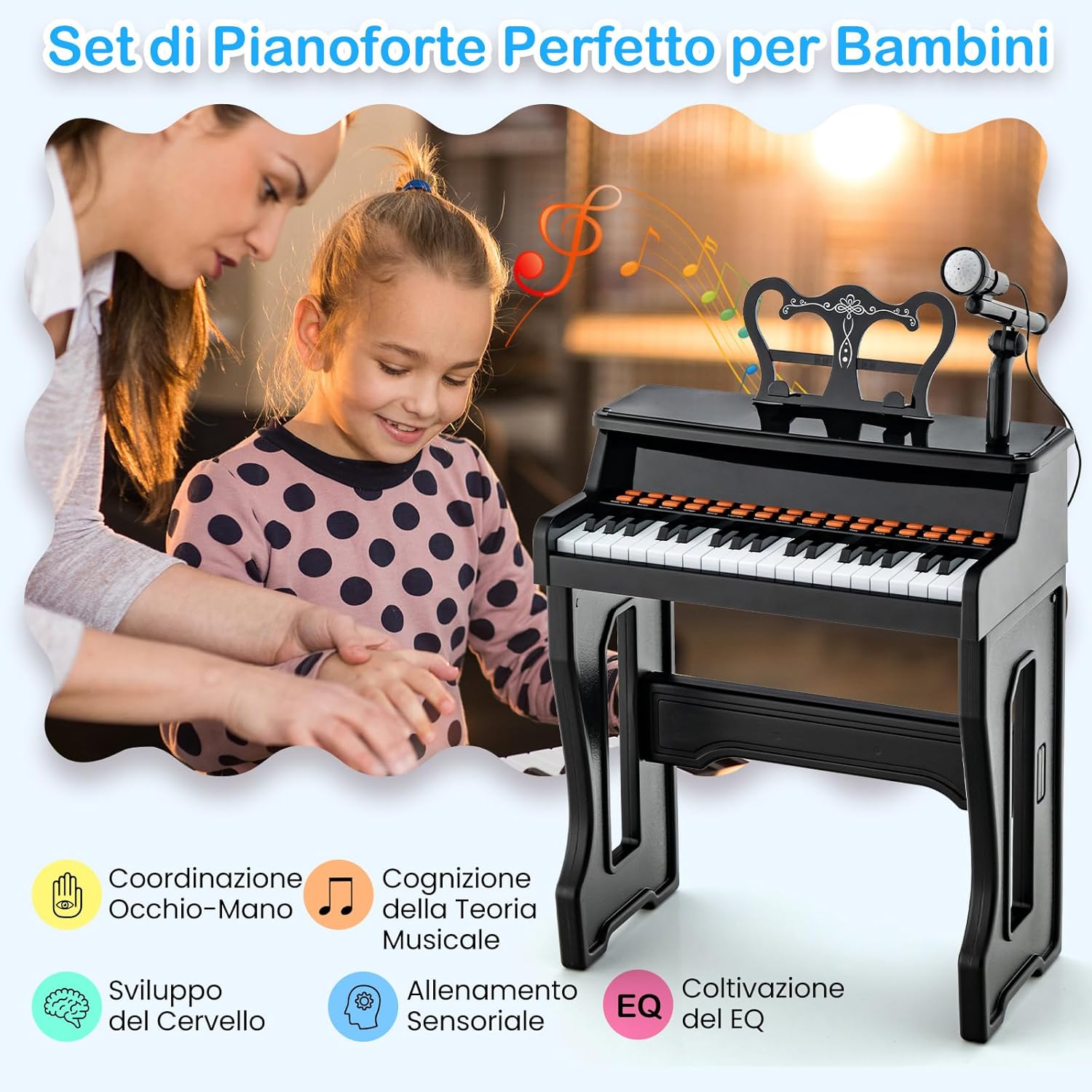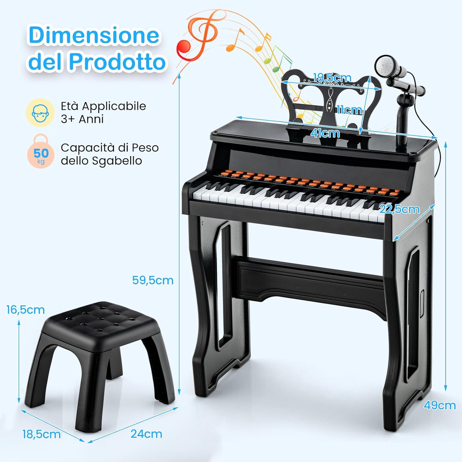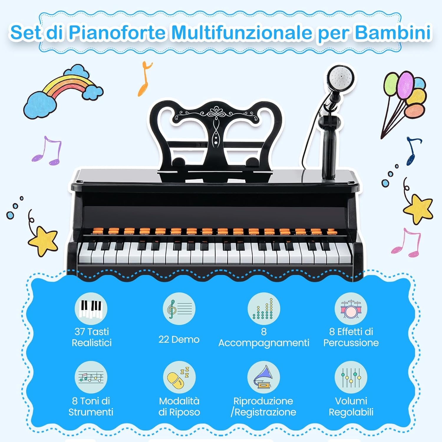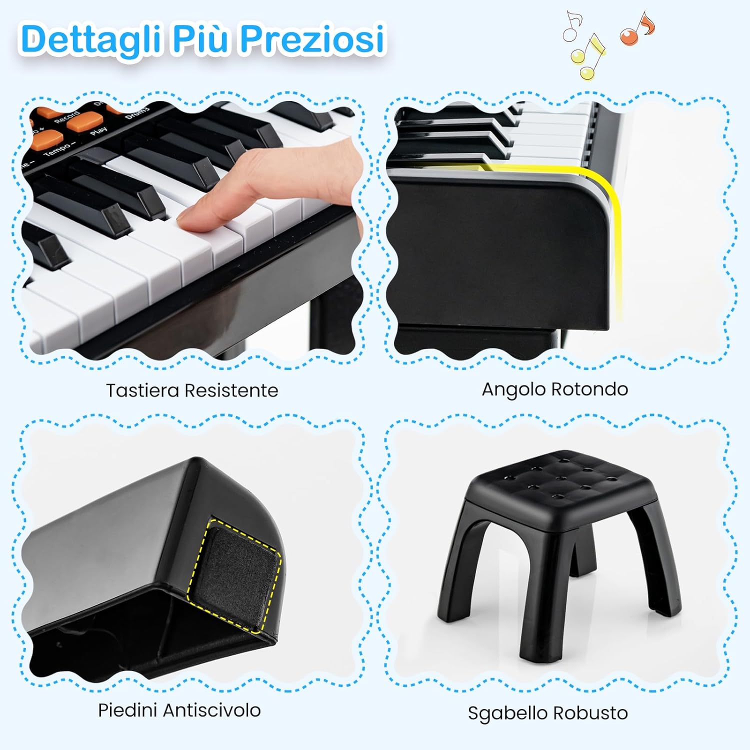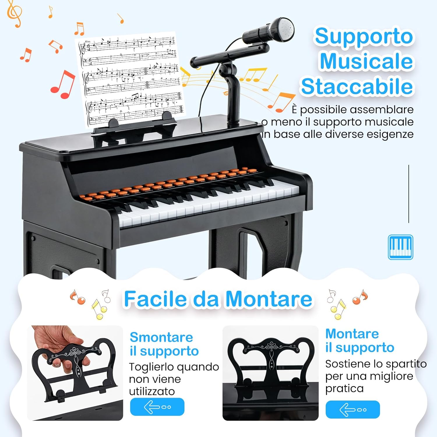 # Set di pianoforte per bambini multifunzionale # Questo set di pianoforte offre 37 tasti realistici e resistenti che permettono ai bambini di creare la propria musica. Inoltre, la tastiera multifunzionale vanta 22 demo, 8 effetti di percussioni, 8 toni strumentali, 8 accompagnamenti per un'esperienza di gioco coinvolgente. # Mostra la tua voce cantando # Il microfono può essere collegato al microfono e al lettore MP3, consentendo ai bambini di divertirsi senza fine. Incoraggia i bambini a cantare mentre suonano il pianoforte, promuovendo fiducia e divertimento. Il microfono è anche regolabile, progettato per soddisfare specifiche esigenze individuali. # Spartito removibile # Questo pianoforte elettronico per bambini a 37 tasti è dotato di uno spartito removibile che supporta la partitura per una pratica migliore ed è facile da montare. Inoltre, i tuoi bambini possono montare o smontare lo spartito in base alle diverse esigenze. Basta toglierlo quando non è in uso. # Meraviglioso regalo di Natale # Questo capolavoro educativo aiuta i bambini a migliorare la loro conoscenza della teoria musicale e la capacità di coordinamento occhio-mano. Nel frattempo, il giocattolo del pianoforte è benefico per lo sviluppo cerebrale dei bambini, l'allenamento sensoriale e la coltivazione dell'EQ, rendendolo un regalo di Natale ideale. # Design più sicuro # Questo set di pianoforte per bambini enfatizza la sicurezza in ogni dettaglio, con angoli arrotondati per evitare urti e graffi accidentali. Inoltre, uno sgabello robusto con piedini antiscivolo sostiene comodamente tuo figlio durante l'esercizio e la performance, offrendo un ambiente sicuro e senza preoccupazioni per l'esplorazione musicale.