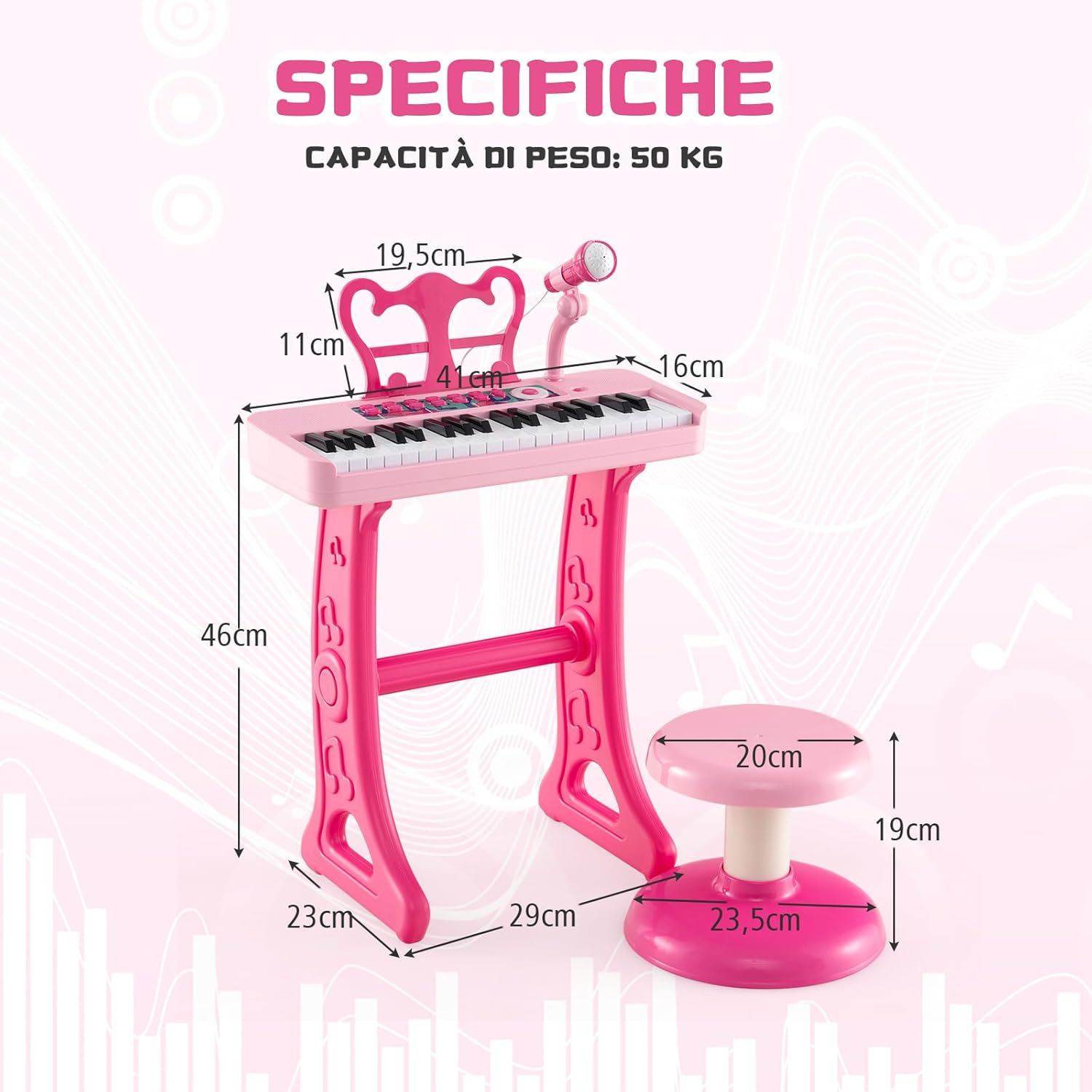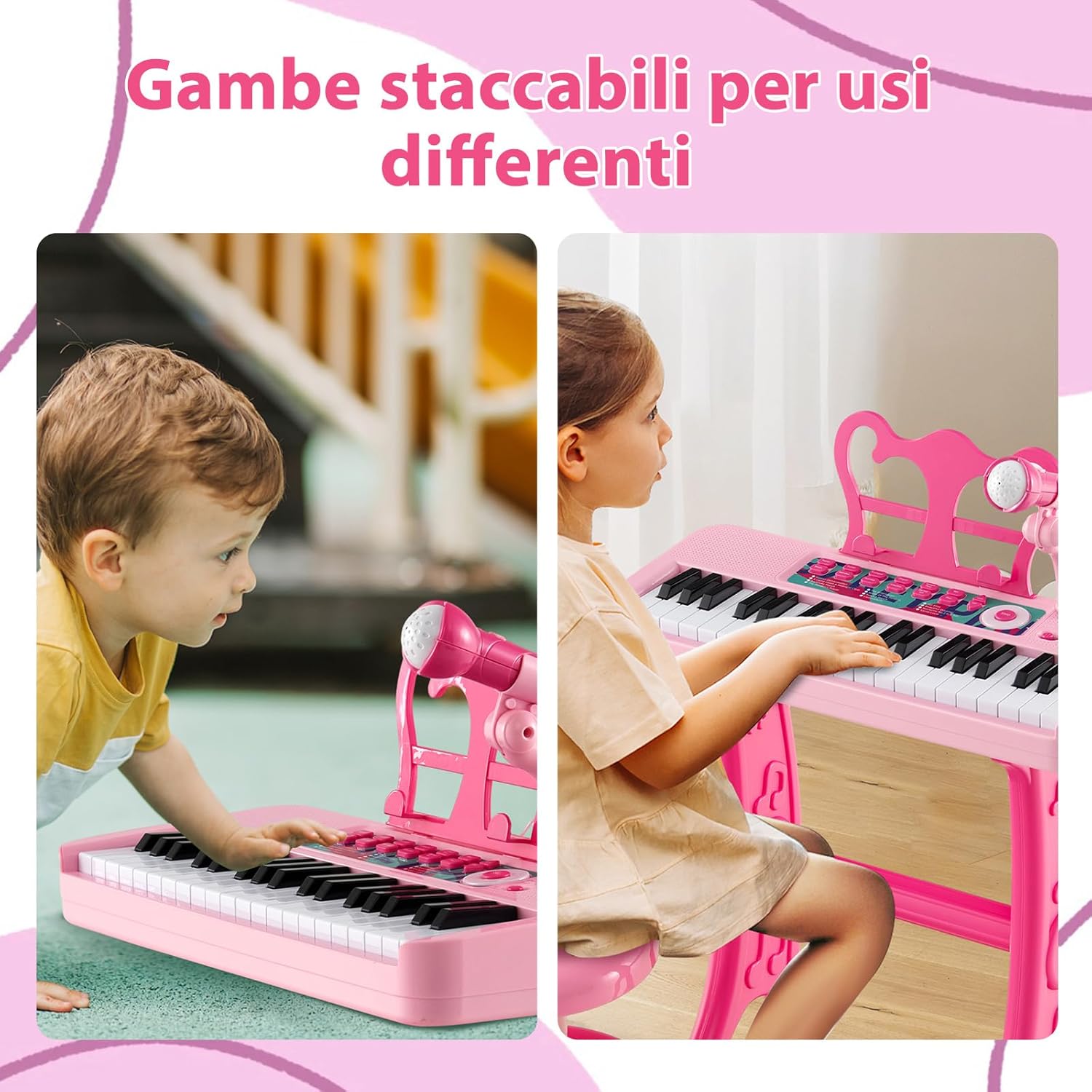 # Il regalo perfetto per i bambini # Questo pianoforte elettronico promuove la coordinazione occhio-mano, la musicalità, l'allenamento della memoria e lo sviluppo sensoriale, rendendolo un regalo ideale per l'educazione musicale. # Una varietà di divertimento giocoso # Con 22 canzoni, 4 suoni di strumenti, 4 accompagnamenti e 15 volumi regolabili, questo baby piano offre infinite possibilità di intrattenimento. Il supporto rimovibile consente di suonare da seduti o sul pavimento. # Sgabello robusto e supporto rimovibile # I nostri robusti sgabelli rotondi possono sostenere fino a 50 kg e offrono un posto sicuro e confortevole per sedersi. Il supporto rimovibile offre spazio per spartiti o libri. # Microfono regolabile # Il microfono può essere inclinato di 120° verso l'alto e verso il basso e di 360° a sinistra e a destra, facilitando ai bambini la posizione perfetta per cantare. Con il microfono, i bambini possono suonare e cantare allo stesso tempo, aggiungendo un elemento interattivo. # Dettagli a misura di bambino # I tasti della mini tastiera sono progettati per adattarsi alle dita dei bambini, offrendo un'esperienza di gioco realistica e divertente. I bordi lisci garantiscono la sicurezza durante il gioco.
