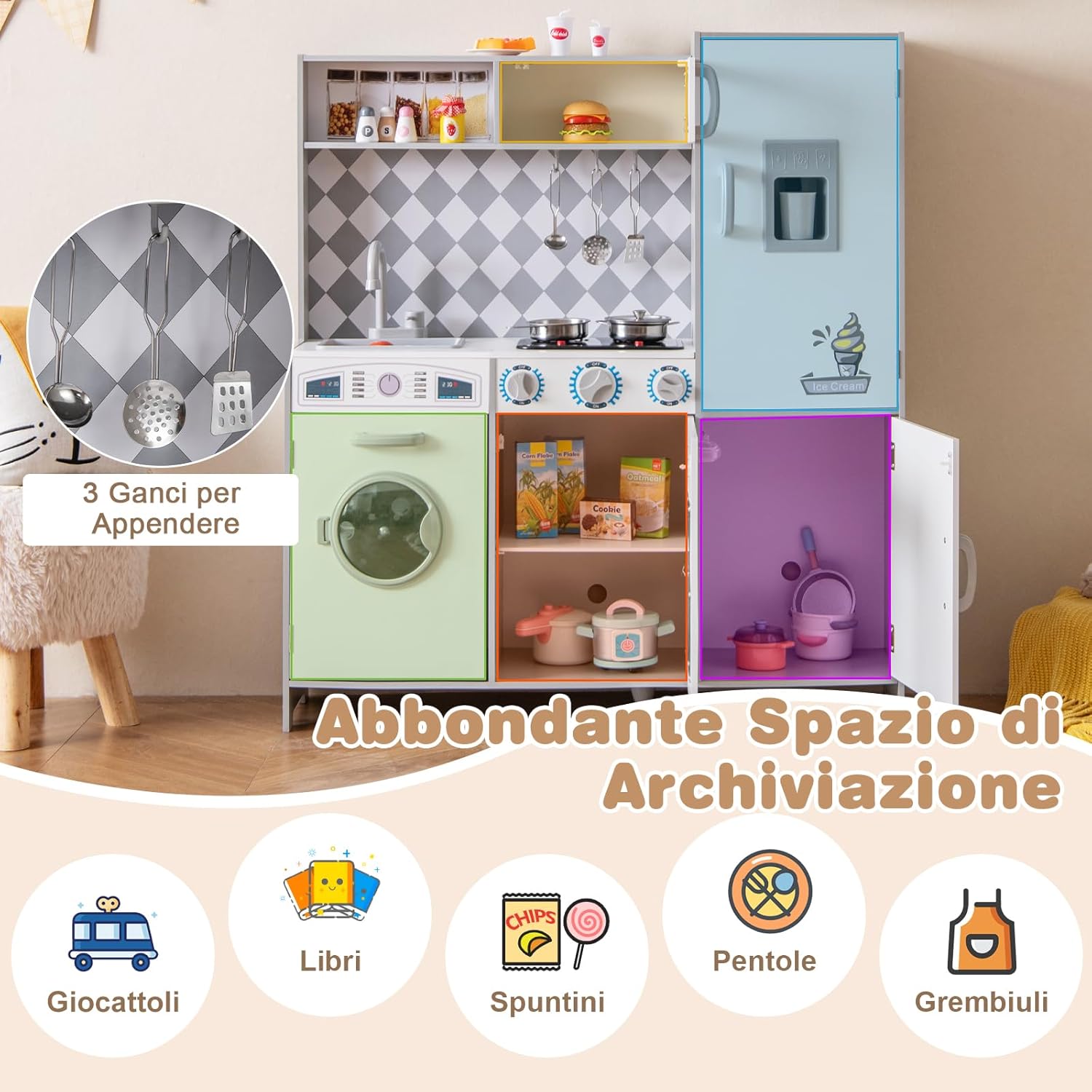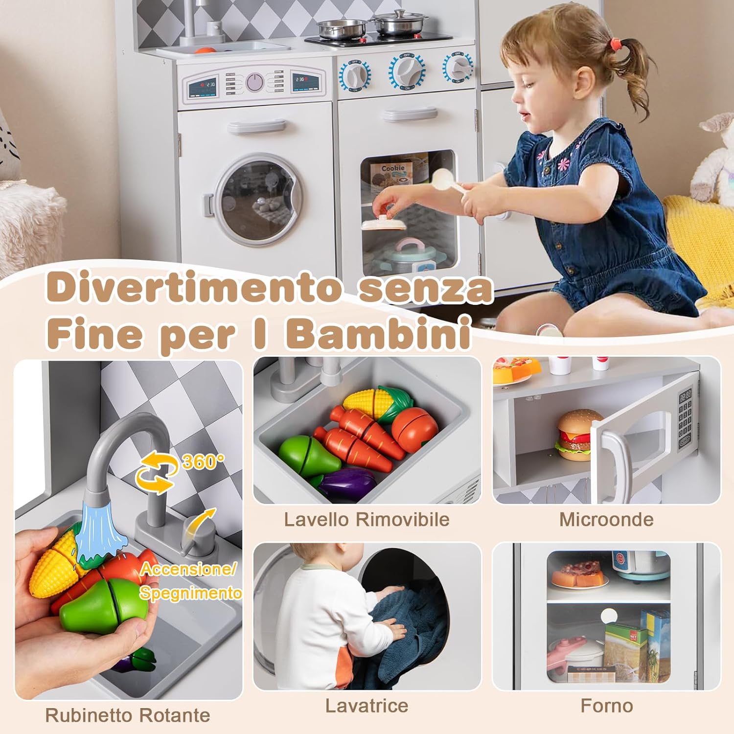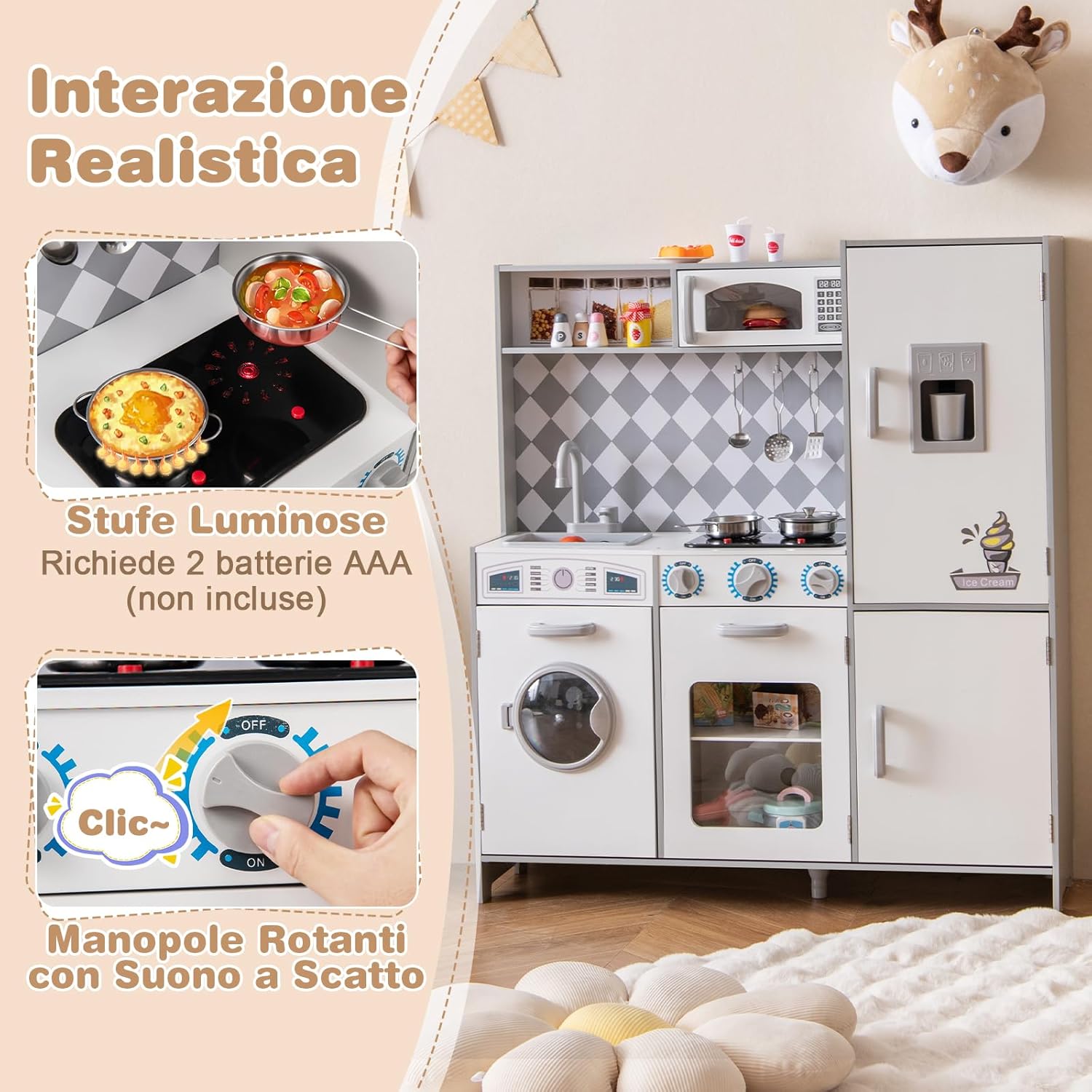 # Interazione realistica # Il fornello si illumina ed emette suoni di cottura realistici per migliorare l'esperienza di gioco dello chef (Nota: richiede 2 batterie AAA, non incluse). Inoltre, le manopole emettono suoni di scatto quando vengono girate, aumentando ulteriormente il realismo del gioco e mettendo il giocatore al centro dell'azione. # Esperienza di gioco divertente # La cucina giocattolo è dotata di lavatrice, microonde, forno, lavello e rubinetto girevole per consentire ai bambini di sperimentare diversi scenari. Il set comprende anche pentole, padelle, tazze, 2 cubetti di ghiaccio e 3 utensili da cucina per arricchire l'esperienza culinaria. # Tanto spazio per riporre gli oggetti # Con 5 armadietti, uno scomparto aperto e 3 ganci, il set da cucina per bambini offre molto spazio per libri, giocattoli, grembiuli e utensili da cucina. # Stabile e sicura # La cucina giocattolo per bambini è realizzata con materiali di alta qualità per garantire la sicurezza dei vostri piccoli. Inoltre, il set da cucina è progettato con un piede di sostegno supplementare al centro della base per garantire una maggiore stabilità. # Regalo pratico # Il set da cucina per bambini può esercitare la coordinazione occhio-mano, stimolare la creatività e migliorare le abilità sociali. Pertanto, la cucina giocattolo è un regalo ideale per i bambini dai 3 anni in su.
