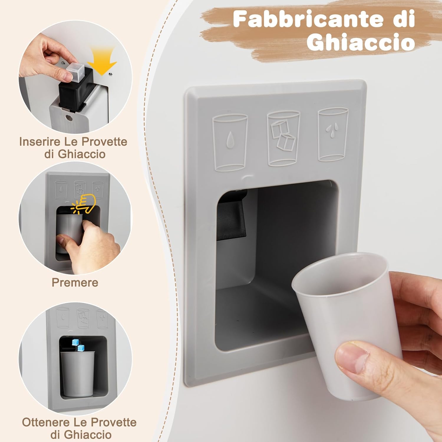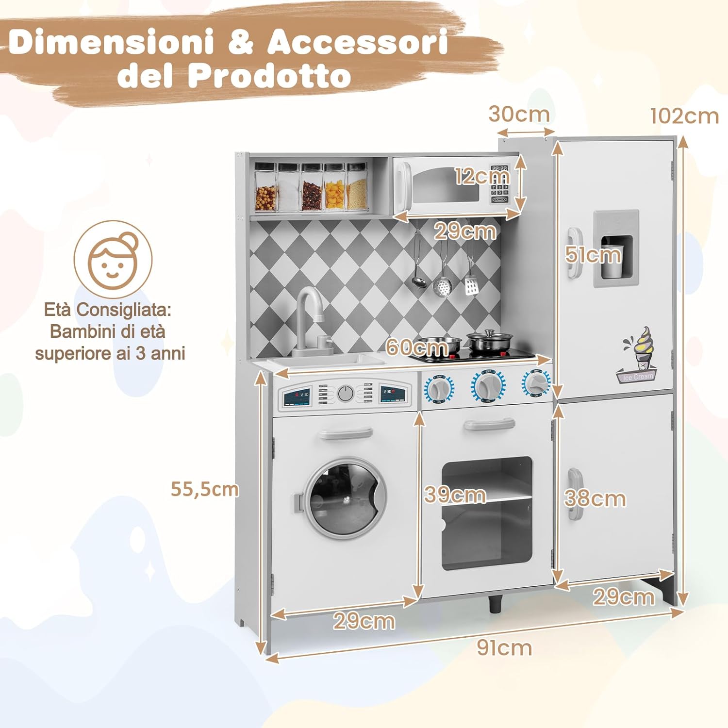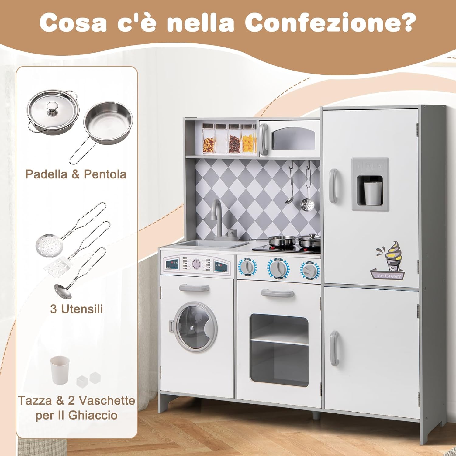 # Interazione realistica # Il fornello si illumina ed emette suoni di cottura realistici per migliorare l'esperienza di gioco dello chef (Nota: richiede 2 batterie AAA, non incluse). Inoltre, le manopole emettono suoni di scatto quando vengono girate, aumentando ulteriormente il realismo del gioco e mettendo il giocatore al centro dell'azione. # Esperienza di gioco divertente # La cucina giocattolo è dotata di lavatrice, microonde, forno, lavello e rubinetto girevole per consentire ai bambini di sperimentare diversi scenari. Il set comprende anche pentole, padelle, tazze, 2 cubetti di ghiaccio e 3 utensili da cucina per arricchire l'esperienza culinaria. # Tanto spazio per riporre gli oggetti # Con 5 armadietti, uno scomparto aperto e 3 ganci, il set da cucina per bambini offre molto spazio per libri, giocattoli, grembiuli e utensili da cucina. # Stabile e sicura # La cucina giocattolo per bambini è realizzata con materiali di alta qualità per garantire la sicurezza dei vostri piccoli. Inoltre, il set da cucina è progettato con un piede di sostegno supplementare al centro della base per garantire una maggiore stabilità. # Regalo pratico # Il set da cucina per bambini può esercitare la coordinazione occhio-mano, stimolare la creatività e migliorare le abilità sociali. Pertanto, la cucina giocattolo è un regalo ideale per i bambini dai 3 anni in su.