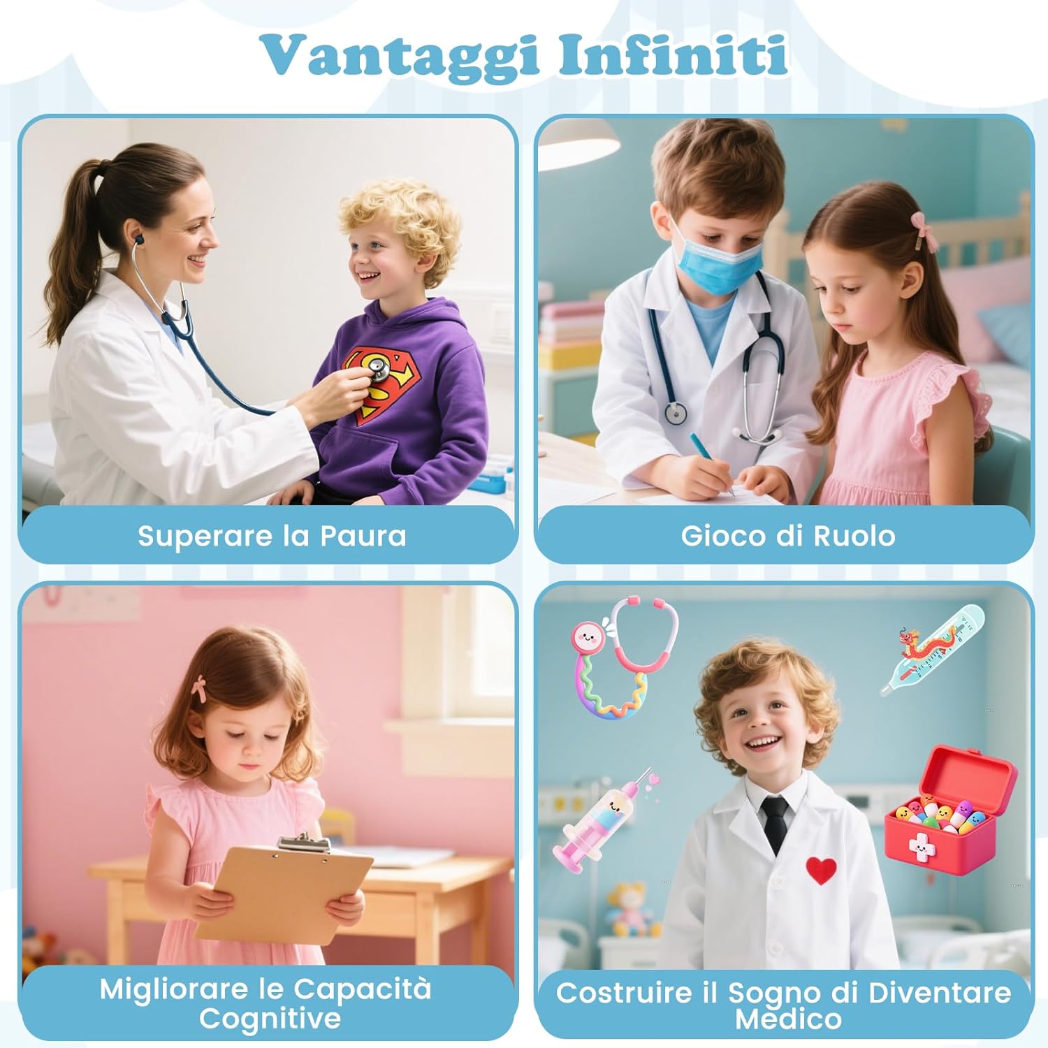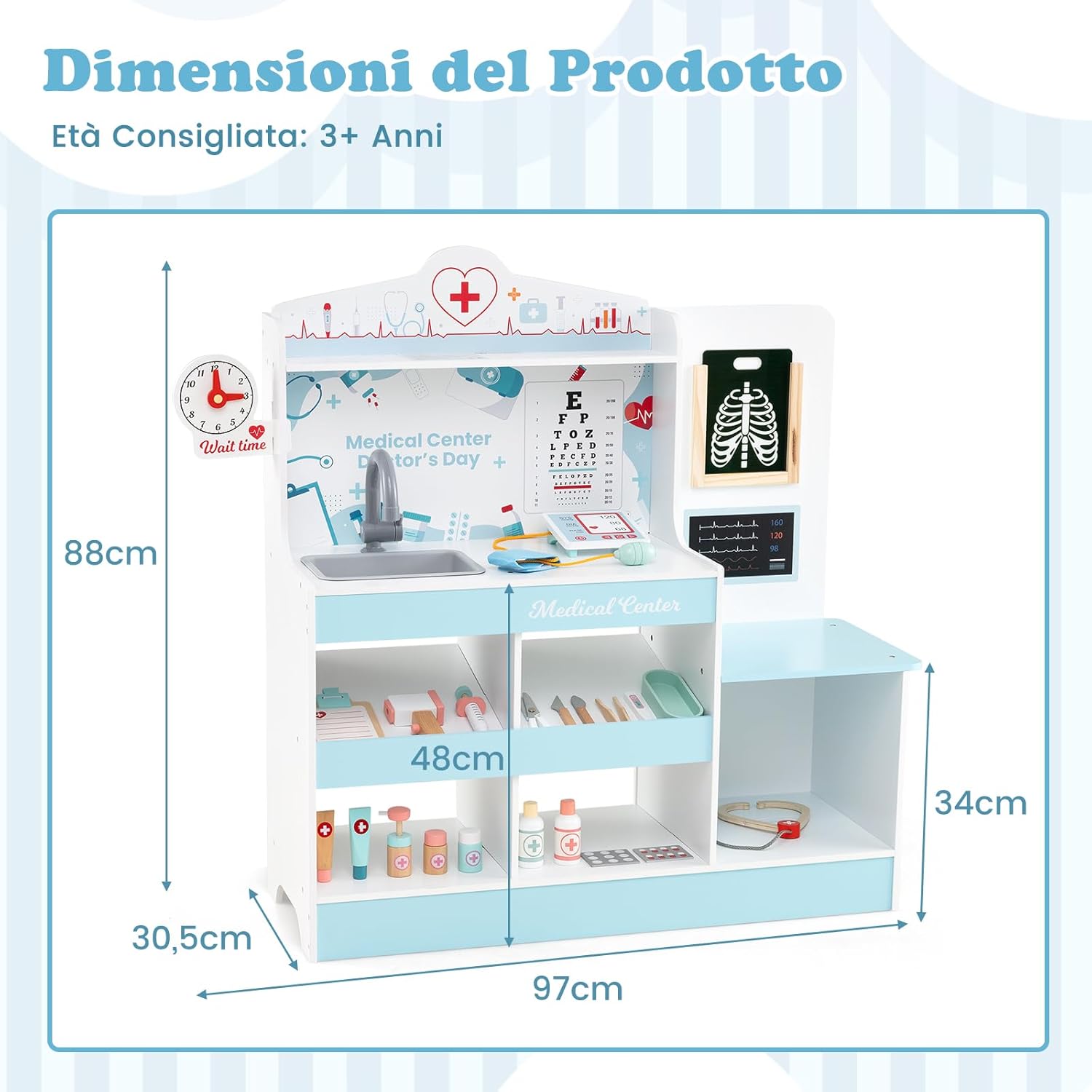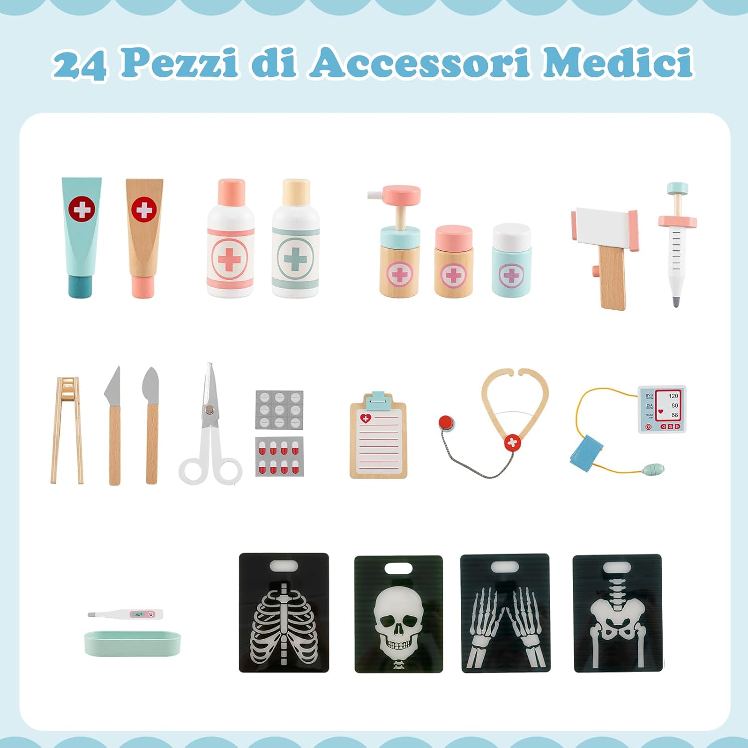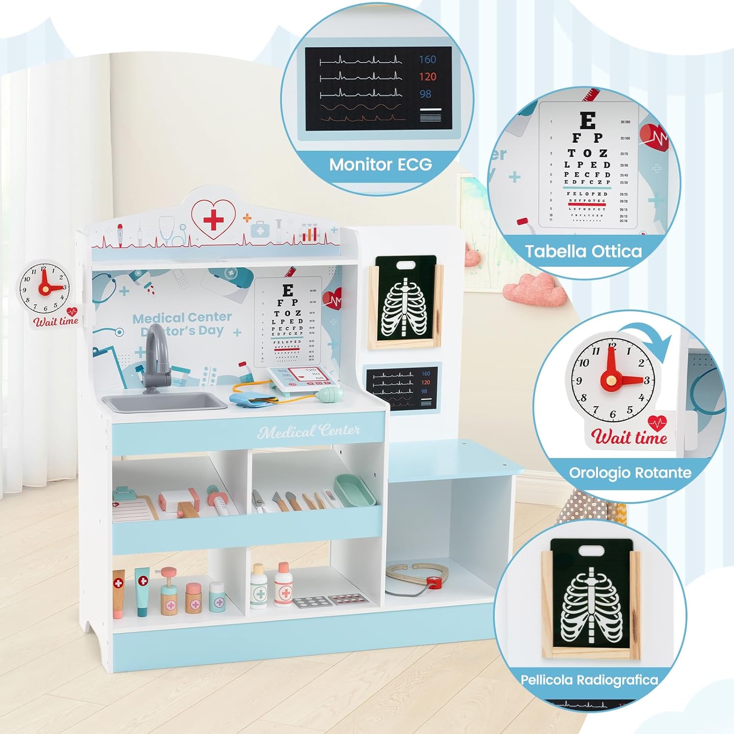 # Esperienza interattiva coinvolgente # Dalla somministrazione di farmaci e iniezioni all'esame del cuore con uno stetoscopio, questo set medico in legno consente ai bambini di comprendere i concetti medici attraverso la pratica diretta. Funzioni come la misurazione della pressione sanguigna e il monitoraggio della temperatura aggiungono ulteriore coinvolgimento. # Completamente attrezzato per stimolare l'immaginazione # Il set medico include un monitor ECG, una stazione di optometria e pellicole radiografiche per immagini mediche realistiche, oltre a un'ampia area di esame completa di rubinetti e lavandini simulati. Inoltre, 24 accessori medici arricchiscono l'esperienza di gioco di ruolo. # Soluzione di archiviazione progettata con cura # Per mantenere l'area di gioco in ordine, il set medico è dotato di un ripiano superiore, un ampio banco da lavoro, quattro scomparti aperti e un ripiano inferiore, che offrono ampio spazio per un facile accesso agli strumenti. Le guide di sicurezza integrate impediscono la caduta degli accessori. # Promuovere la crescita educativa ed emotiva # Il kit di strumenti medici aiuta a superare la paura delle strutture sanitarie, incoraggia il gioco di ruolo positivo e migliora le capacità cognitive. Ispira nei bambini grandi sogni di future carriere mediche, rendendo accessibili e divertenti concetti complessi. # Il regalo ideale per i futuri medici # Il centro attività ospedaliero è la scelta perfetta per i medici in erba dai 3 anni in su, offrendo innumerevoli ore di gioco significativo come regalo.