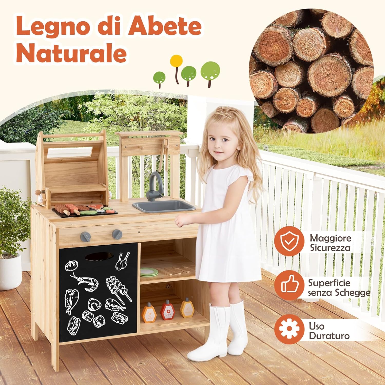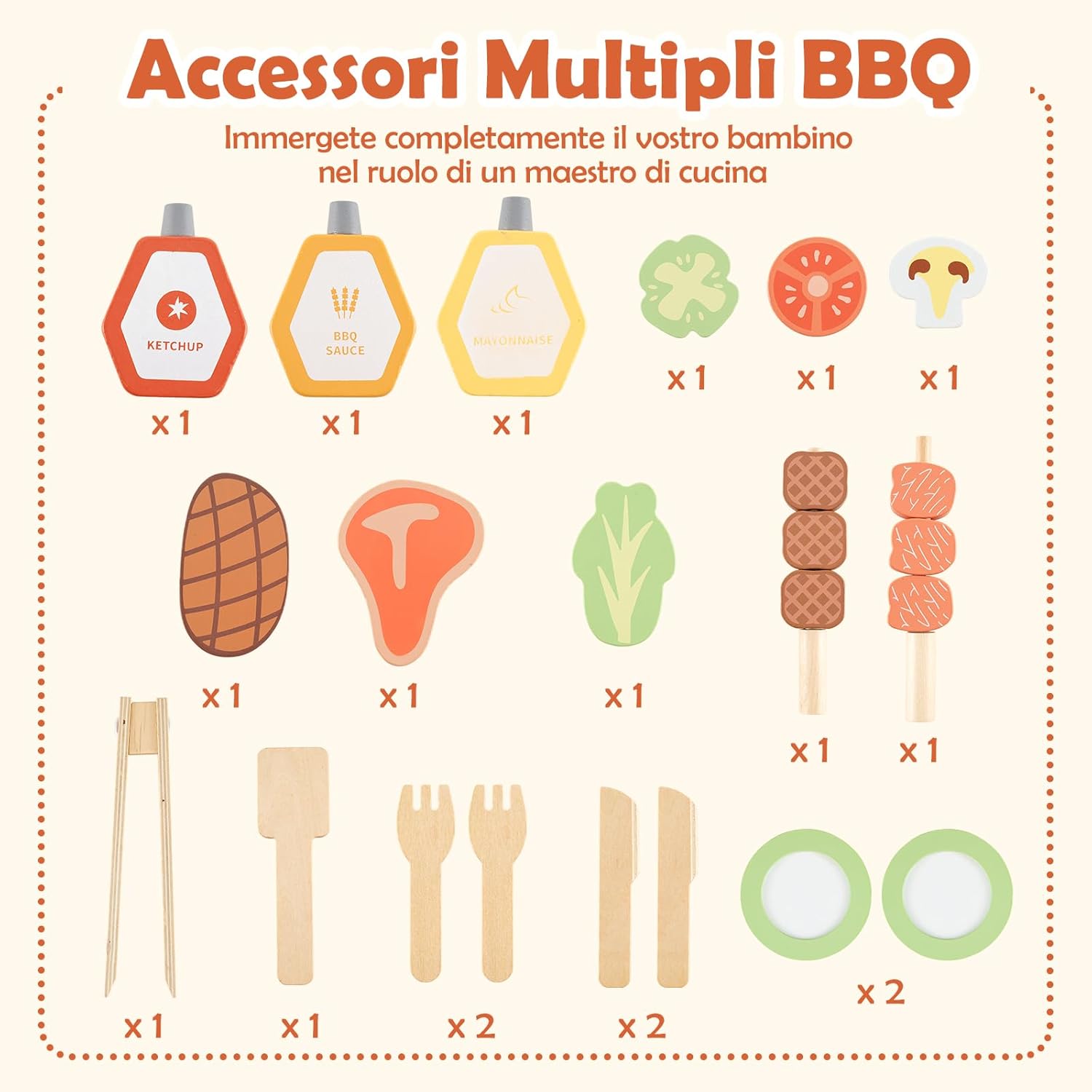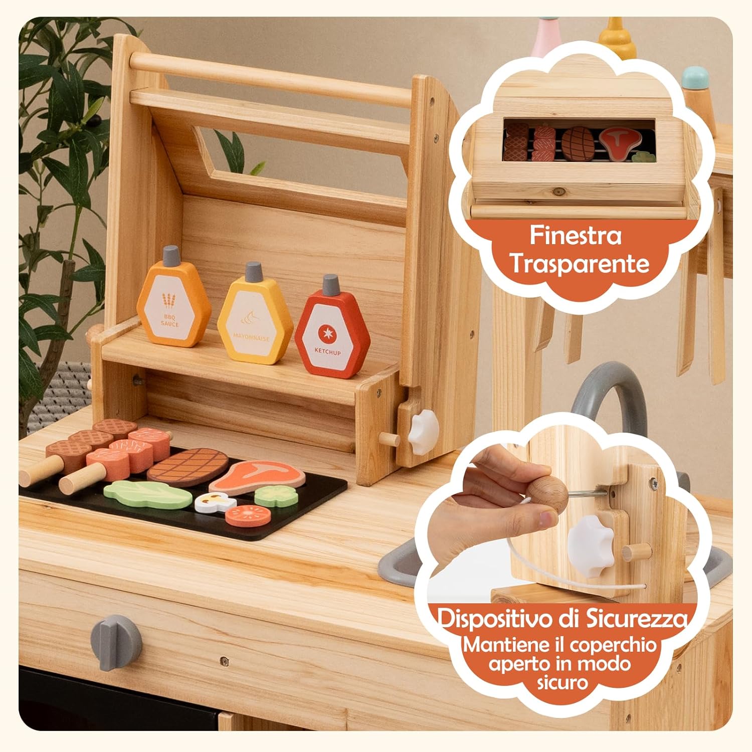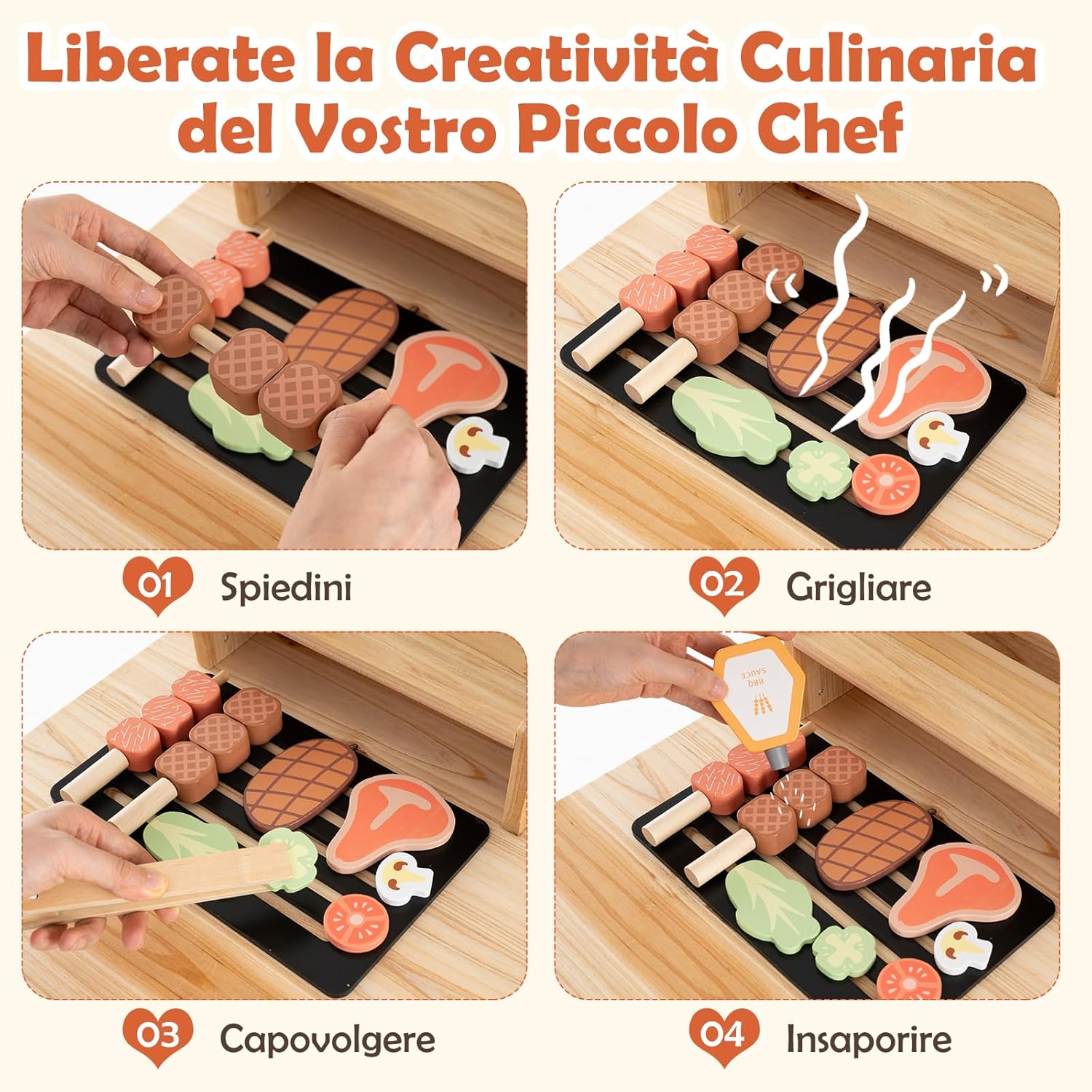 # Giochi di cucina # Questo set per barbecue è dotato di lavagna e cancellino per consentire ai piccoli chef di scrivere il menu del giorno. L'area interattiva del barbecue comprende manopole per il girarrosto, un lavandino e rubinetti realistici per consentire ai bambini di preparare e grigliare proprio come gli adulti. # L'esperienza completa del barbecue # Questo set da cucina per barbecue include 12 diversi alimenti per un'esperienza di barbecue realistica, oltre a 2 aste per spiedini, 2 strumenti perfettamente rotanti, 3 bottiglie di condimento e 6 posate per offrire un delizioso banchetto all'immaginazione. # Il regalo perfetto # Progettato per bambini dai 3 anni in su, questo set da barbecue in legno non solo diverte, ma educa, migliorando le abilità motorie fini, lo sviluppo cognitivo e le interazioni sociali durante il gioco della cucina. È perfetto per compleanni, vacanze o semplicemente come regalo. # Divertimento organizzativo senza fine # Questo set da cucina include numerose soluzioni di stoccaggio come un portaspezie, un ripiano superiore, 2 ganci per appendere gli utensili, 2 scomparti aperti per un facile accesso e un armadietto con ante per tenere tutto in ordine e nascosto. # Gioco sicuro e affidabile # Realizzata in legno robusto, questa cucina giocattolo in legno resiste alla prova del tempo e alle sollecitazioni del gioco immaginativo. Inoltre, un dispositivo di sicurezza assicura che il coperchio si apra in modo sicuro.