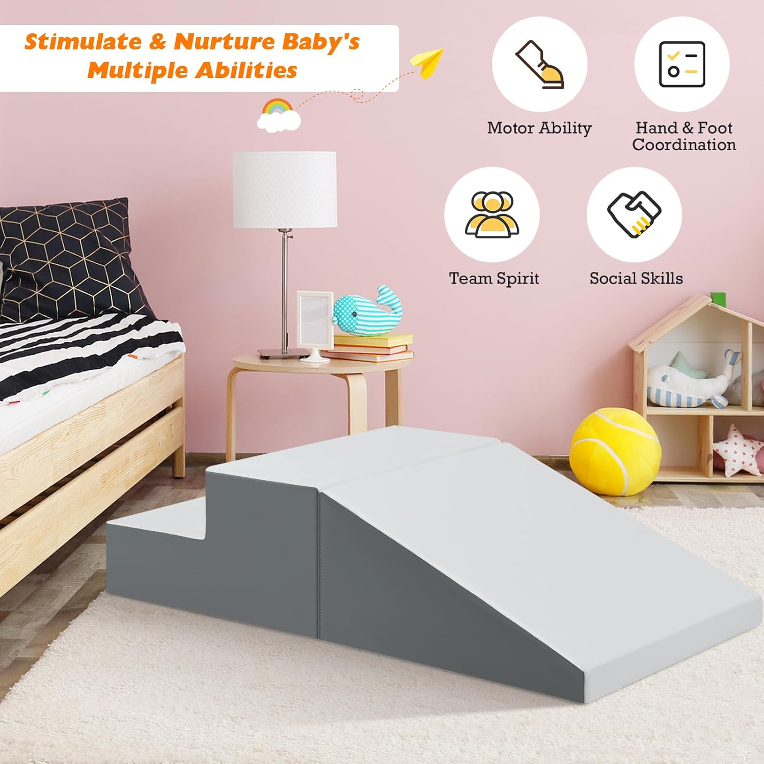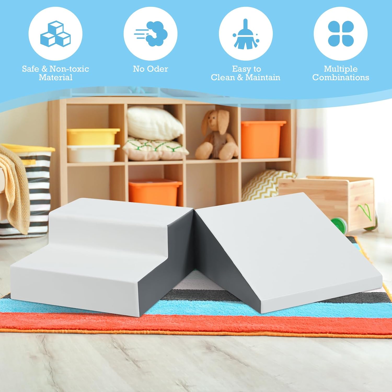 # Materiali sicuri e durevoli # I blocchi vengono rivestiti in PU atossico e inodore che non danneggiare la salute dei bambini, ed è anche un materiale resistente all’usura per prolungare la durata, in più, sono imbottiti in EPE di buona qualità per garantire un utilizzo comodo # Ampia gamma di applicazioni # Il prodotto completo è composto da 2 blocchi, uno è a forma di scaletta e l’altro è a forma di trapezio, e sono componibili e sono ideali per arrampicarsi o scivolare per bambini, ma anche sono utilizzabili come sedie. # Pulizia facile e design salvaspazio # Quando non sono in uso, i blocchi per bambini possono essere impilati per non occupare troppo spazio, tra l’altro, grazie alla superficie liscia e impermeabile si possono pulire facilmente e comodamente con un panno morbido # Lavorazioni accurate # Grazie alla lavorazione accurata, i mattoncini non sono facili da smontare. Inoltre, il design antiscivolo può evitare la caduta eventuale dei bambini, e grazie alle dimensioni adeguate e al peso leggero, si possono spostare facilmente da una parte all’altra. # Giocattolo ideale per i bambini # I blocchi morbidi colorati possono migliorare la percezione e il riconoscimento dei colori dei bambini e sono favorevoli a aumentare la coordinazione occhio-mano e le capacità atletiche dei bambini. Inoltre ha i colori vivaci che piaceranno ai bambini.