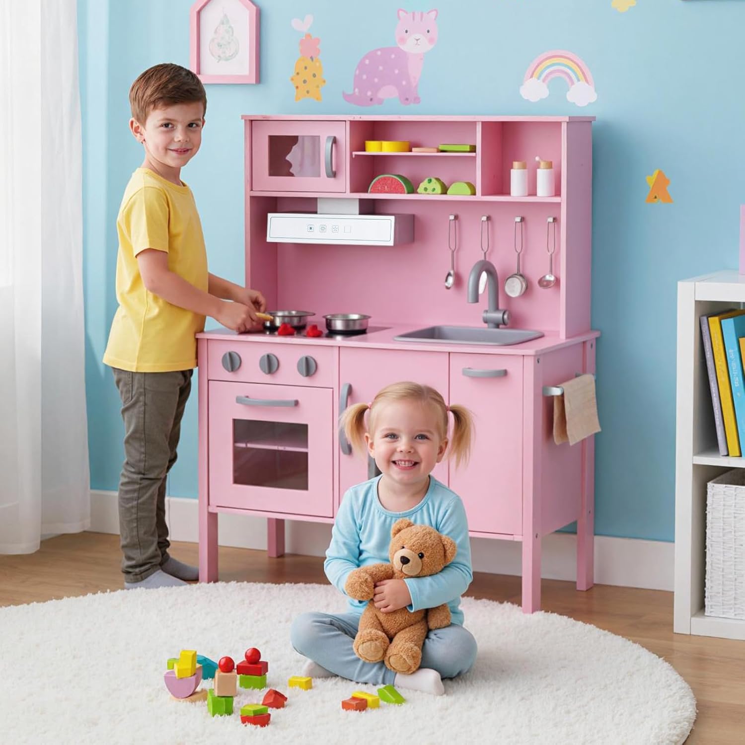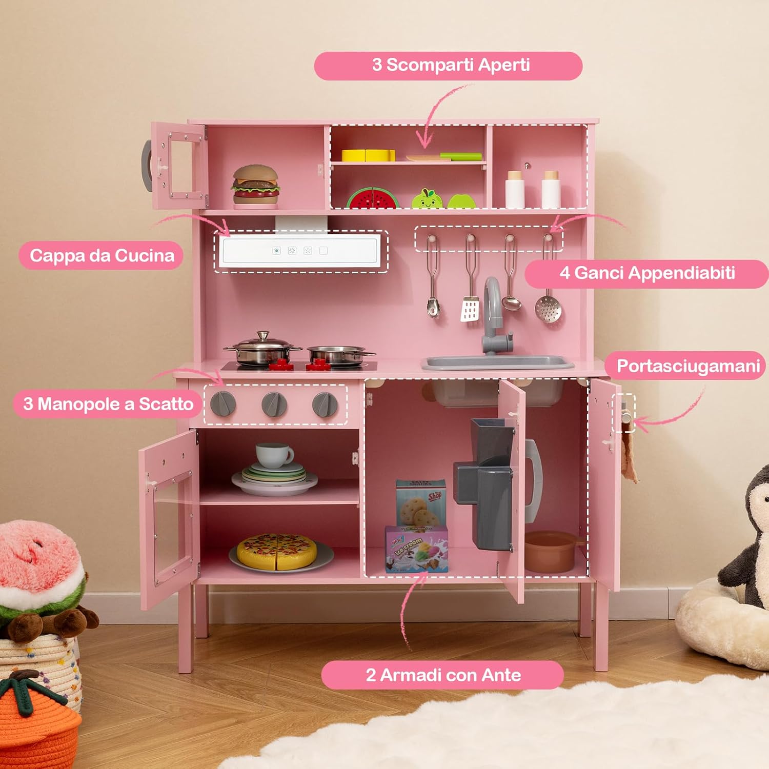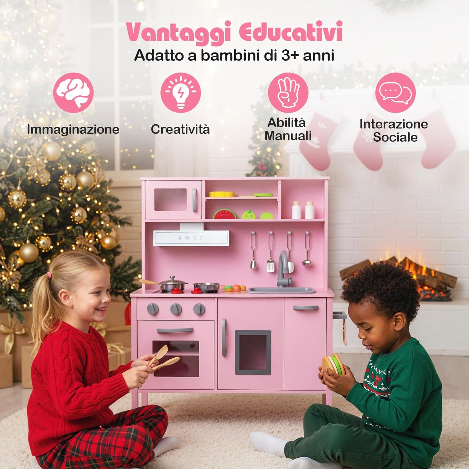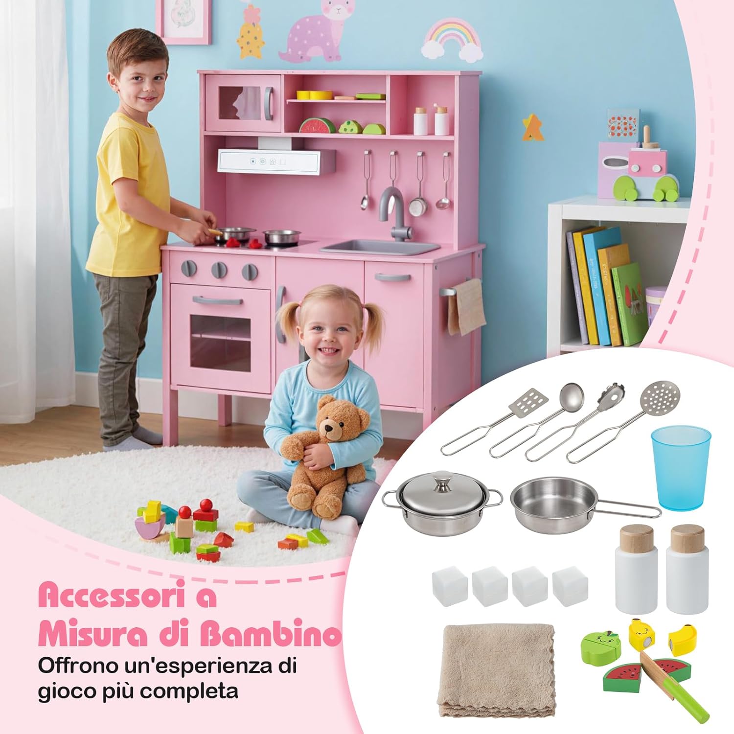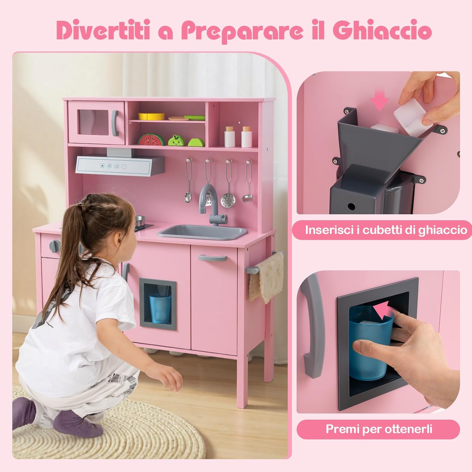# Grande spazio di archiviazione # Il nostro set di imitazione della cucina è progettato con un armadietto superiore e uno inferiore. Sono la soluzione perfetta per riporre gli oggetti dei bambini e renderli facilmente accessibili. Inoltre, ogni armadietto ha 3 scomparti per riporre ingredienti e utensili di diverse dimensioni. # Completo di accessori # Il nostro set di giocattoli da cucina per bambini è dotato di molti accessori, tra cui 1 pentola, 1 padella, 4 cubetti di ghiaccio, 1 tazza, 2 barattoli di spezie, 3 cucchiai, 1 spatola, 1 tappetino, 1 coltello di legno e frutta tagliata, che lo rendono ancora più divertente per i bambini. # Sicurezza dei bambini # Il dispositivo antiribaltamento sul retro riduce il rischio di ribaltamento e gli spigoli arrotondati prevengono efficacemente le lesioni in caso di urto. Le pratiche maniglie facilitano l'apertura degli scomparti e i 4 solidi piedi in legno garantiscono un'elevata stabilità. # Esperienza di cucina realistica # Il nostro set giocattolo di cucina per bambini adotta l'aspetto reale di una vera cucina con lavello rimovibile, fornello a gas simulato, cappa aspirante, microonde, piano cottura e macchina del ghiaccio. Questi elettrodomestici realistici offrono una migliore esperienza di cucina per i bambini. Questi elettrodomestici realistici offrono una migliore esperienza di cucina per i bambini. # Regalo ideale per i bambini # Il nostro gioco di imitazione della cucina è adatto ai bambini dai 3 ai 6 anni. Non solo aiuta a incoraggiare l'interazione genitori-figli, ma sviluppa anche le abilità sociali dei bambini, la coordinazione occhio-mano, l'immaginazione e la creatività. Questo prodotto sarà un regalo ideale e fornirà indubbiamente dei ricordi memorabili.