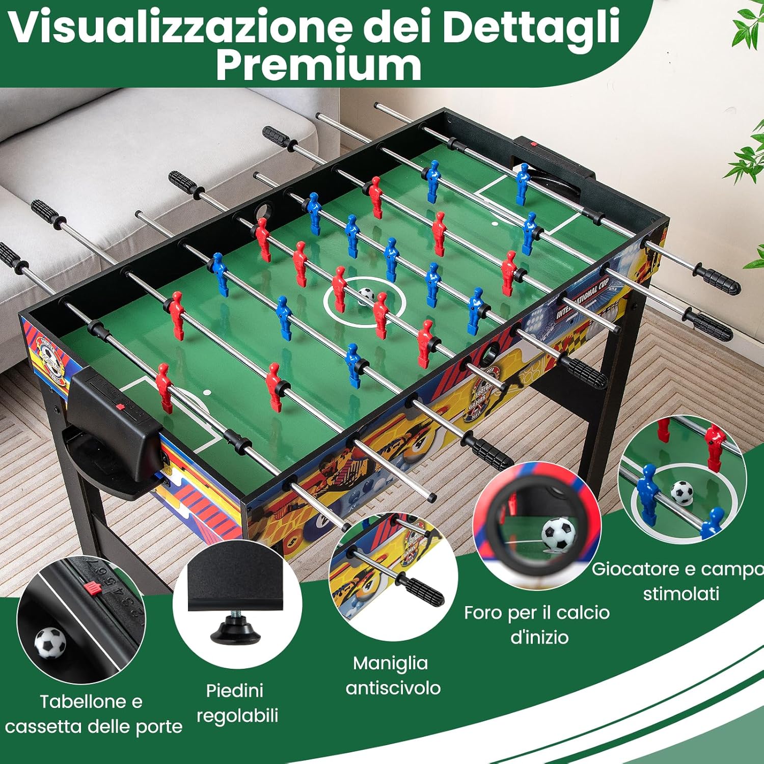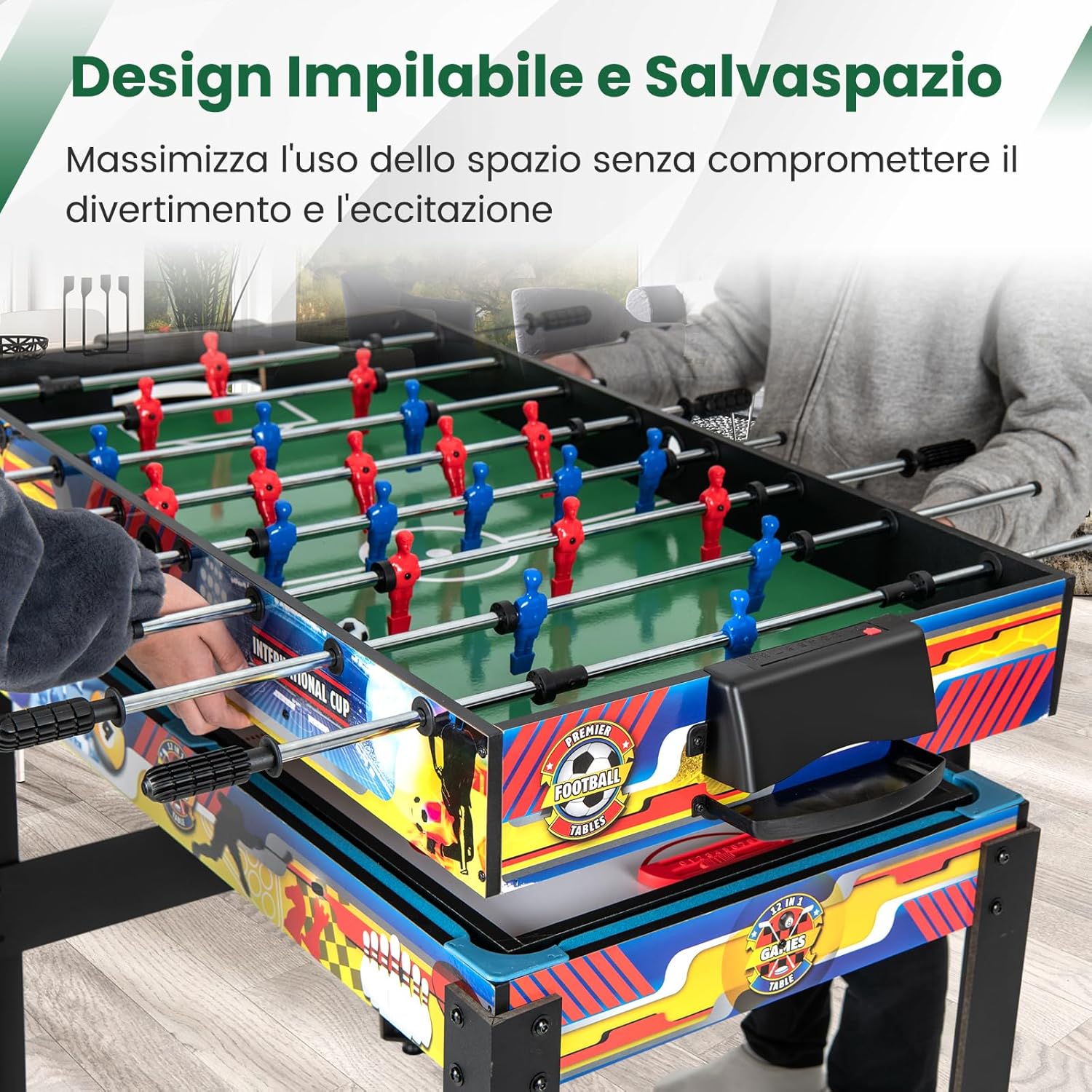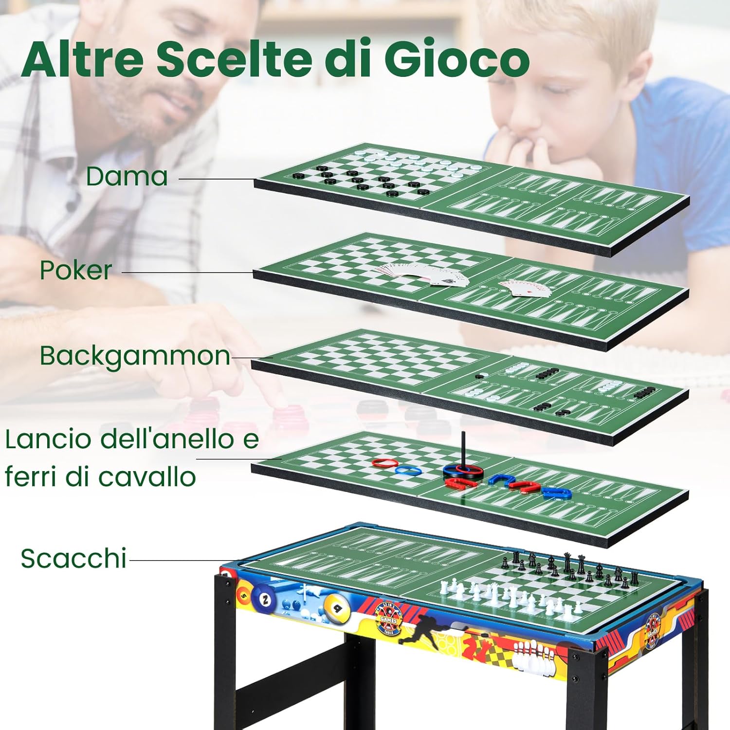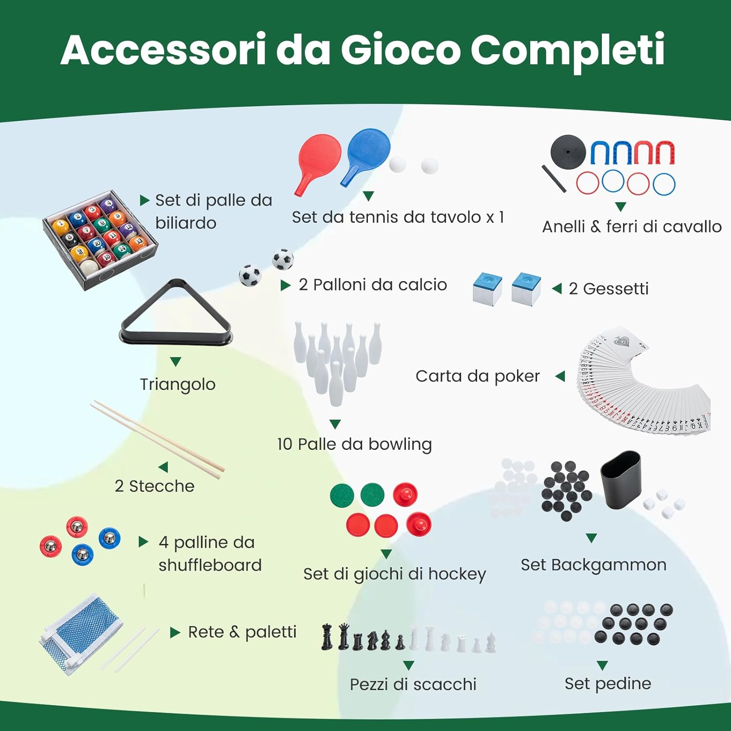 # Tavolo da gioco 12-in-1 # Vivi un divertimento infinito con questo tavolo da gioco 12-in-1 che offre una vasta gamma di opzioni di gioco emozionanti in uno, tra cui calcetto, biliardo, ping pong, hockey, bowling, shuffleboard, poker, backgammon, dama, scacchi, lancio dell'anello e ferr horseshoes. Perfetto per riunioni in famiglia e con amici, crea ricordi duraturi mentre ti godi questo set di gioco insieme. # Facile da convertire e design impilabile che risparmia spazio # Passa facilmente tra 6 giochi di palla o qualsiasi ulteriore scelta di gioco con la comoda funzione di conversione, questo tavolo può trasformarsi nella modalità di gioco desiderata in pochi minuti. Inoltre, il suo design impilabile massimizza l'uso del tuo spazio senza compromettere il divertimento ed l'emozione. # Robusta costruzione del tavolo # Realizzato con materiali di alta qualità per garantire una durata duratura, questo tavolo da gioco è costruito con una struttura stabile per una maggiore stabilità. Inoltre, i piedini regolabili assicurano un'esperienza di gioco stabile senza oscillazioni. # Dettagli premium per un'esperienza di gioco ultimata # Progettato per un gameplay piacevole, il nostro tavolo da gioco presenta maniglie antiscivolo complete di buche per un'esperienza di gioco senza soluzione di continuità e piacevole. Inoltre, il design simulato di giocatori e campo e il punteggio con la scatola del goal migliorano ulteriormente l'esperienza di gioco e aggiungono un tocco autentico ad ogni partita. # Accessori completi per il gioco # Tutti gli accessori per giocare ai 12 giochi sono inclusi con questo tavolo, tra cui set di palline da biliardo, triangolo, 2 steccche, 2 gessi, 4 shuffleboard, rete e pali, set da ping pong, 2 palloni da calcio, 10 bowling, carte da poker, set da hockey, pezzi degli scacchi, set da dama, anelli e ferri di cavallo, set da backgammon.