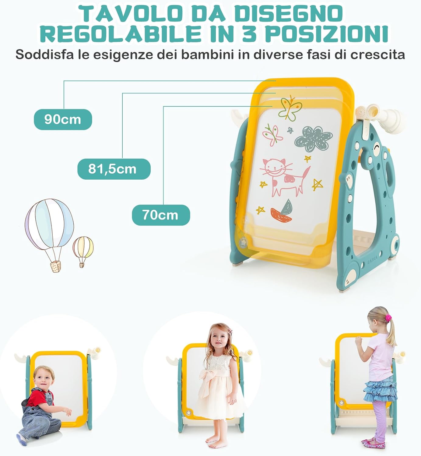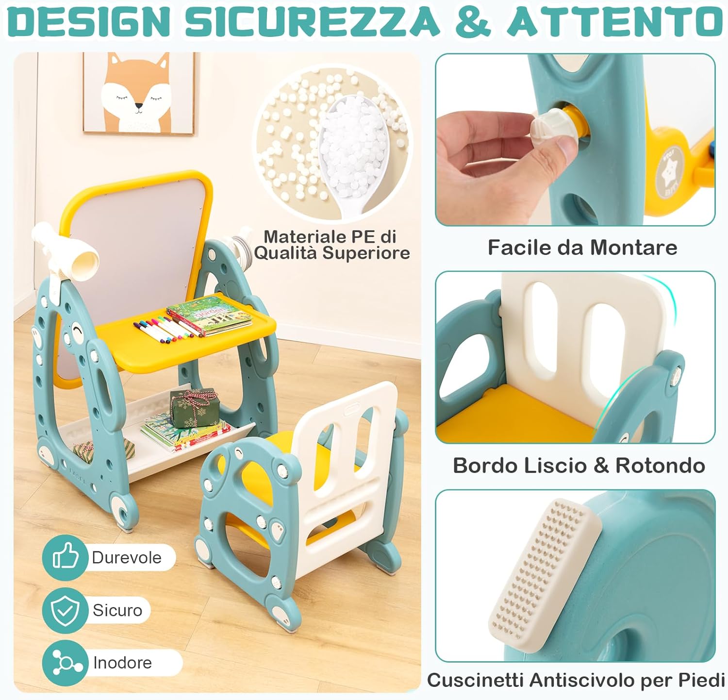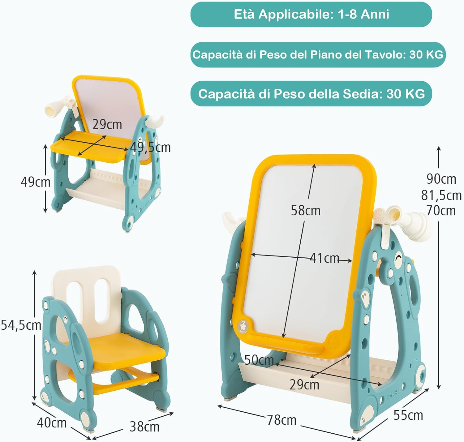 # Set tavolo e sedia multifunzionale # Progettato con una lavagna magnetica anteriore e un grande tavolo posteriore per varie attività come disegnare, scrivere o mangiare, il set tavolo e sedia con cavalletto sarà una scelta regalo perfetta per bambini dai 1 agli 8 anni. Inoltre, il telescopio regolabile e il gioco dell'anello aggiungeranno divertimento. # Lavagna regolabile in altezza # Con 3 posizioni regolabili da 70 cm, 81,5 cm a 90 cm, la lavagna può soddisfare le esigenze dei bambini in diverse fasi di crescita, accompagnandoli nel loro sviluppo. (Nota: si prega di rimuovere la pellicola protettiva sulla lavagna prima dell'uso.) # Sedia ergonomica con schienale # La sedia, progettata ergonomicamente con schienale e un'altezza di seduta adeguata di 26,5 cm, aiuta i bambini a coltivare buone posture sedute fin dalla giovane età. Con un eccellente supporto per la schiena, per le anche e per le braccia, i bambini si sentiranno comodi mentre sono seduti. È una bella soluzione di seduta per vari ambienti come camere da letto, asili nido e scuole dell'infanzia. # Accessori ricchi e aree di stoccaggio # Forniamo accessori utili tra cui 1 lavagna cancellabile a secco, 8 pennarelli, 3 anelli e 2 magneti, per portare divertimento aggiuntivo al tuo piccolo e ispirare la loro immaginazione e creatività. Oltre a ciò, c'è uno scomparto pratico per mantenere i pennarelli a portata di mano e un vassoio portaoggetti inferiore per riporre libri, materiali artistici e altri essenziali. # Design sicuro e montaggio facile # Realizzato in materiale PE di alta qualità, il cavalletto per bambini è sicuro per l'uso. I bordi lisci e arrotondati non graffiano la delicata pelle dei bambini. E i piedini antiscivolo aumentano ulteriormente la stabilità. Con chiare istruzioni illustrate, il montaggio sarà un gioco da ragazzi, risparmiando tempo ed energia.