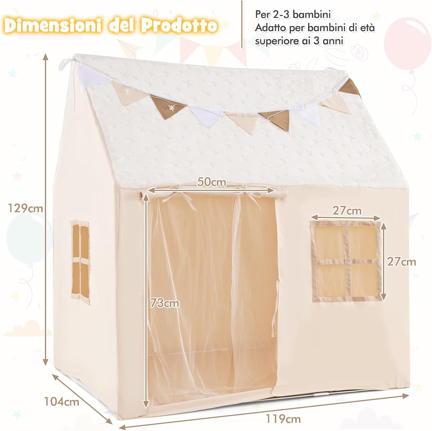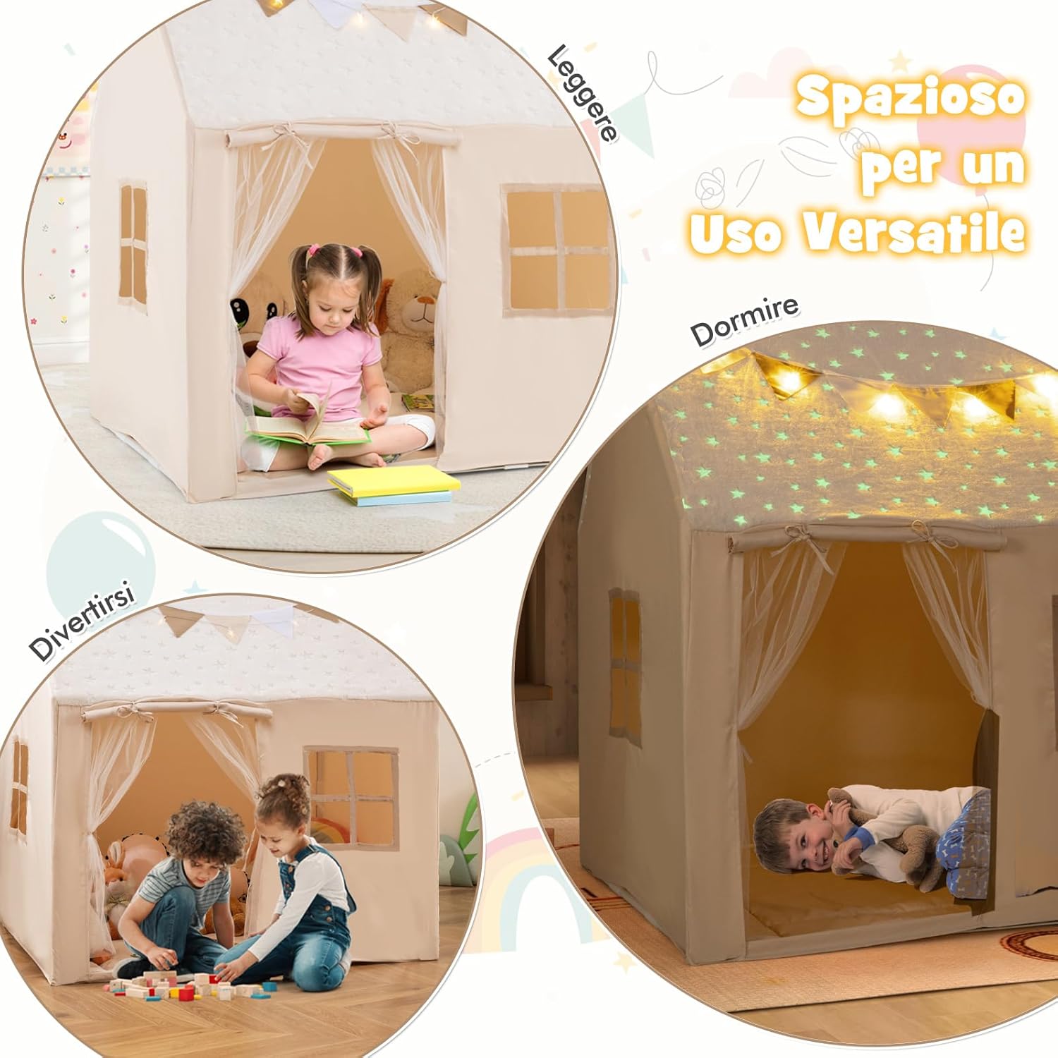 # Gioco magico di notte # Il tessuto fosforescente e la ghirlanda luminosa integrati nella grande tenda da gioco possono illuminare il mondo del bambino in modo magico. Inoltre, offre una vista incantevole e trasforma il gioco in un'esperienza da favola. # Due modi per aprire # I lacci mantengono le tende ordinate ed eleganti, mentre le cinghie di fissaggio tengono in posizione le porte scorrevoli. Grazie a queste caratteristiche, la tenda da gioco per bambini è facile da entrare e uscire, pur mantenendo un aspetto ordinato e attraente. # Struttura robusta e facile installazione # Questa tenda da gioco per bambini è costruita con robusti pali in PVC e connettori sicuri per garantire durata e stabilità. È inoltre dotata di un design facile da montare per trasformarla rapidamente in un'avventura all'aperto o in un rifugio al chiuso. # Spazio di gioco spazioso # In grado di ospitare comodamente da 2 a 3 bambini, o anche un adulto, questa tenda da gioco portatile offre molto spazio per incoraggiare il gioco sociale e la creatività. È anche ideale per leggere, giocare o semplicemente rilassarsi, rendendola un'aggiunta versatile a qualsiasi stanza. # Divertimento con attenzione ai dettagli # Il castello per bambini è decorato con bandiere colorate per creare un'atmosfera festosa e dispone di 2 finestre di ventilazione per garantire la circolazione dell'aria. Inoltre, l'imbottitura rimovibile offre un maggiore comfort ed è di facile manutenzione.