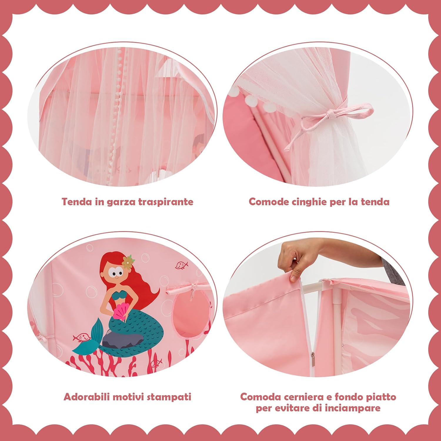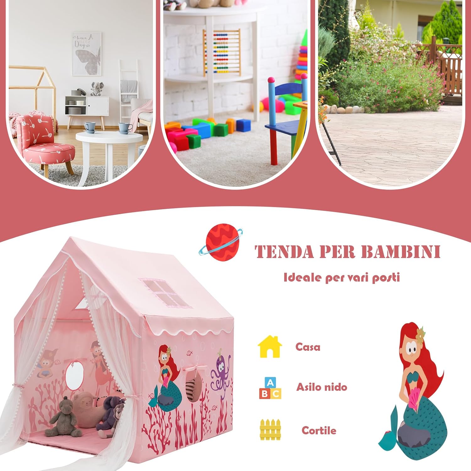 # Il paradiso dei bambini # La nostra tenda per bambini, con la forma di una casetta e un'adorabile flora e fauna stampata sul lato, è così carina. È una tenda bella e calda che sarà il parco giochi dei bambini fin dalla più tenera età e svilupperà notevolmente le capacità di gioco indipendente. # Molteplici applicazioni # Questa tenda può essere collocata nella camera da letto o nel soggiorno dei bambini, ma è anche adatta a parchi giochi interni, asili e altri luoghi. Ha un ampio spazio dove i bambini e gli amici possono giocare, imparare o semplicemente rilassarsi. # Design unico # Questa tenda per bambini è strutturalmente stabile. Inoltre, la tenda da gioco è molto facile da smontare e riporre e non occupa molto spazio. I robusti tubi in PVC conferiscono alla tenda una struttura solida e rendono più sicuro il gioco dei bambini. # Dettagli piacevoli # Realizzata in tessuto traspirante di poliestere-cotone con finestre, i bambini non si sentiranno stretti nella tenda. I cuscini in PP sono confortevoli e possono essere rimossi per il lavaggio. C'è anche una garza per evitare le punture di zanzara. # Regalo ideale # Questo sarà senza dubbio il regalo di compleanno o di Natale più soddisfacente che il vostro bambino possa ricevere. Un piccolo mondo così bello e affascinante rende il mondo più interessante per il bambino fin dalla più tenera età. Nella tenda si può anche leggere, giocare e trascorrere del tempo di qualità con il bambino.