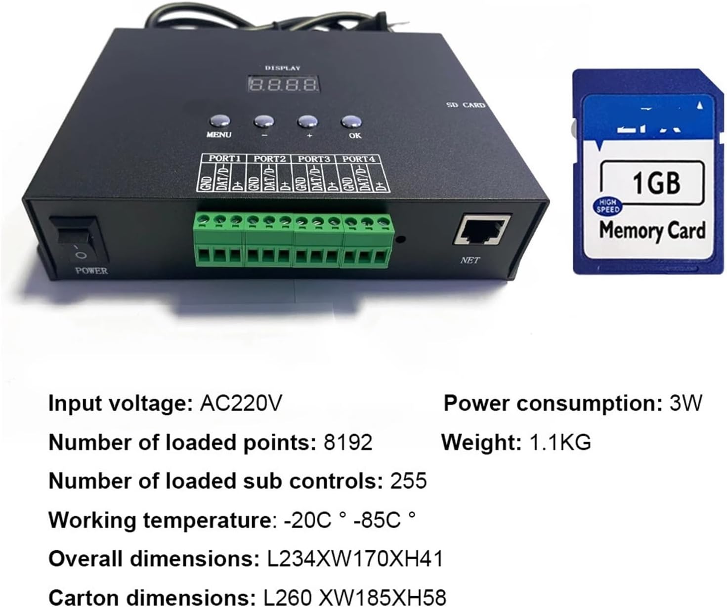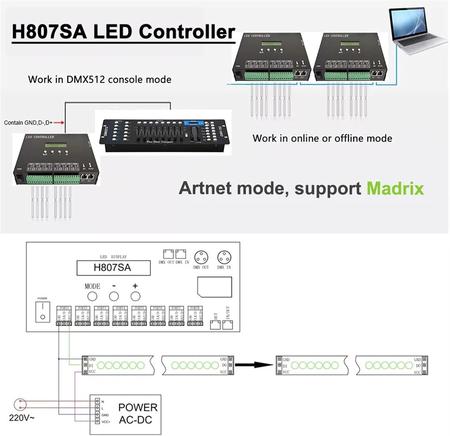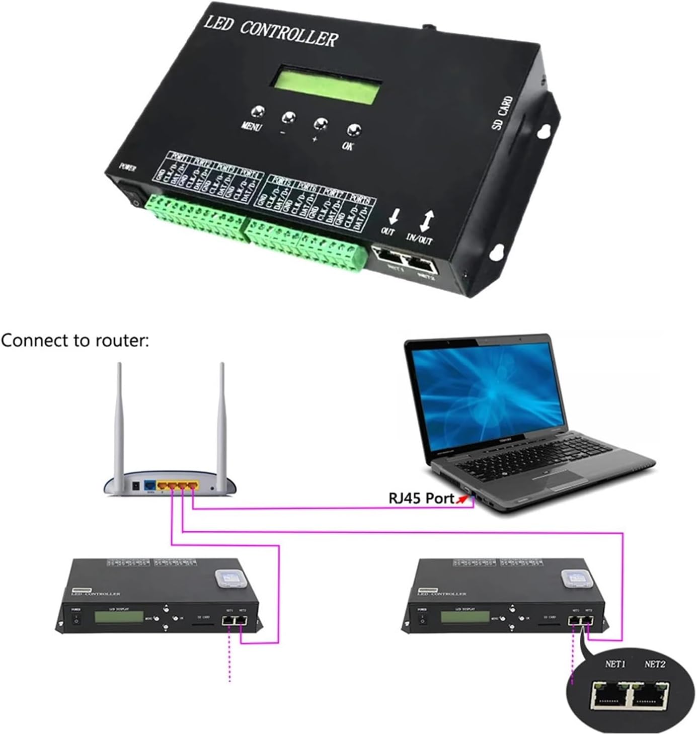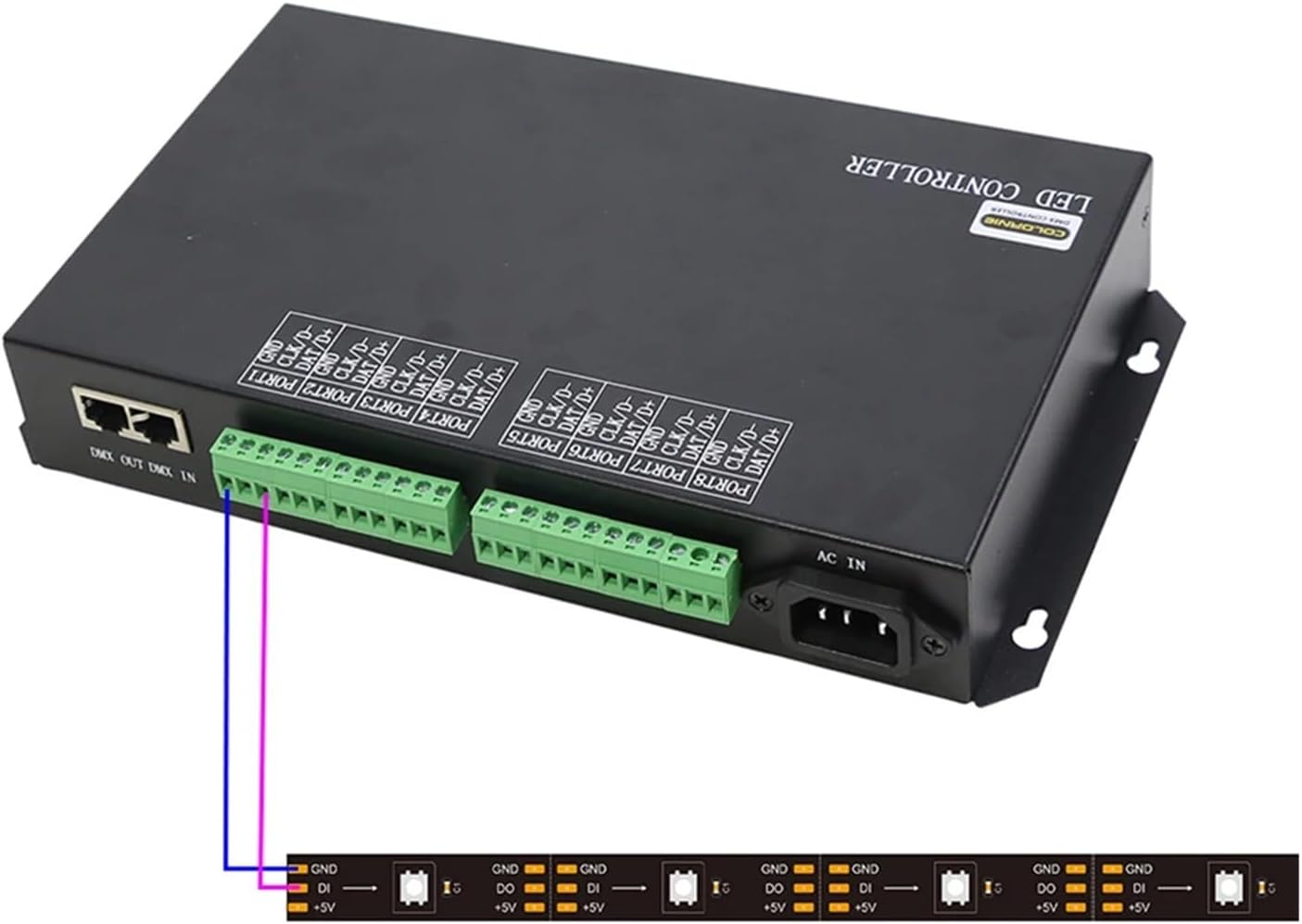 Lampade e illuminazioni caratteristica 1: Ciascun sottocontrollo può controllare 8192 punti, 8 porte di uscita e ciascun punto di controllo non supera 1024 punti. 2: Sottocontrollo e cascata sottocontrollo, la linea della cascata è lunga fino a 100 metri. 3: trasmissione del protocollo Ethernet, supporta ARTNET, protocollo UDP, compatibile con madrix, jinx, ecc. 4: Quando si utilizza la funzione ART-NET, ciascuna porta può supportare un massimo di 680 pixel. 5: Collegabile e staccabile, può essere collegato direttamente alla scheda di rete del computer, al router o al controller principale supporto DMX512,HDMX,DMX512_RDM,APA102,APA102-65536,WS2801,WS2811,ws28.12,WS2813,TM1812,TM1809,TM1804,TM1923,TM1934,TM1925D,TM1926D,TM1803,tm181 4,TM19 1 3. TM1914, TM1926, UCSUCS1903 , UCS1909,ucs1 912,UCS2903,uces2909,uce5603,SK9816,SK6812,SM16716,SM16703,SM16709,SM16712,sm16713 16704,LPD6803,LPD8806,LPD1882,LPD1889,LPD1 8 83, INK10 03, APA104, P943, LC8812, GW6205, QED3110 , D9866E, D9866B,D9865C,d9855e,d985f,D9864B,D9864C